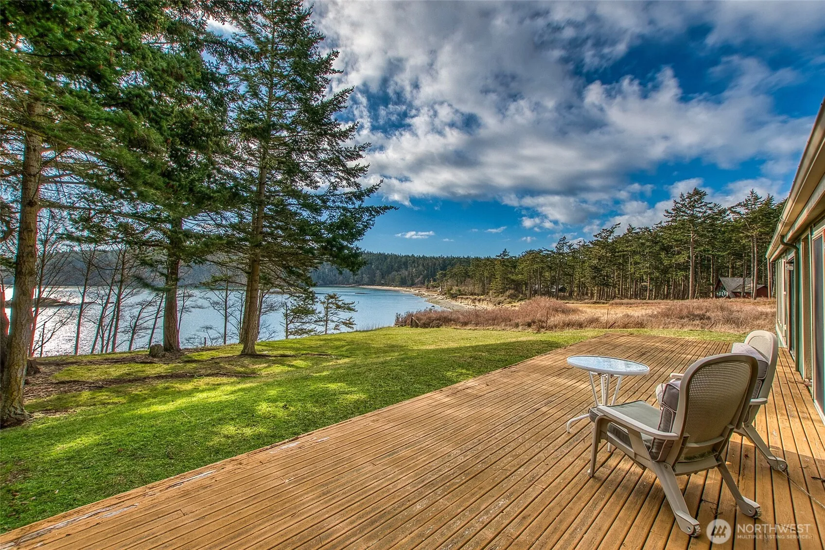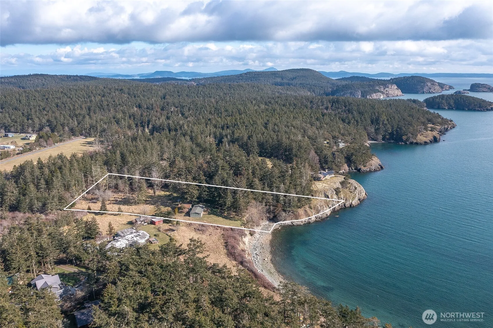 Stunning Lopez Island waterfront acreage in a quiet south end location on Aleck Bay. Gently sloping 3.6 acres with accessible beach & expansive views from the southwest to the southeast. Mature evergreens frame the curve of the bay w/ over 300 feet of water frontage. 1985 Fleetwood manufactured home w/ 1500 sf, 2 bedrms/2 baths plus den/office space. Primary bedrm w/ walk-in closet. Spacious kitchen w/ skylights & separate dining area. The detached 2 car garage has an insulated shop. Separate boat shed. Fenced kitchen garden. Enjoy the property as is or plan for your future dream home. Feasibility study available to the buyer on request. MacKaye Harbor Water, private septic, fiber nearby. The land has been in the sellers’ family since 1985.