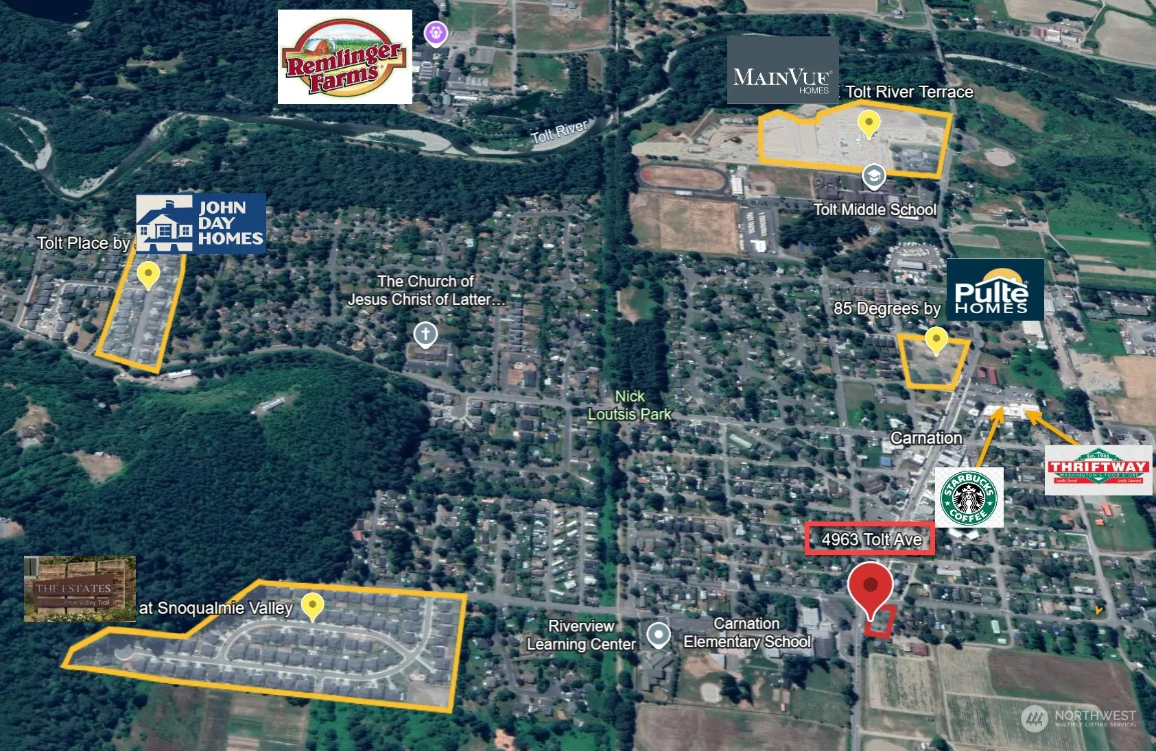 Extremely rare 9-unit multifamily + 1-retail commercial land development opportunity in high demand & growing City of Carnation. In a highly desirable and visible location right in the heart of Downtown Carnation. Two 3-bed townhomes, along w/ mix of studio/1-bed/2-bed units. A 1/3 of acre flat corner lot zoned MU commercial to develop in growing market. Located on the main hwy 203, a perfect location to develop much needed retail commercial along with residential. Immediate income from a 1.3K sf SFR while attaining permitting. New single-family communities under construction priced in the $1.2-$1.5M’s. Under 30 minutes from Microsoft, Google, big tech. Get in early with this fast-developing community. Ask for details of massing study.