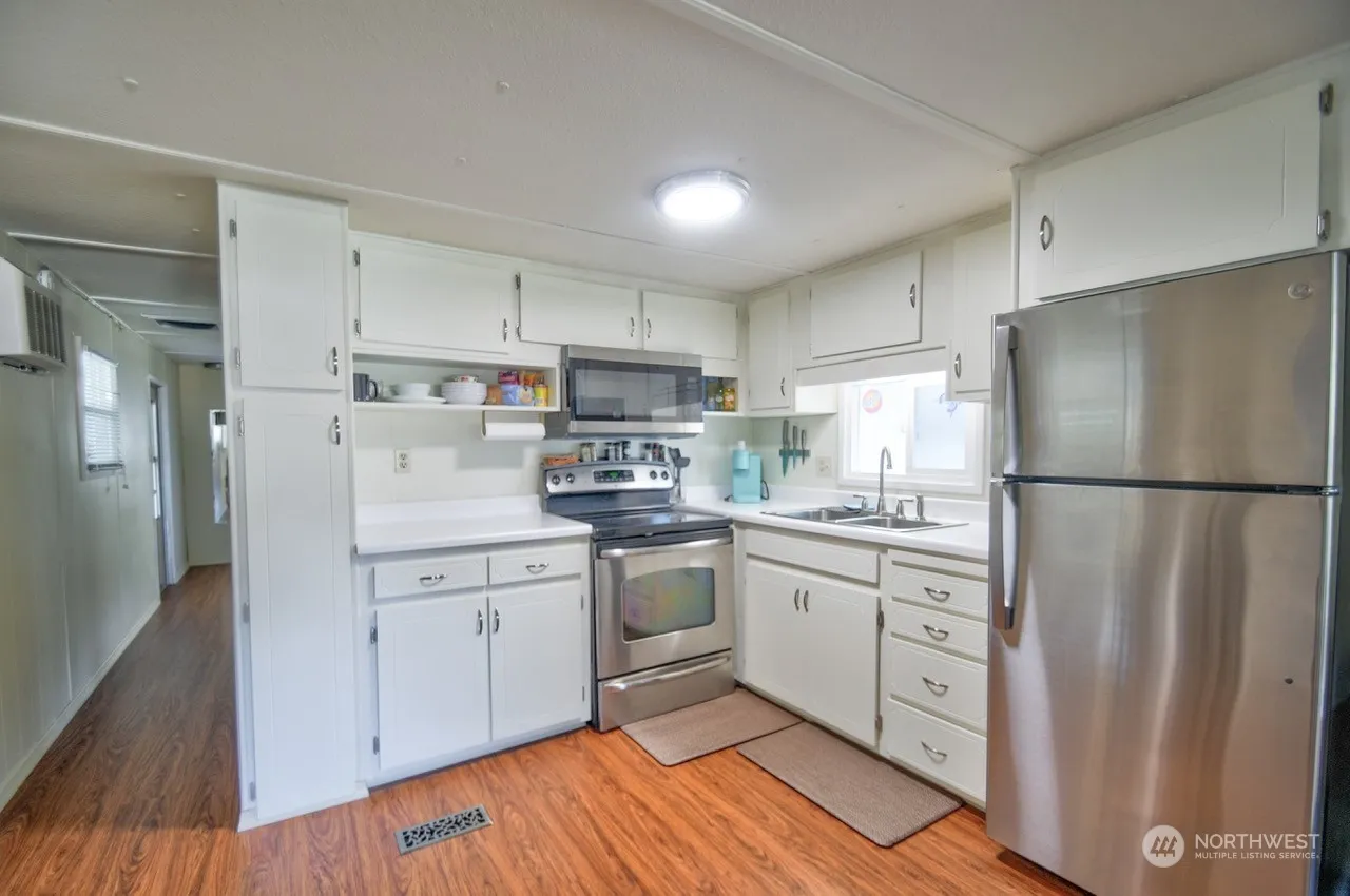 Very Affordable home in 55+ Sought after community in Tumwater Home is in Great condition. beautiful 2 bed 1 bath home is sitting on nice large lot. Garage recently Re-roofed, Brand New shower installed as well as Toilet and sink, Brand new washer and dryer, Wider front door installed, New kitchen sink and faucet along with new refrigerator Brand new flooring all throughout home with a new ceiling fan. Fresh paint throughout and new bright lighting This home is ready for its new owner. Community has a clubhouse and is conveniently across the street from your spacious corner lot.