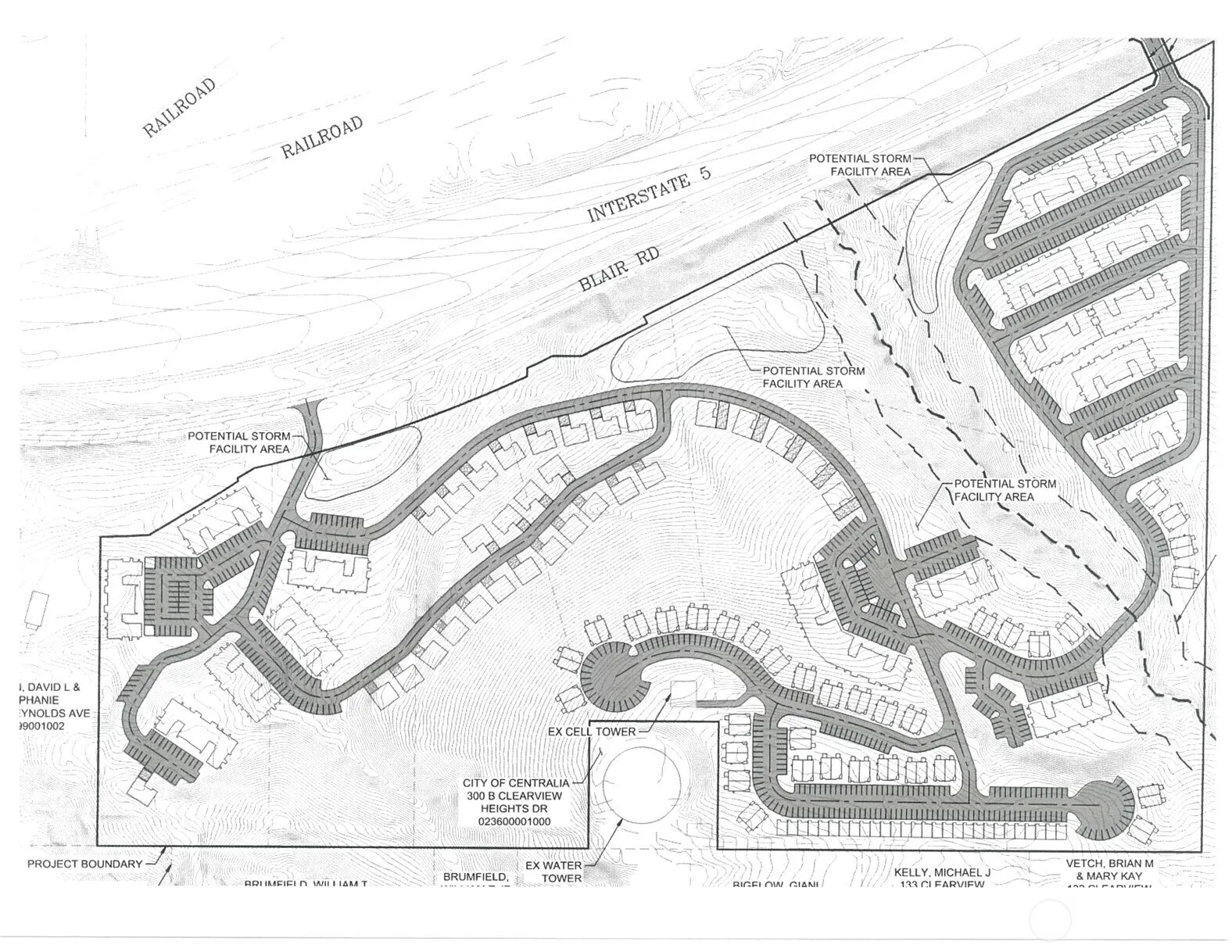 Attention Developers! Property is currently being Annexed into the Centralia City Limits. A Rare Opportunity to obtain 50.77 acres in Centralia Urban Growth Area with mixed residential density from R5A to High Density R15 and some Limited Business District uses. Huge development potential of 300 + doors. Upper parcels have some incredible views! Lots of road, drainage, and groundwork completed. 3 Drilled wells on site. Minutes from freeway, factory outlets and shopping. Location, Location, Location!