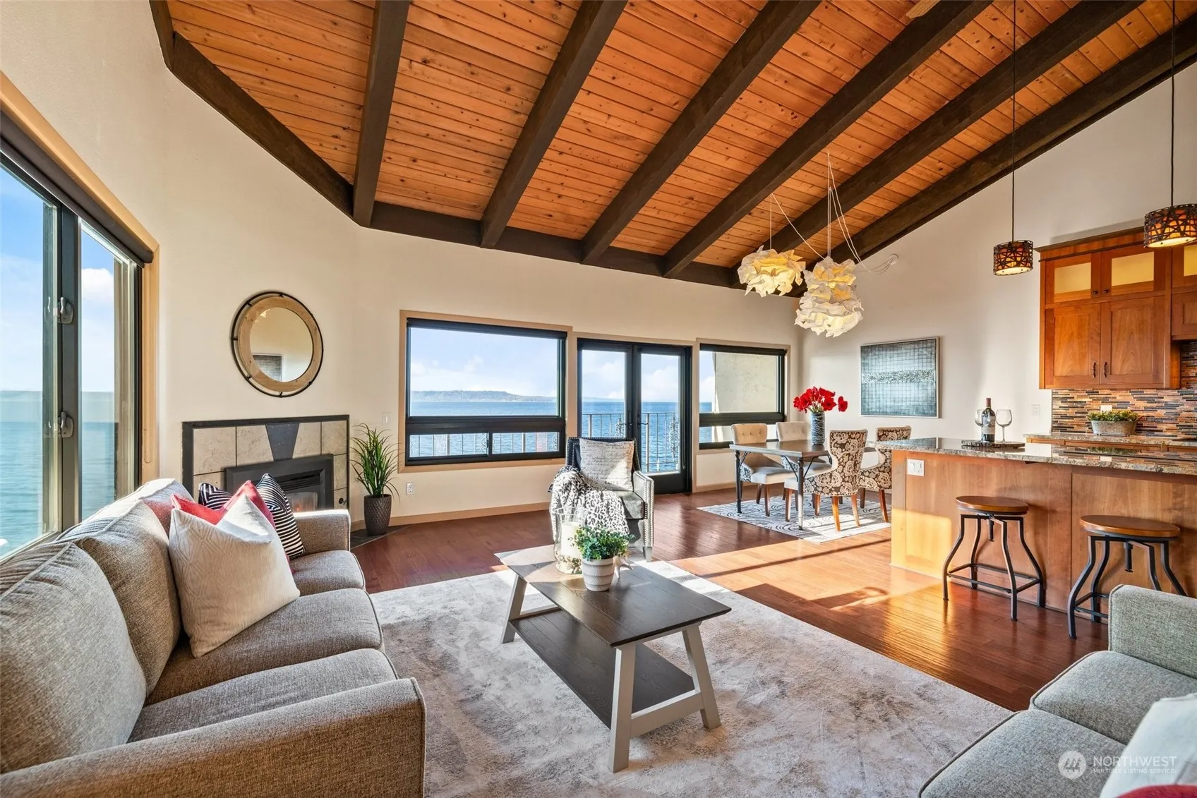 Exceptional 1640 sqft 3 bed, 2 bth condo has been beautifully updated. Kitchen w/ custom built Brazilian cherrywood cabinets, granite counters, induction stove, wall oven, built in dishwasher, stainless appliances, custom built pantry w/ slide out drawers. Spacious great room w/ spectacular unobstructed views of Puget Sound, Olympic Mountains & Maury Island, engineered hardwood floors, gas fireplace & large deck to take in amazing Redondo sunsets. Primary w/ engineered hardwood floors, private bath, travertine heated floors, heated shower floor & seat, double vanity w/ granite & walk in closet. 2 guestrooms w/ engineered hardwood, guest bath w/ granite counter & travertine heated floors. Gated entry, elevator, pool, sauna, gym.