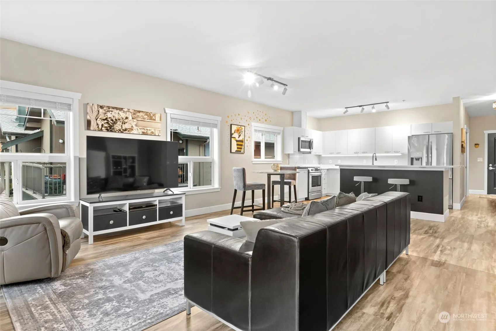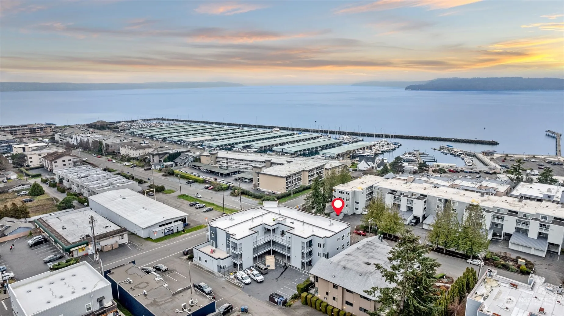 Top floor, corner, remodeled beautiful condo in the heart of downtown! Views from living room & primary bedroom make this unit light & bright. Generous living space w/ vinyl plank flooring, gas fireplace, large deck. Kitchen remodeled w/ quartz countertops, stainless appliances. Primary bed has slider out to balcony, walk-in closet, double vanity bathroom w/ contemporary sliding door. Remodeled bath w/ flooring, quartz countertop, tile, plumbing fixtures & shower door. Washer, dryer, blinds & water heater replaced. Incl 2 parking spots-1 inside secured garage & 1 outside. The complex has elevator and recently had extensive updates to exterior, including roof, new paint, deck refurbishing & comprehensive maintenance. Walk to Pier & Marina!
