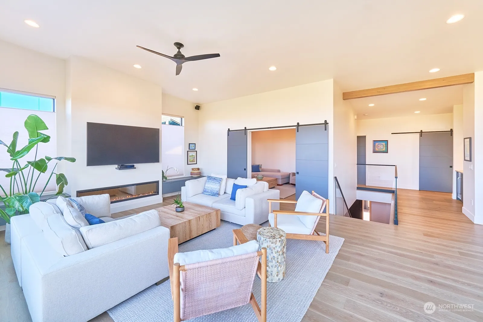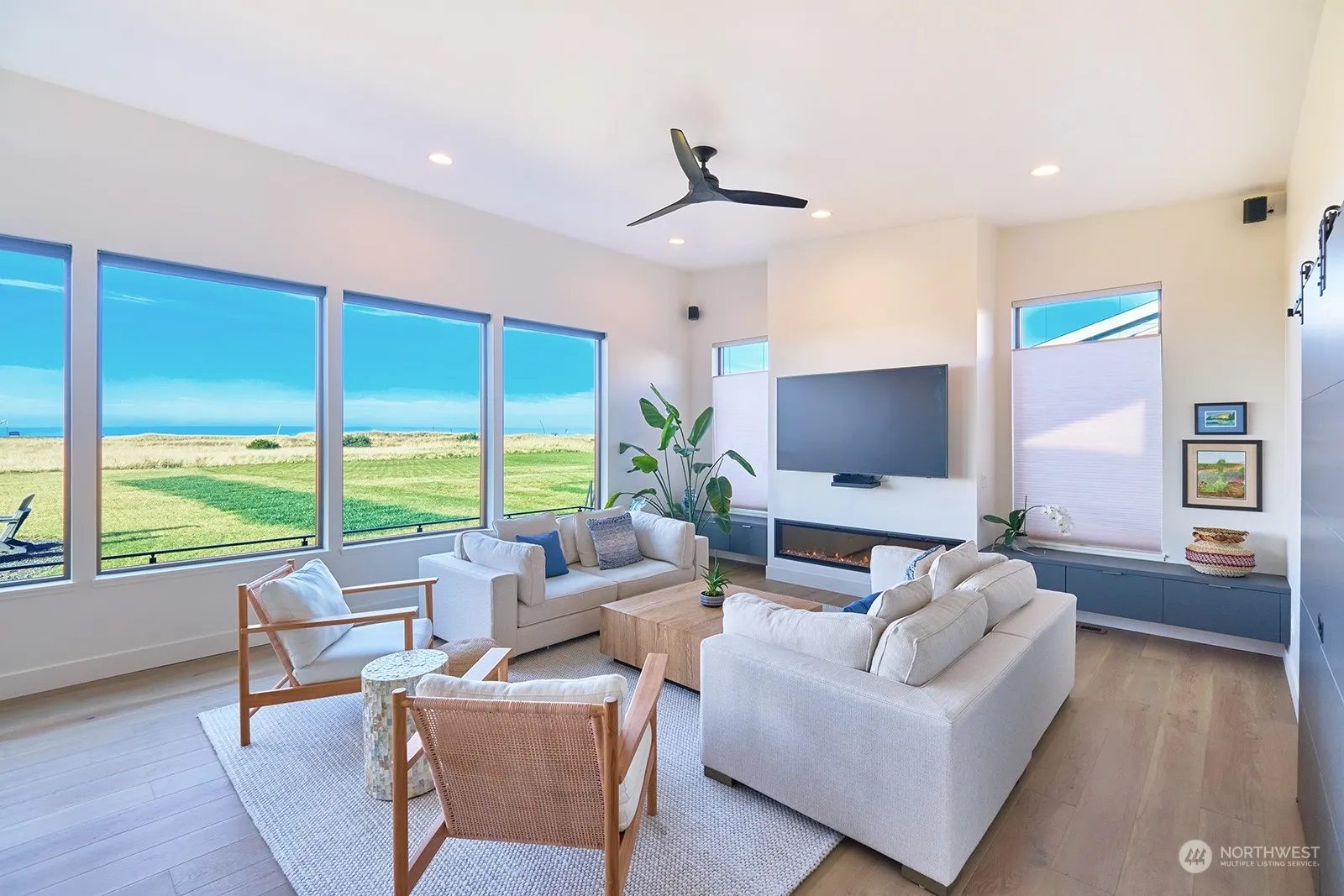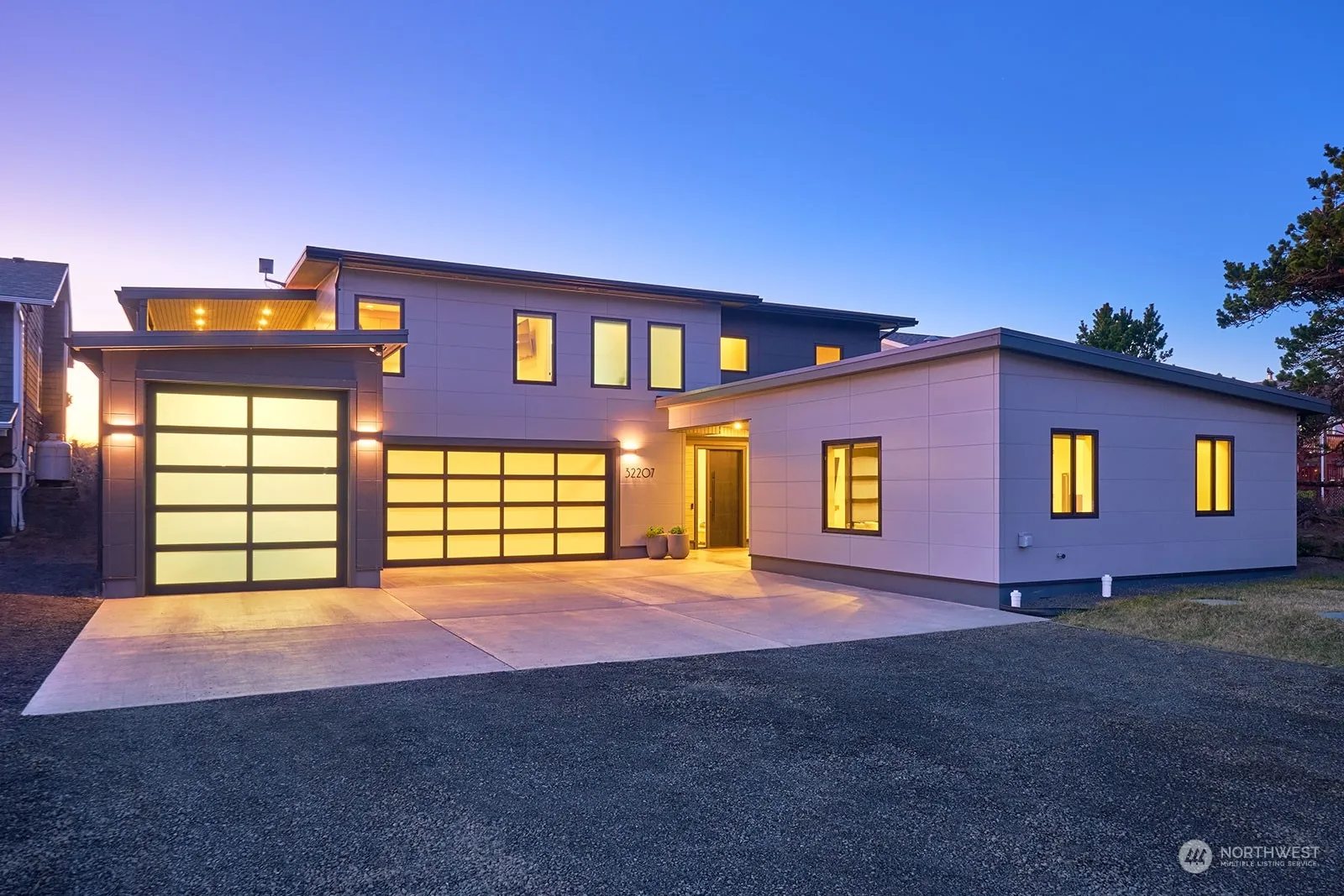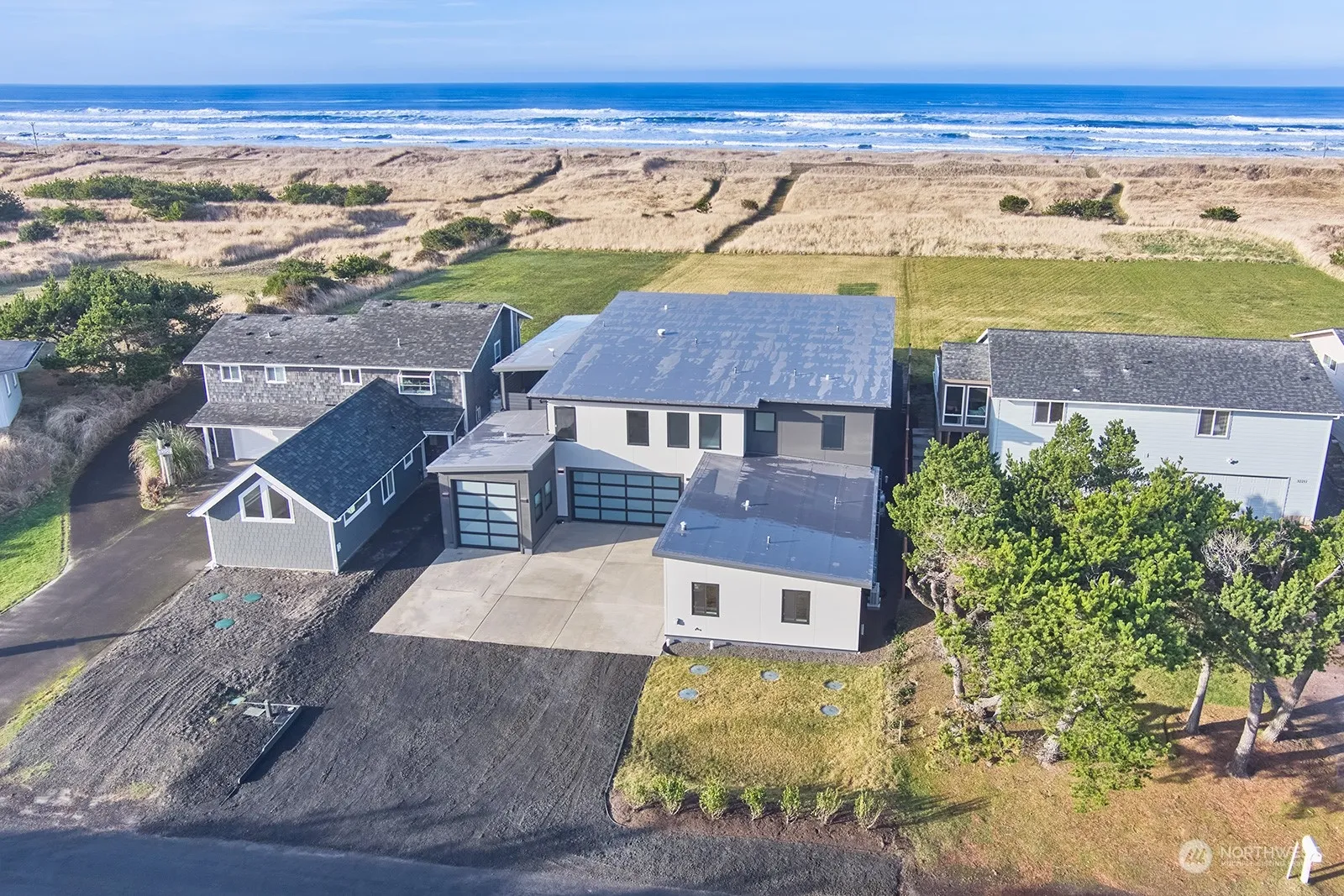 Experience modern coastal luxury in this 4-bedroom, 5-bathroom oceanfront home on the Long Beach Peninsula. Designed for comfort and style, the main living area features a designer kitchen, media room, guest bath, office, laundry, and a spacious primary suite, all accessible by elevator. The lower level boasts a second living space with 2 bedrooms, 2 bathrooms, a full kitchen, laundry, and gym. Separate guest quarters with a private entrance include a cozy living room, kitchen, bedroom, and 3/4 en-suite bath. Entertain on the covered deck and enjoy stunning sunsets and direct beach access. With designer finishes and modern materials throughout, this home is perfect for hosting or multigenerational living. Fully furnished.