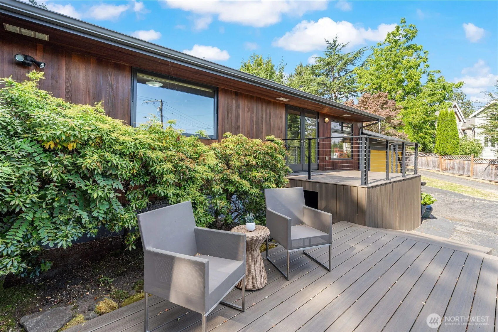 Stunning, tastefully remodeled mid-century modern rambler with partial lake and mountain views. Vaulted ceilings enhance the open living and dining areas, flowing to a new $70K private deck—perfect for elegant entertaining. Thoughtful updates include fresh exterior paint, a newer 2022 Presidential TL roof with transferable 50-year warranty, new insulation in the crawl space and attic, and refined finishes throughout—from maple hardwoods to custom-built walnut cabinetry. AC provides year round comfort. Prime location just steps to Lake Sammamish, one block from Idylwood Beach Park, minutes to Marymoor Park, Microsoft, and easy access to 520.
