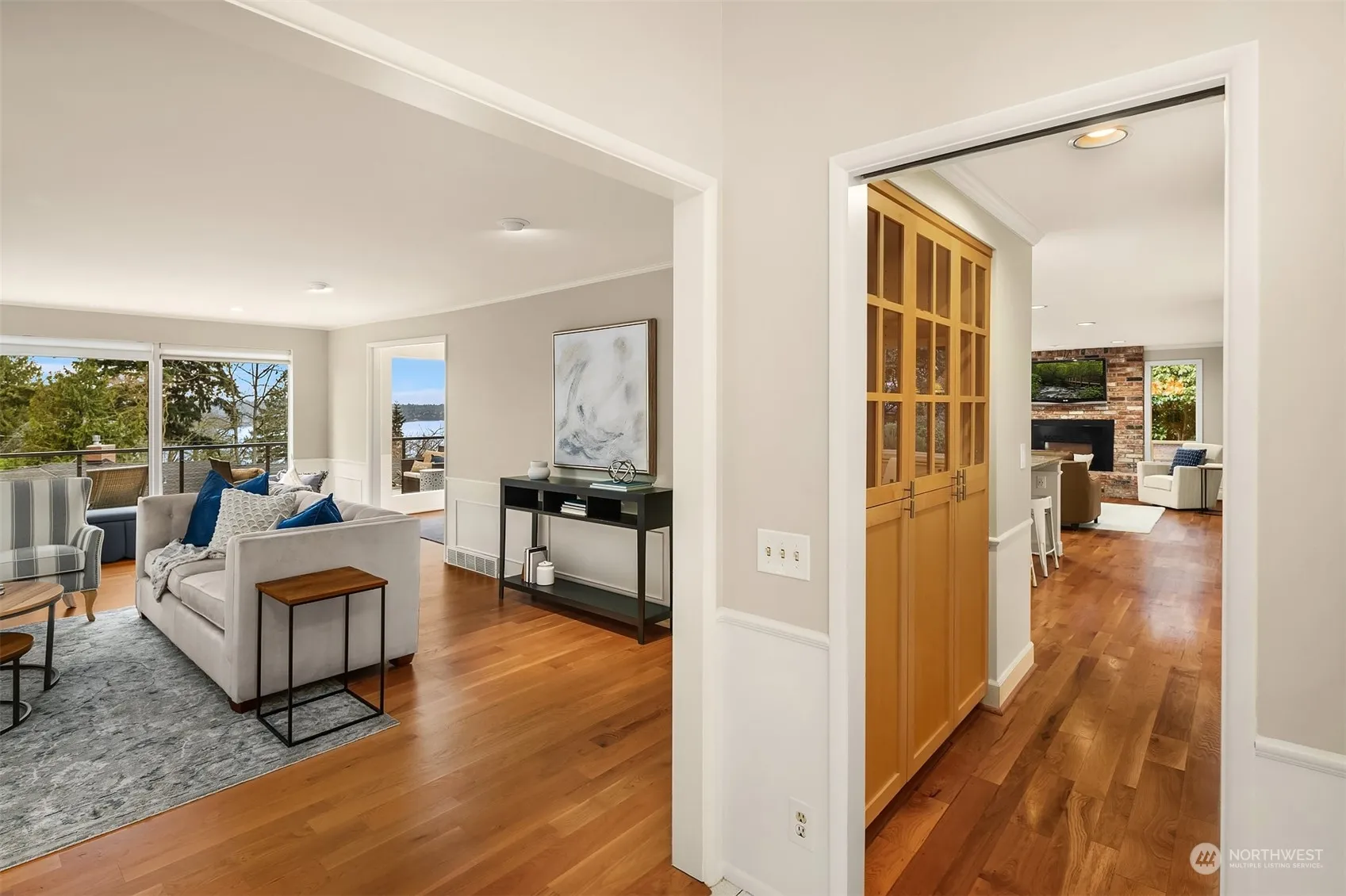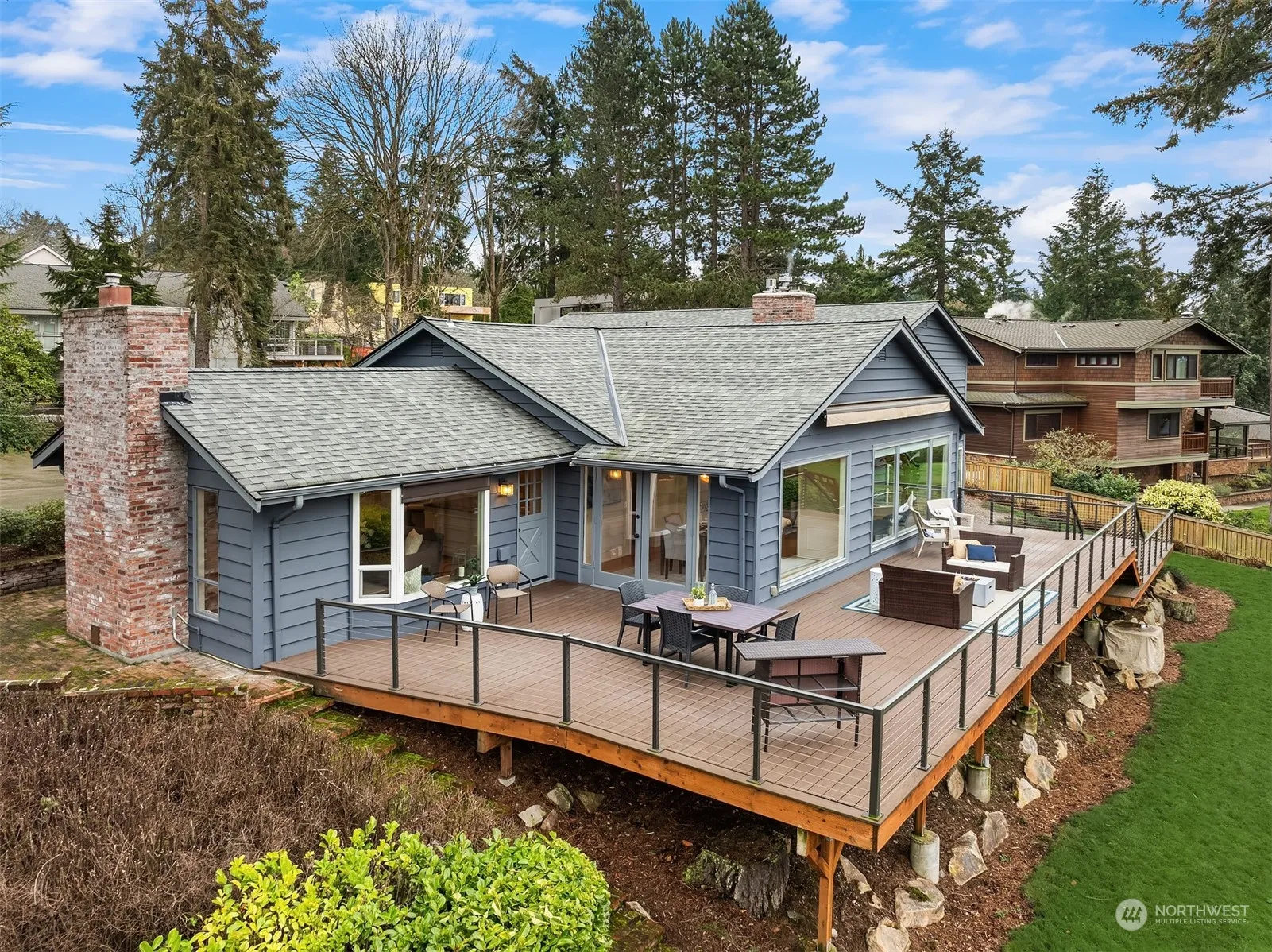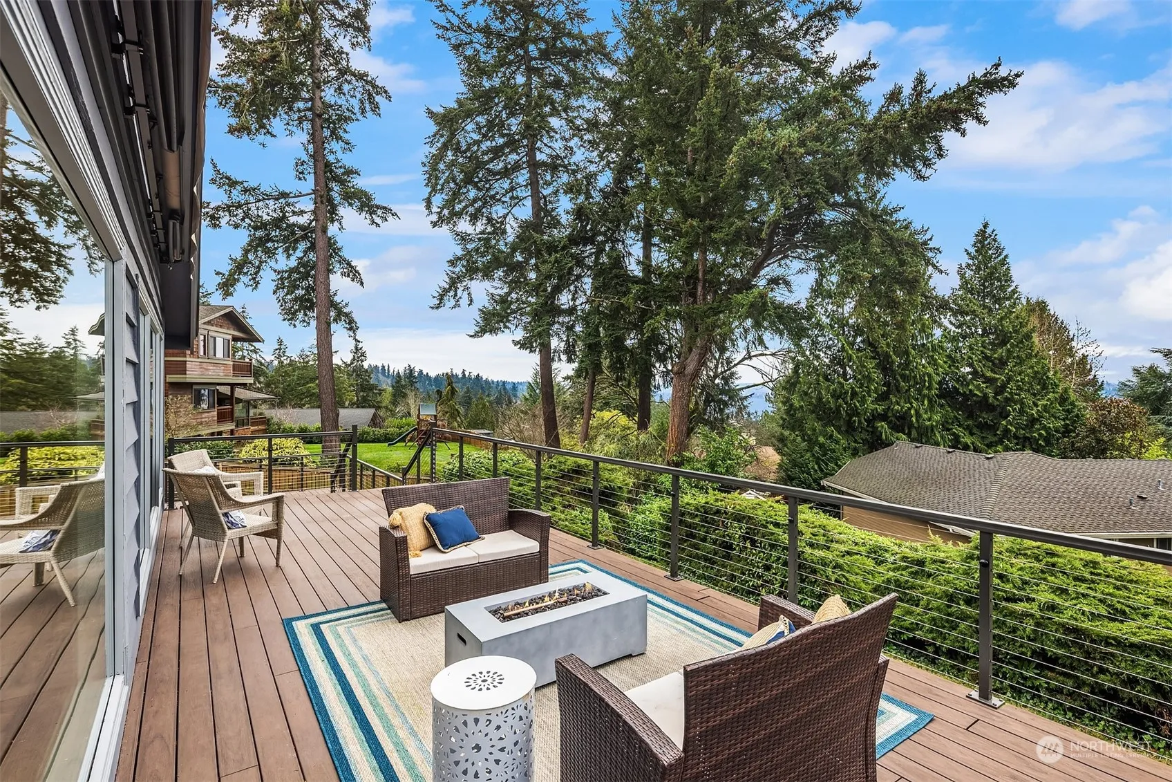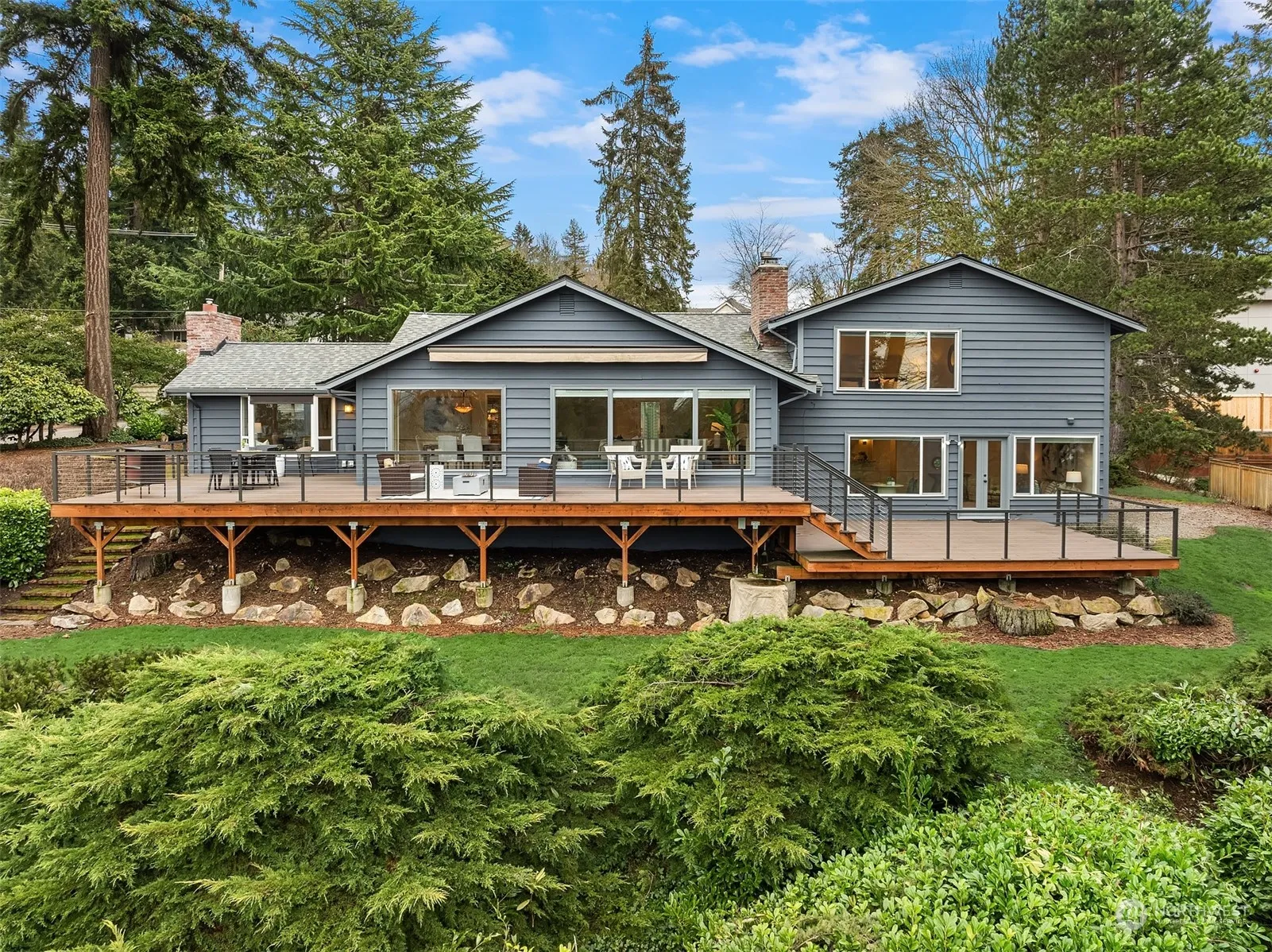 Enjoy twinkling lights from views of the Seattle skyline with a backdrop of Lake Washington and the Olympic Mountain range. Effortlessly entertain large parties on your multi-level Azek deck with western views. Walls of windows in every room capturing the views and filling it with sunshine. Upstairs features a primary bedroom plus 3 additional bedrooms. Downstairs offers a 5th bedroom with ensuite bath, office, wet bar & wine fridge, bonus room, separate exit and an office. The perfect MIL suite. A 15,424 sf flat lot, a 680sf generous garage with ample driveway room for RV and boat, and a convenient mid-island location. A/C, tankless hot water, new roof. And you can even watch the Blue Angels from your deck.