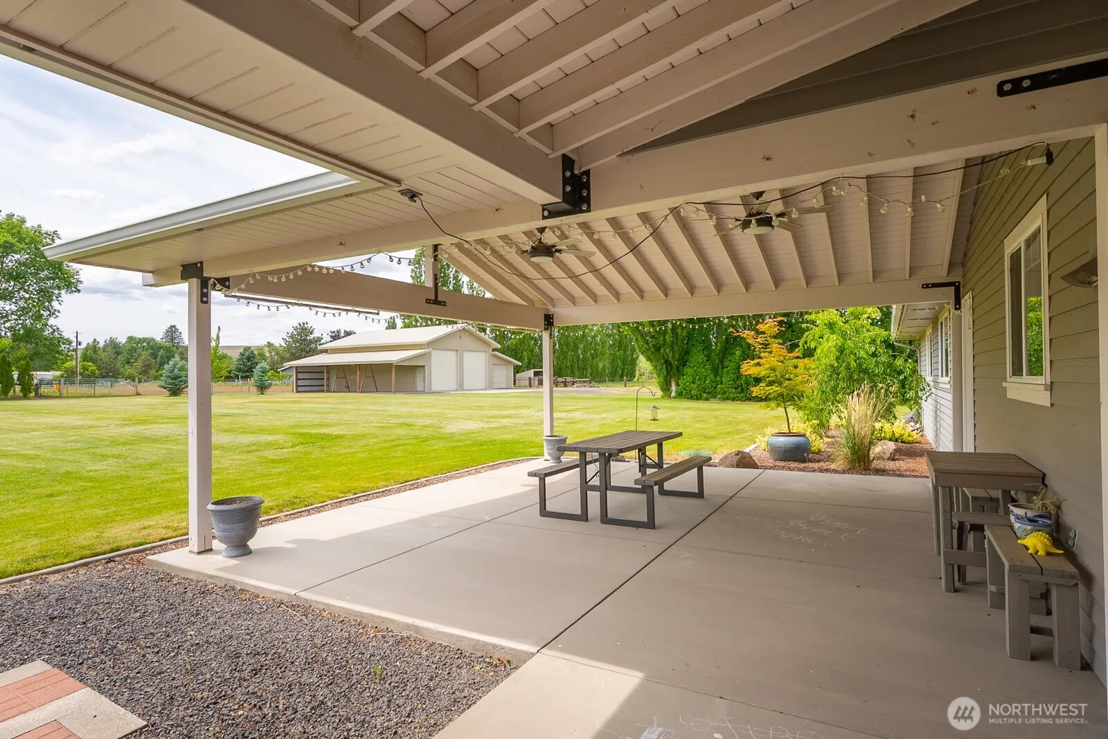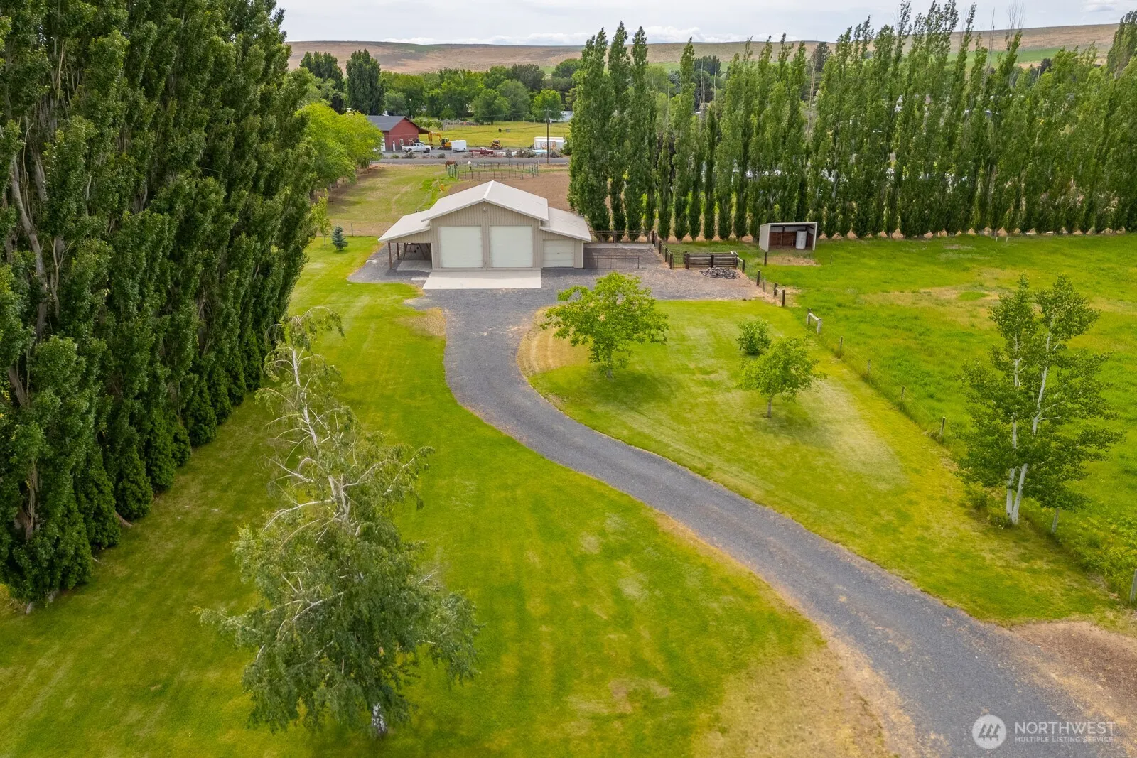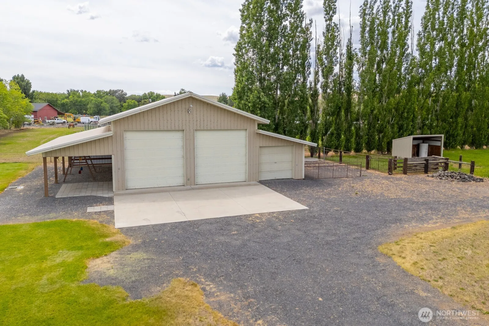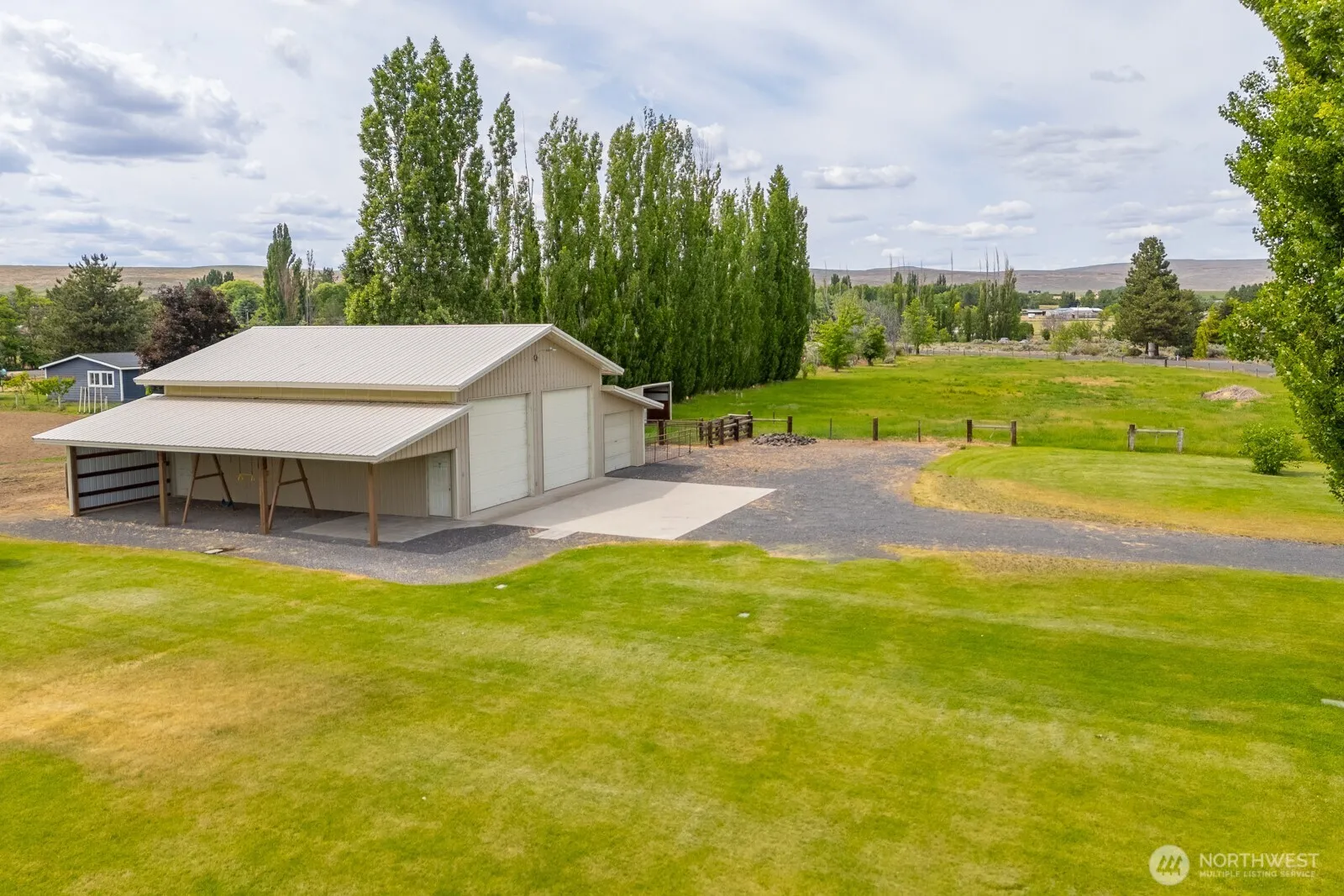 This stunning 4-bedroom rambler offers the perfect blend of modern comfort and country charm. Enjoy an open floor plan with hardwood floors, a warm and inviting living room with a fireplace, and a gourmet kitchen featuring a spacious island. Flex room with closet could be used as a 4th bedroom. There are two primary suites, including one with heated bathroom floors and dual walk-in closets. Guest house with 1 bedroom, full bath provides additional 1,152′ of living space and loads of storage, while the 2,160′ shop with lean-to and pasture offer a second lean-to are ideal for equestrian or hobby farmers. Located on 4 acres with irrigation. Plenty of mature trees, this tranquil oasis is a 5 minute drive to the famous shores of Soap Lake.