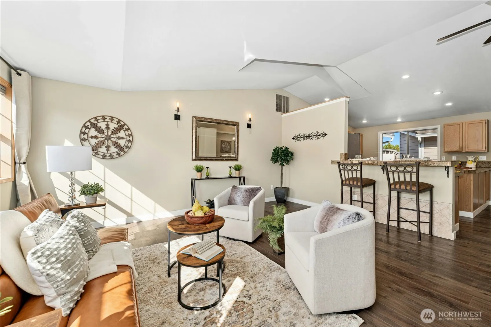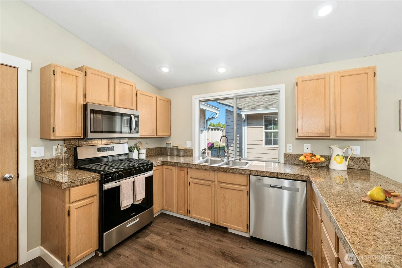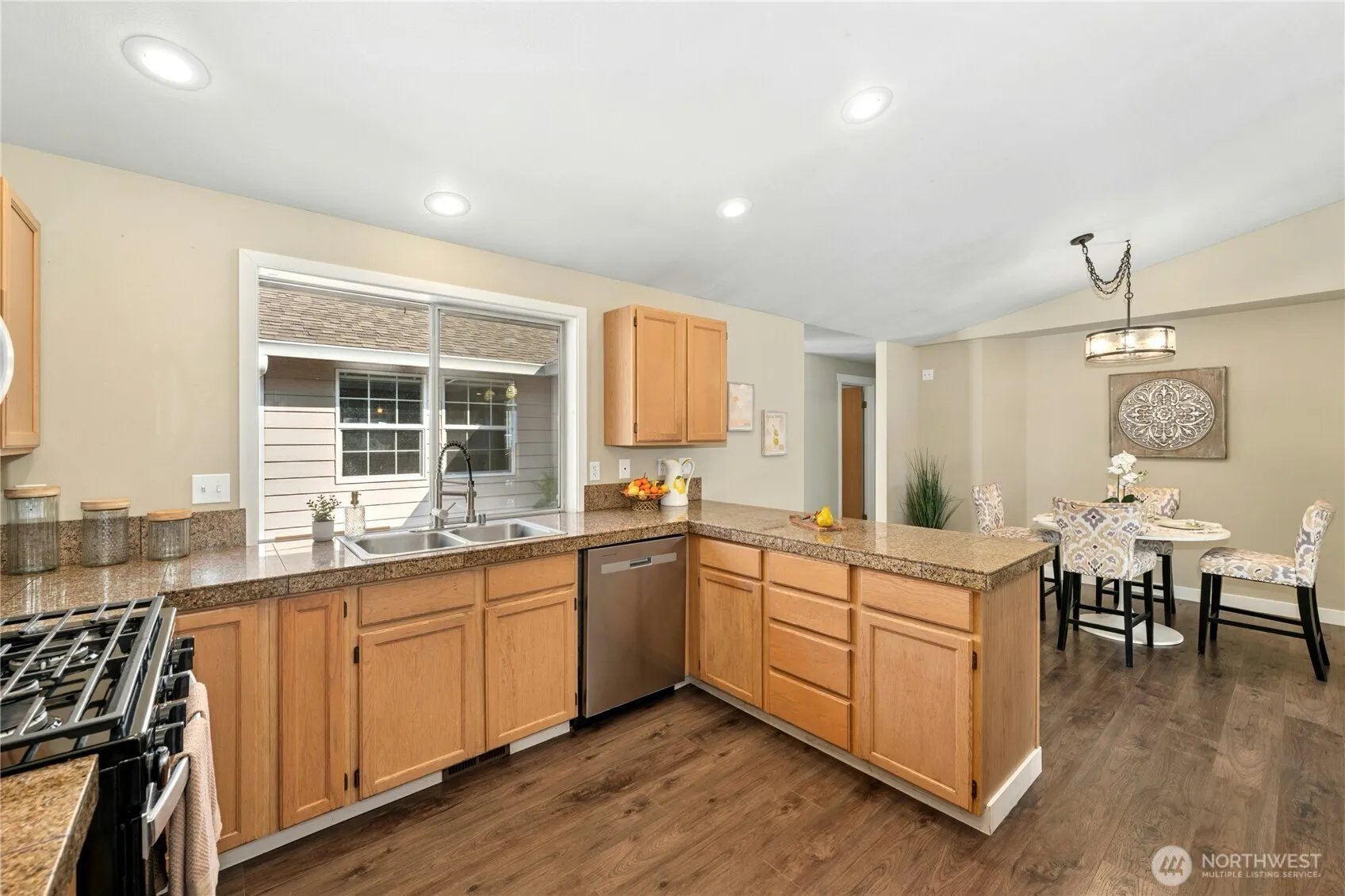 Don’t miss this 2120SF rambler in town with a floor plan to suit everyone. Formal living has a vaulted ceiling. Kitchen features new appliances, granite counters, and breakfast bar that opens to dining room. Large family room with a vaulted ceiling offers plenty of entertaining space and a gas fireplace. Primary bedroom has his/her closets and 3/4 bath with double vanity. All 4 bedrooms are generous in size. Fully-fenced, terraced backyard has patio on lower level and outbuilding, outdoor furniture space, and garden space on upper level. 770SF tandem garage has rear garage door entry too.