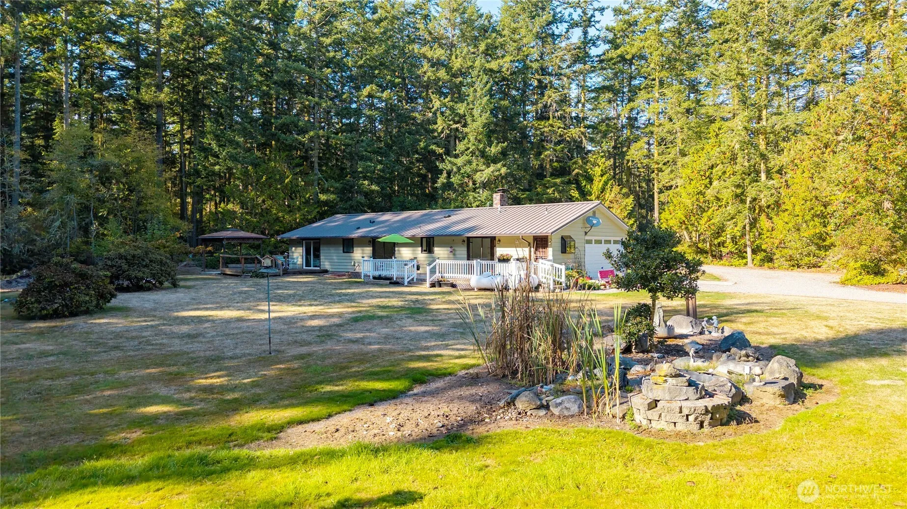 Beautifully situated on nearly 5 level acres, well built single story home surrounded by majestic trees & amazing landscaping! In the heart of Whidbey’s rainshadow & near to beaches, parks & city-this rural setting has it all. Both private & serene, gated entrance property w/ plenty of room to expand. Meaningful updates on the home: metal roof, propane furnace, water heater, water treatment, engineered hardwood flooring, solid surface corian countertops in kitchen & baths. Enjoy cozy evenings w/ easy to operate pellet stove. 3 large sliders open to the sunny deck, large windows let the outside in! Wired for generator & hot tub. Amazing detached 720sqft shop w/ power & wood stove. Multiple carports for RV, boat or toys.