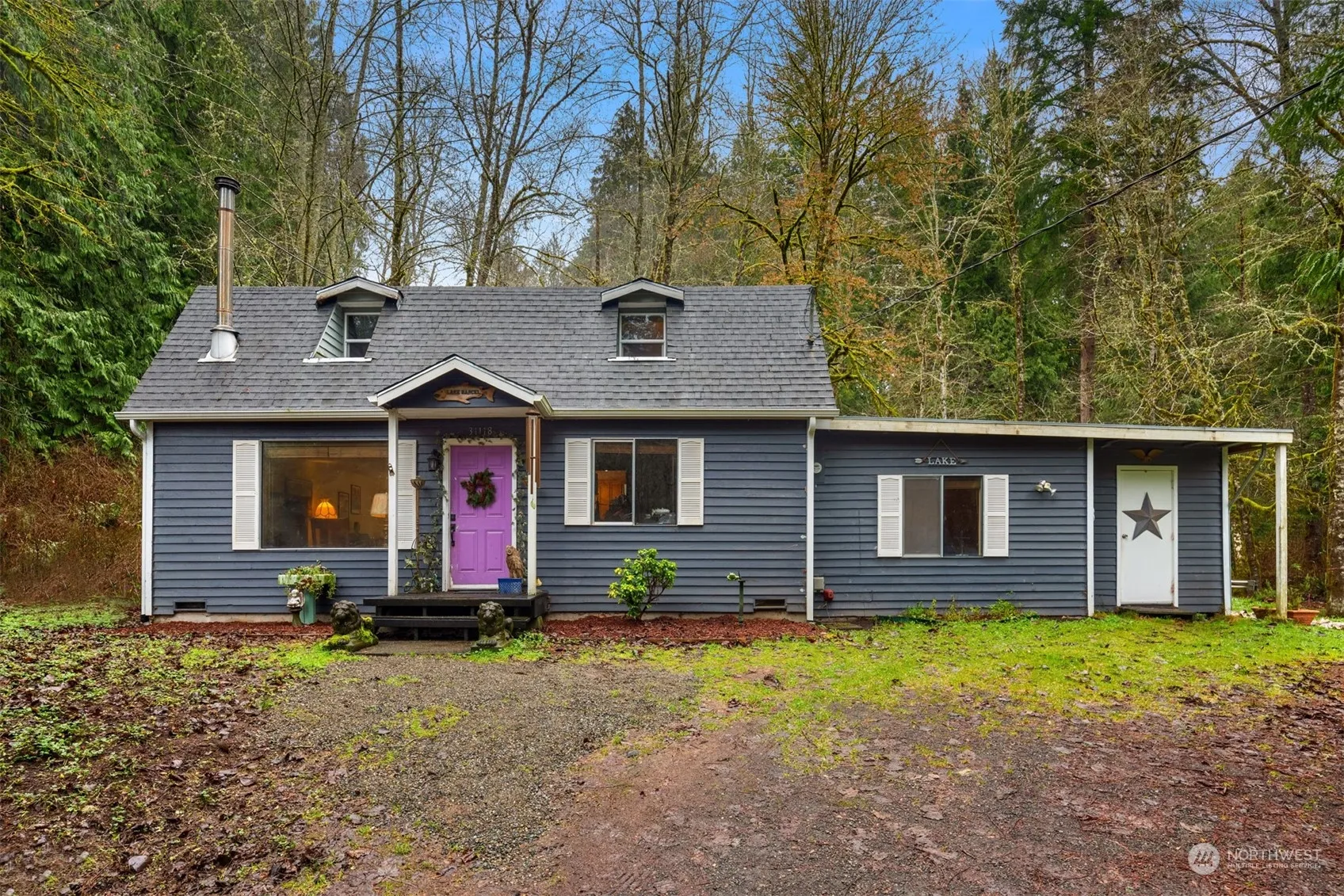 Lakeside Country Living ~ Tucked away on a secluded hillside at the end of a quiet cul-de-sac across from Lake Marcel, this 1670sf, 4 bed, 2 bath, 2-story on .31 acres is a sweat equity opportunity! Fresh paint & new flooring would transform this home. At this bargain price, there’s plenty of room to budget for additional upgrades too. Imagine the possibilities. Built in 1986, the house is solid with an ideal layout featuring living room with open staircase, wood stove & big picture window, kitchen with skylights, primary bedroom with vaulted ceilings and family room wing with 4th bedroom, private entry, laundry & 3/4 bath. Beautiful views of forested grounds from every window. Gas in street. Short walk to private community parks & beaches!
