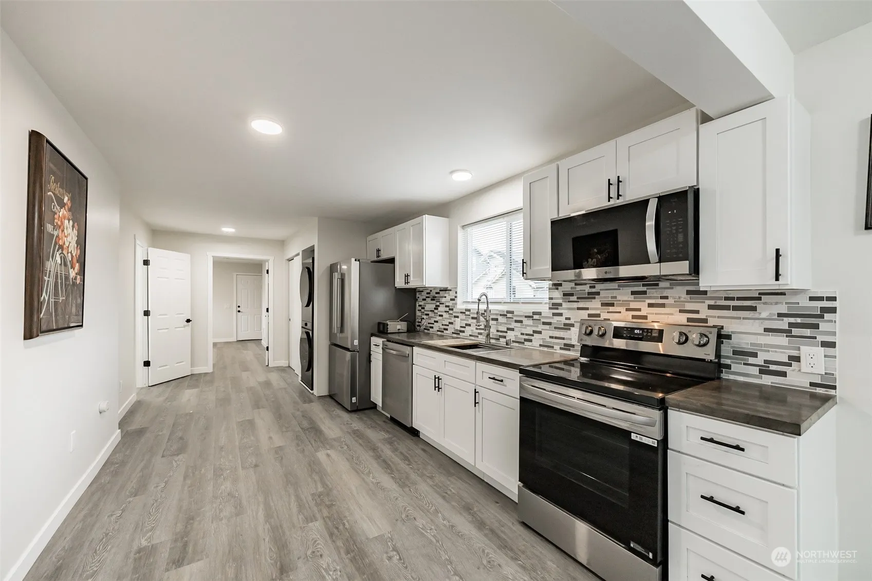 Another “studs out” rehab from our prolific investor/ contractor with a keen eye for detail! Buyers will appreciate the thoughtfulness of the finishes and use of space. NEW EVERYTHING: fresh interior paint, neutral LVP flooring and carpet, millwork with on-trend hardware, , fixtures throughout. All new appliances (including laundry conveniently located) and new hot water tank. New exterior paint and trim, new roof and gutters. Generous bedroom closets, recessed lighting and window coverings throughout. Fully fenced oversized lot with convenient alley access to the rear parking pad.
