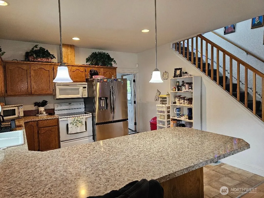 Fabulous 5 Bd Home at only $424,950! 4 large bedrooms, 1 small bedroom (could be an office/den) Beautifully maintained Primary bedroom upper level with a cozy gas fireplace. Gas fireplace in living room as well. Huge pantry lots of shelves, chest freezer stays. All appliances stay, Brand new range/oven and newer refrigerator. Nice yard to one side for great bbq’s! Roof has 10 yr warranty. Newly stained front porch. Swimming pool stays as a bonus! You cannot beat this price!