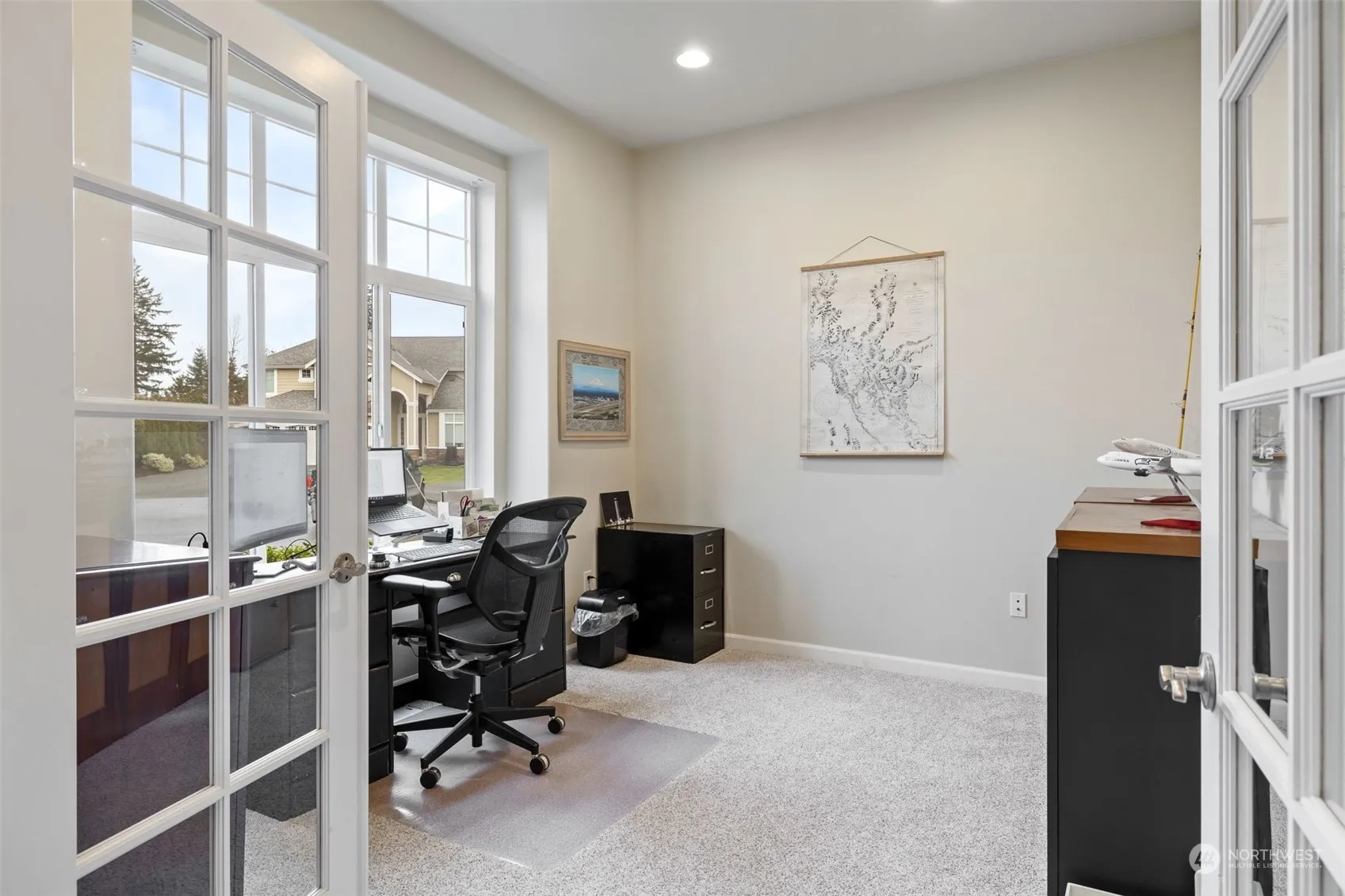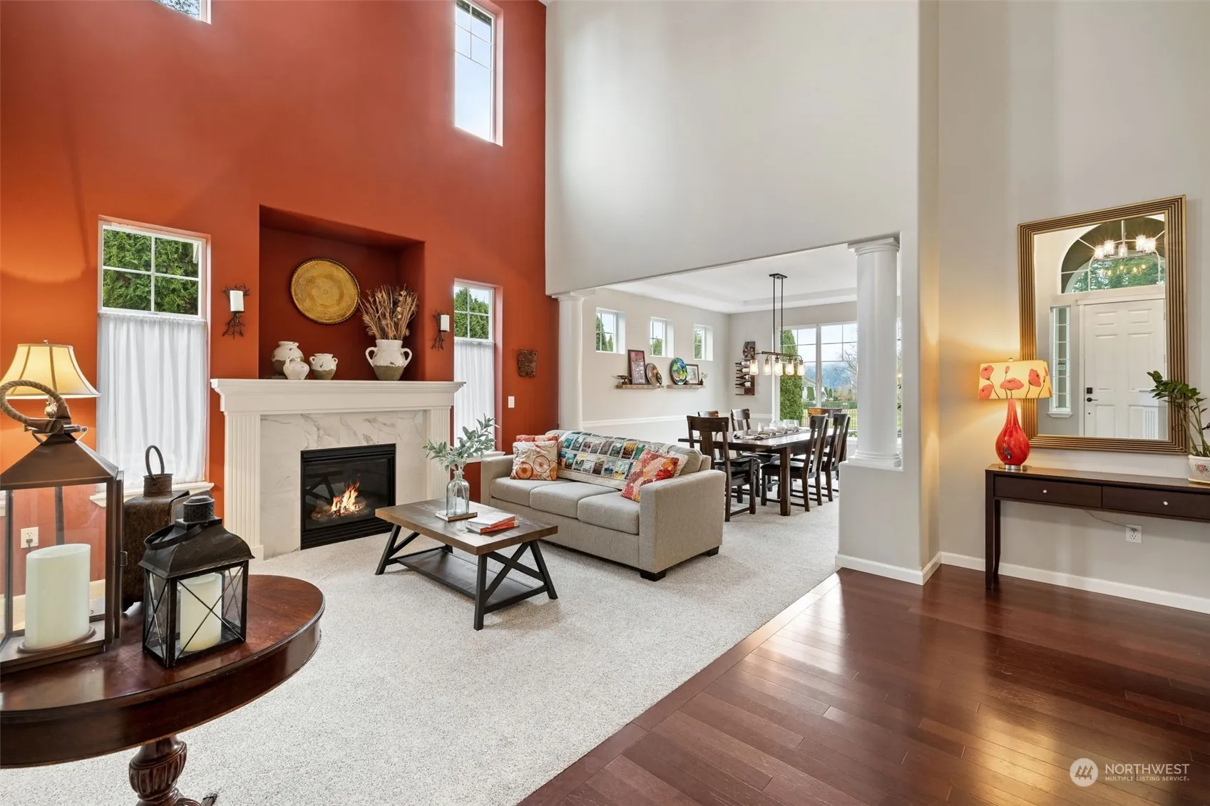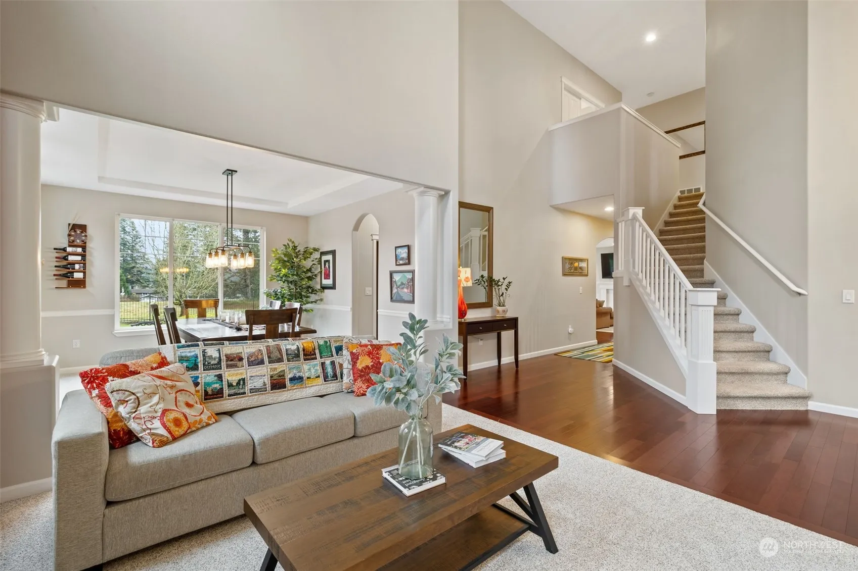 Both sophisticated and welcoming, this home is perfect for entertaining and daily living. Beautiful hardwood floors warm the entry and high ceilings throughout add a bright, airy feel. The updated kitchen and family room open to patios and covered outdoor space, ideal for year-round enjoyment. The property adjoins the Tall Firs Disc Golf Course and has a pleasant view of the Cascade foothills. Upstairs, the primary bedroom offers an ensuite 5-piece bathroom and walk-in closet. Three additional bedrooms, a large bonus room, an updated hall bath and a laundry room are also located on this floor. The heat pump provides both warmth and A/C. Located on a quiet cul-de-sac, you are just minutes from downtown Monroe schools, shopping and services.