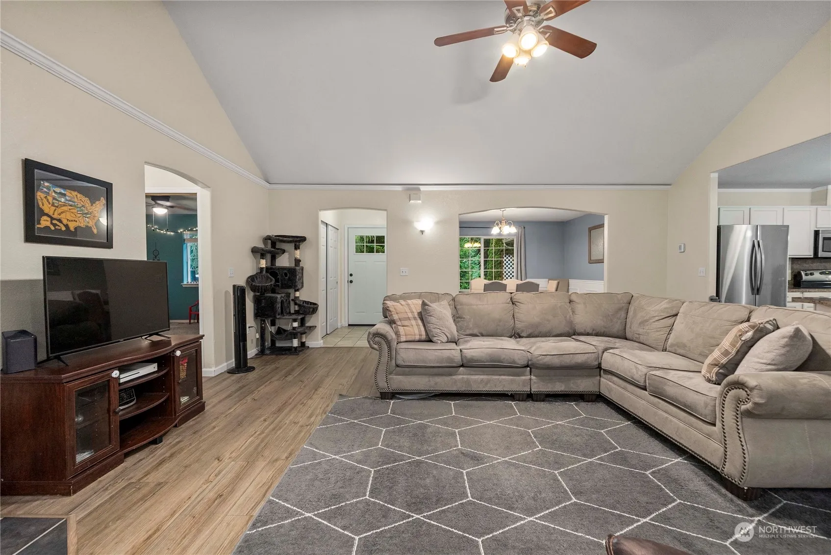 Discover the charm of country living on 1.1 acres in this updated 3-bed, 2-bath split-bedroom home with a brand-new roof (Dec 2024). The open-concept living area flows into a large, fully fenced backyard. The spacious kitchen boasts ample counter space and opens to a vaulted-ceiling living room. The master suite offers extra space for a nursery, office, or sitting area. Recent updates include new flooring, paint, landscaping, and a new furnace and heat pump (2022). Power is available to all outbuildings and the back of the property. Enjoy garden space, an oversized 2-car garage, and a backyard ready for farm animals.