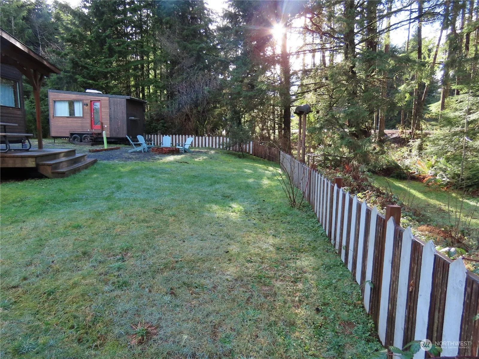 Lovely vacant lot for camping now & building later & the lot is fully fenced, & the property goes farther out back beyond the back fence & has a nice, covered area with table & chairs which gives you a nice place to sit & relax! Property also has a private well & a septic & a private outdoor bathroom & power connected to the property! There is a cleaning sink out back & a set of stairs to get you to the back side of the property! There are 2 Tiny Homes that will be removed prior to close of escrow & each has a bed, a 3/4 bath & a kitchenet with a refrigerator & a small heat space on the counter, & table & chairs & are set up with full RV hook-ups & each can be purchased for $35,000. Property is close to the beautiful beach for lots of fun!