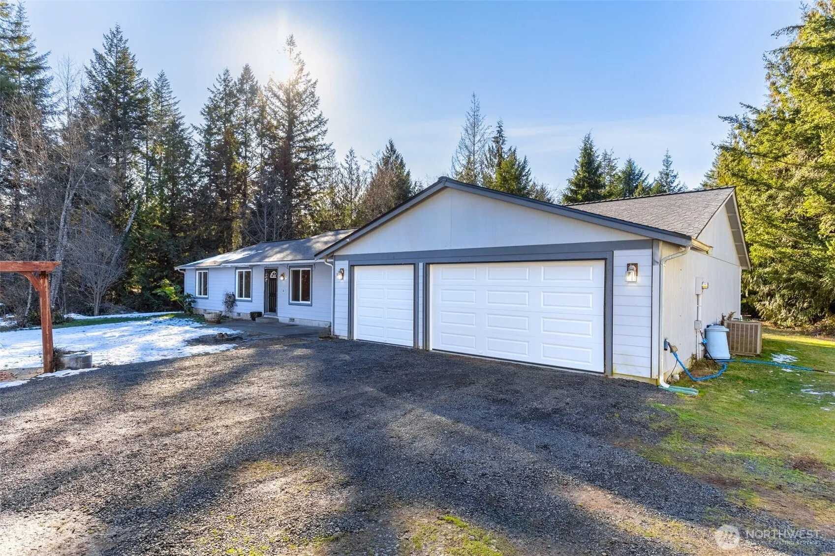 Welcome to this spacious 2,563 Sqft rambler sitting on 5-acres in Belfair. The primary suite and two secondary bedrooms are on one end, while a second primary room sits on the opposite side. Skylights brighten the kitchen, featuring stainless steel appliances and an induction range. French doors open to a covered fully equipped outdoor kitchen w/ice maker & fridge. Recent updates include LVP flooring, interior paint, 50-year roof, & garage doors. Additional features: sprinkler system, 2 garden sheds, greenhouse, chicken coop, storage container & 40X32 durospan metal building (materials on site to enclose), full RV hookups, furnace & heat pump, and a 300ft deep well serving only this property. Plus, a beautiful blue tractor ready to roll!
