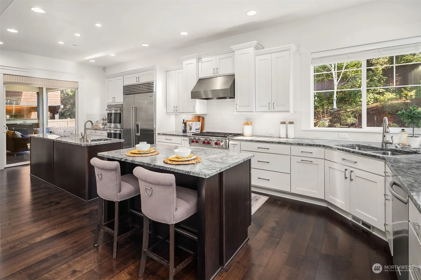 Stunning custom home with western sunset and Lake Washington views, nestled on a private lane with a spacious, level fenced backyard perfect for play or gardening. Upstairs features 4 bedrooms (3 en suite) and a highly desired rec/media room. The oversized primary suite boasts a luxurious 5-piece bath, lake views, and a large walk-in closet connected to the laundry room. The gourmet kitchen is a chef’s dream with Sub-Zero, Wolf appliances, dual dishwashers, and granite countertops. Enjoy dual outdoor rooms with finished cedar details. Maple hardwood floors, A/C, executive office, 4-car garage, and abundant built-ins. Close to top-rated schools, parks, shopping, amenities, and easy access to I-90.
