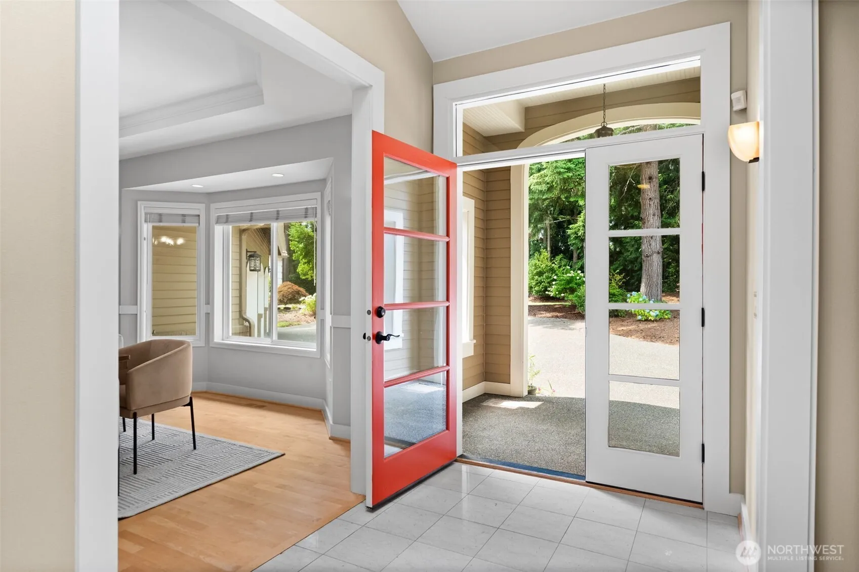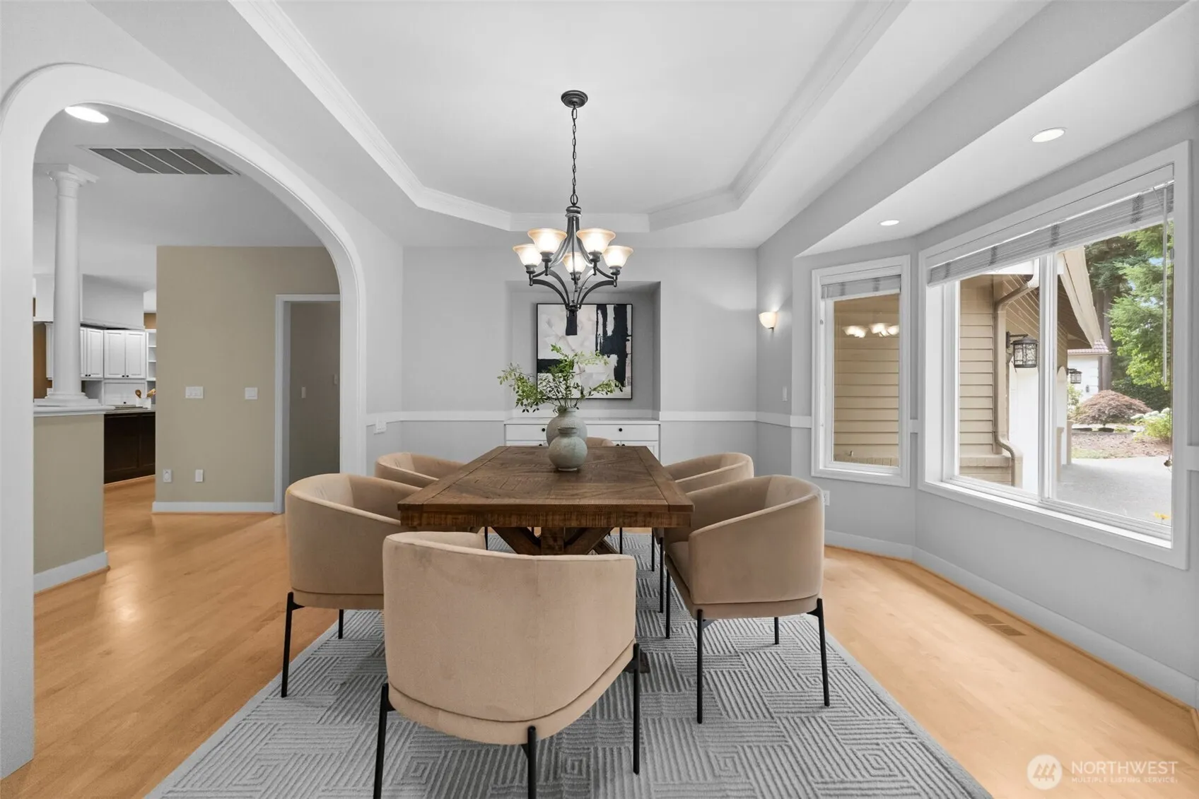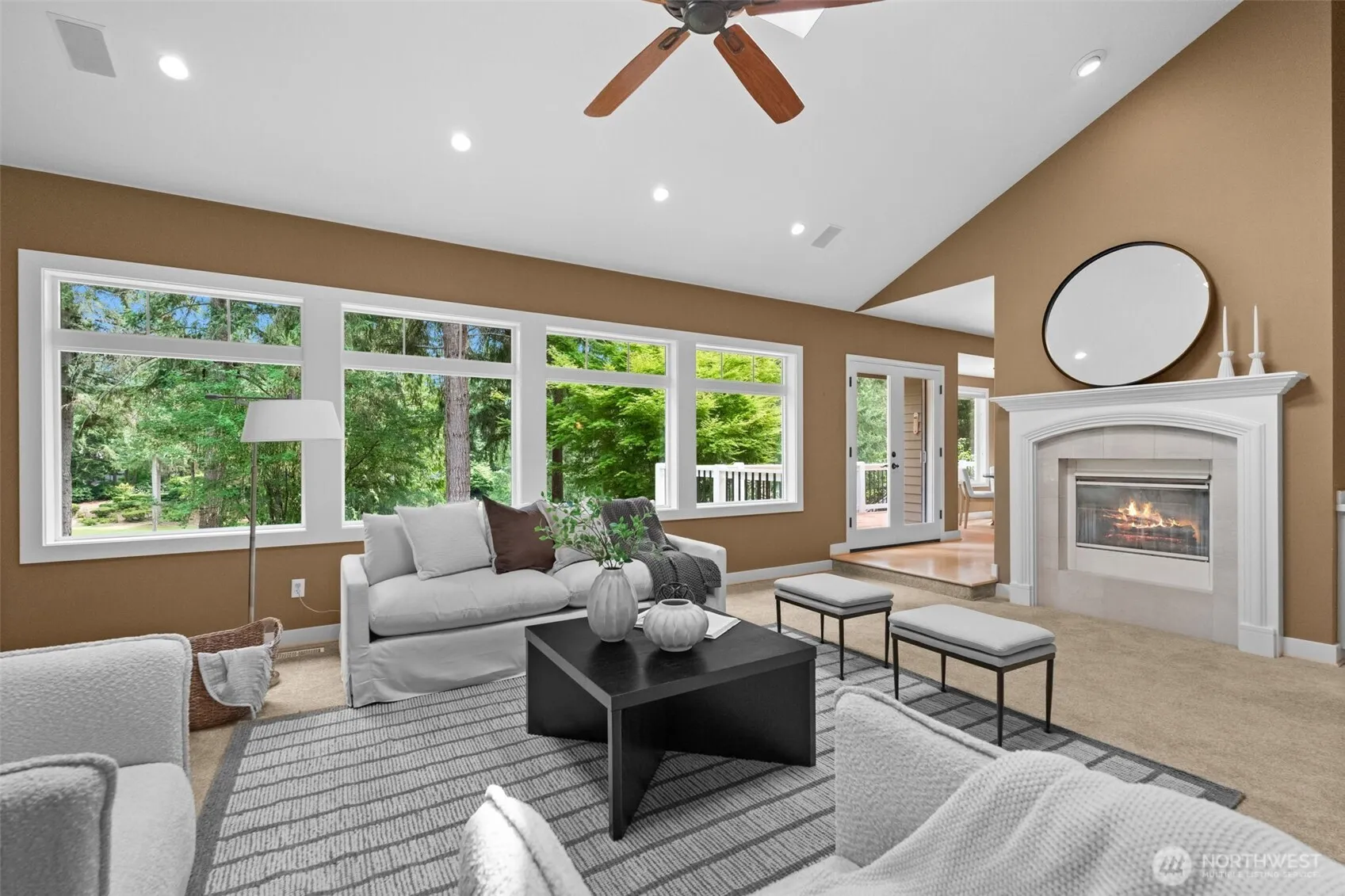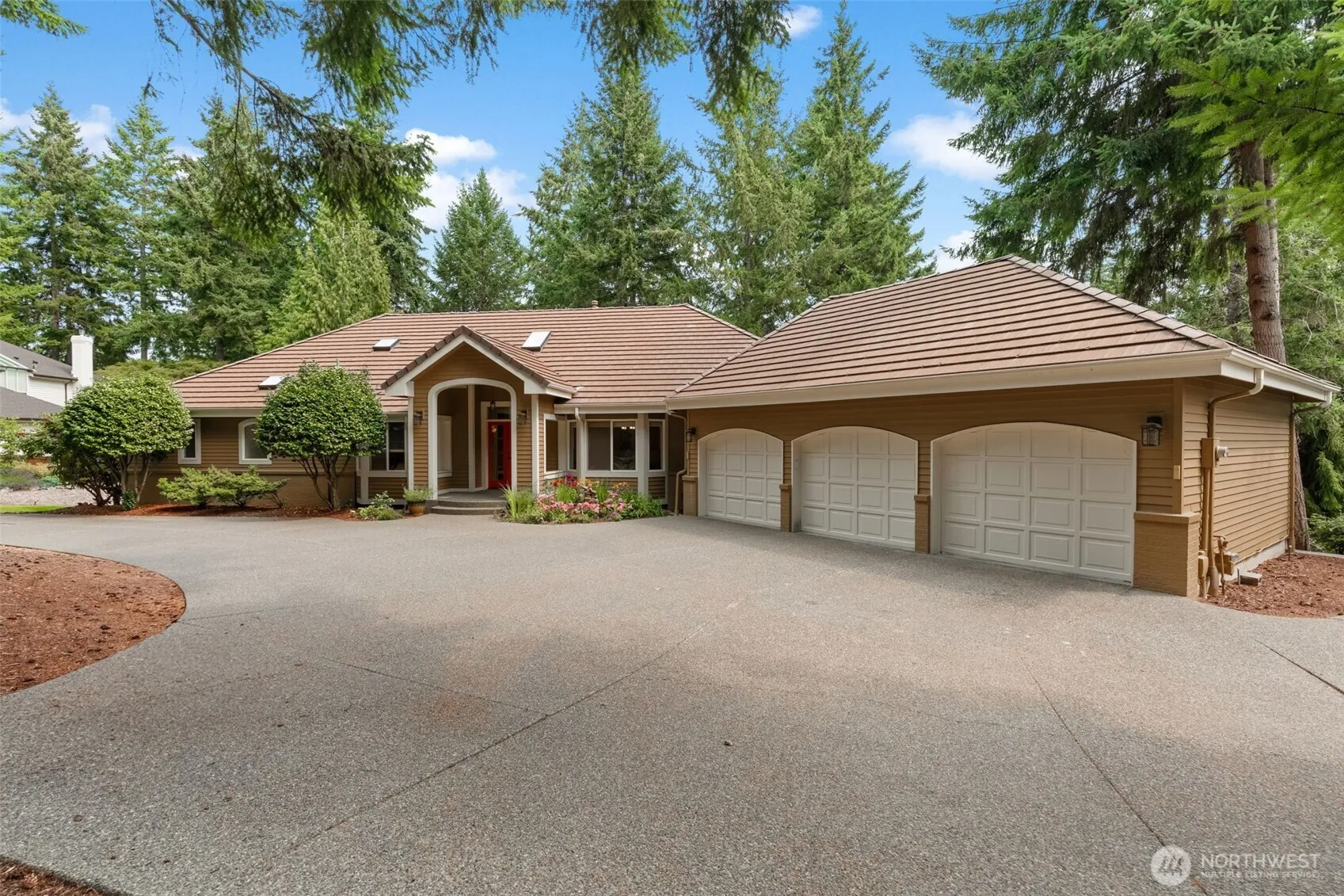 Gorgeous Canterwood golf course views from this serene & private setting on the 11th fairway. This thoughtfully designed home features main floor living, an open-concept layout, & custom built-ins throughout. The spacious kitchen includes a large island and opens to the dining area with a cozy two-sided fireplace and views. The main-level primary suite offers beautiful views of the course, a walk-in closet with convenient access to the laundry room. Washer/dryer hookups on both levels for added flexibility. The lower level includes a bonus room, three bedrooms, one Jr Suite, & former wine cellar currently used as a workshop, w/ potential to convert back. Recent updates include exterior paint (2019), heat pump (2020), and furnace (2021).