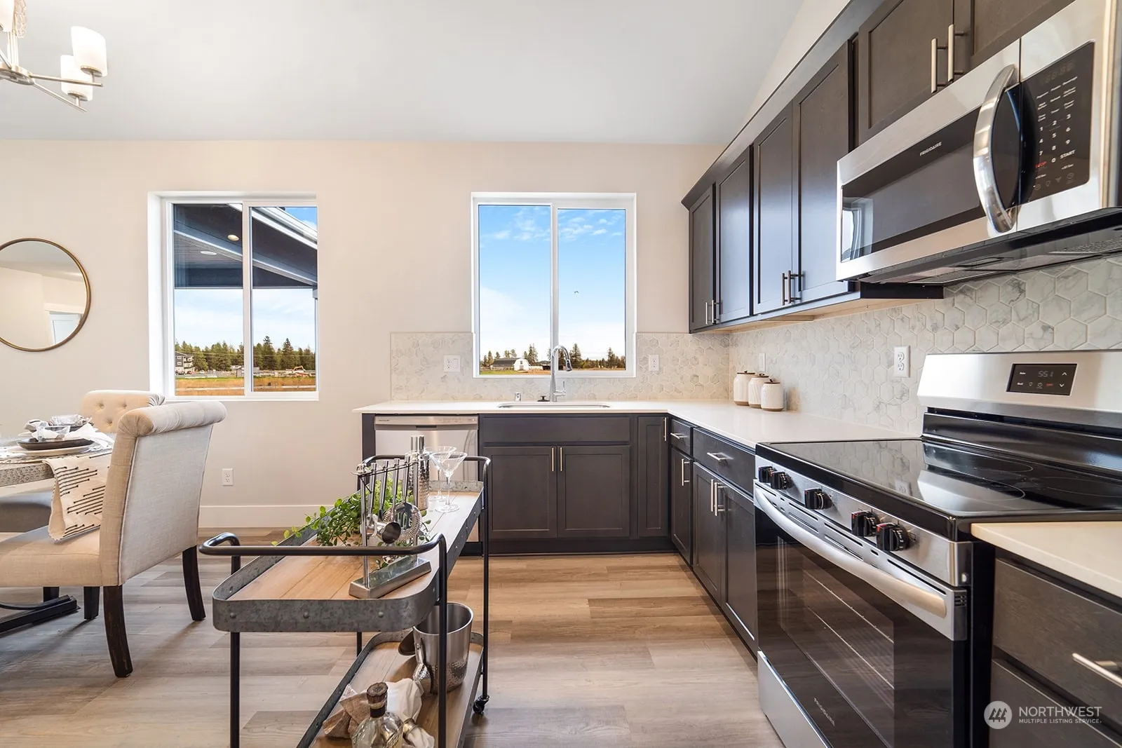 Experience modern living in the Stockton by Azure Northwest Homes. This 3 bedroom, 2 bathroom home combines elegance and thoughtful design. The open-plan living area features an electric fireplace and a double slider to a covered back patio, ideal for entertaining or relaxing. Vaulted ceilings and oversized windows fill the great room with natural light, creating an inviting atmosphere. the kitchen includes 42″ upper cabinets, hard surface countertops, stainless steel appliances, and a pantry. Bathrooms offer tiled showers and double sinks for a touch of luxury. A can light package and a landscaped front yard complete this home’s sophisticated appeal.