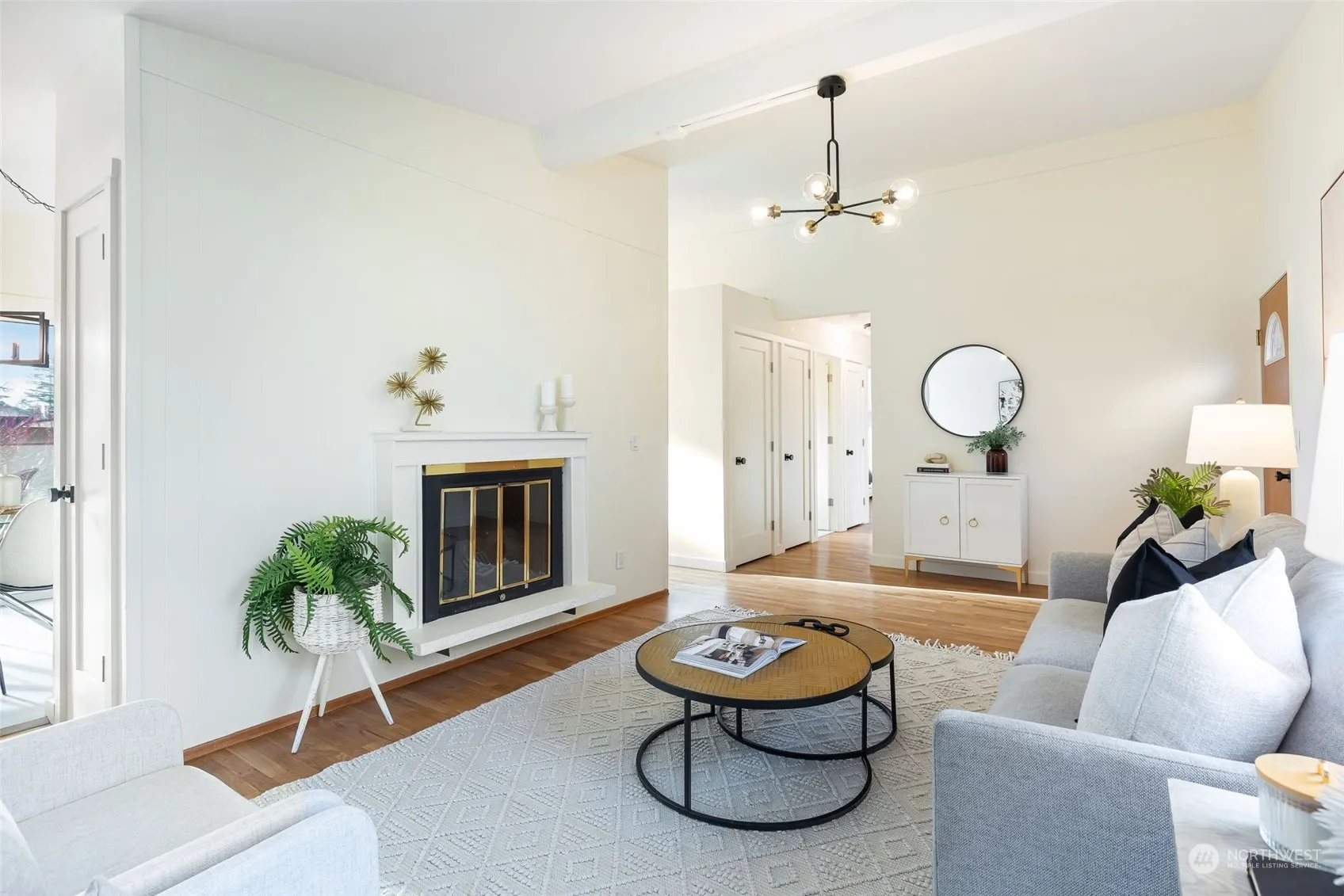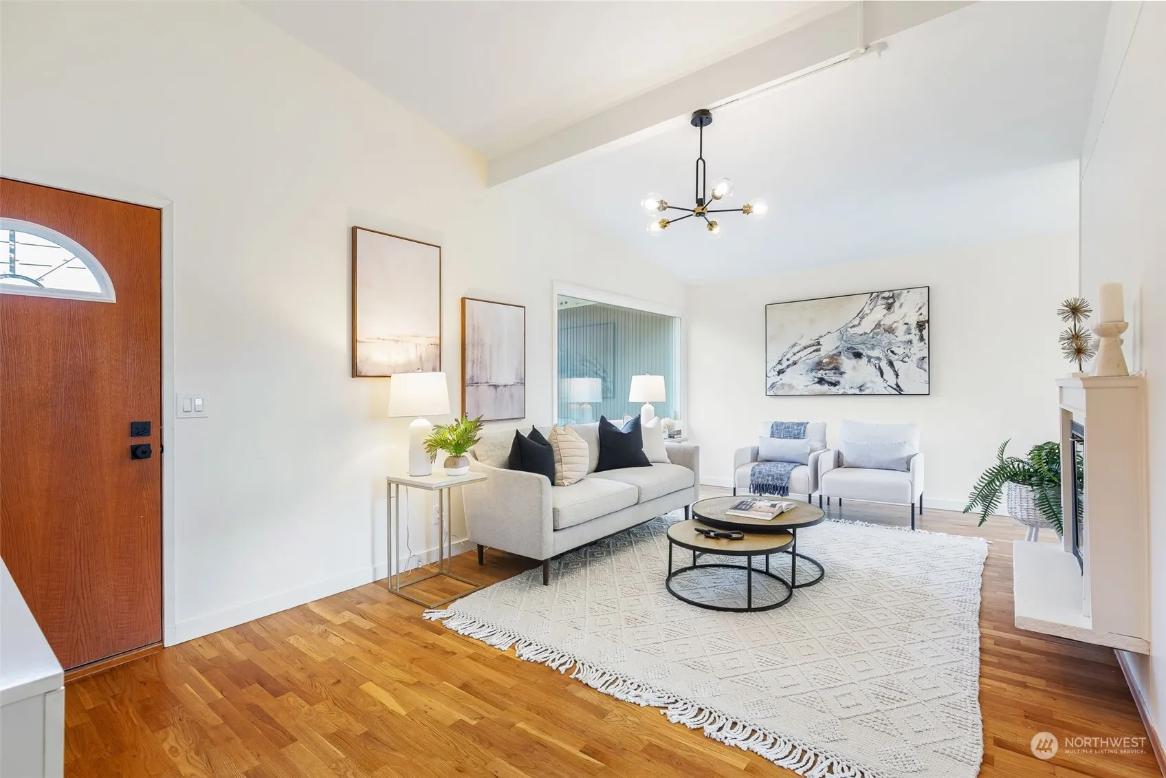 Warm & welcoming, this one-level, Mid-Century Modern, resides in a quiet residential neighborhood with new finishes inside & out. The large oversized yard, offers mature landscaping, fruit trees, garden beds, & is fully fenced, with a cute garden shed to boot! Step inside & find vaulted ceilings, gleaming oak hardwoods, new vinyl plank flooring, new doors & trim, interior paint, & a gorgeous new bathroom! The refreshed kitchen features new flooring, painted wood cabinets, all new appliances, & a large pantry. Newer furnace, water heater, brand new electrical panels, & exterior paint, ensure a low maintenance home for years to come. Oversized laundry room, attached garage w/ ample storage, & triple pane windows, complete this timeless gem!