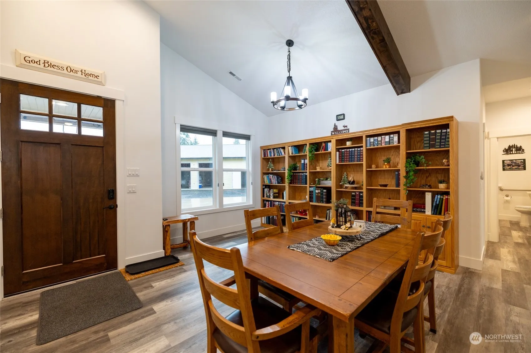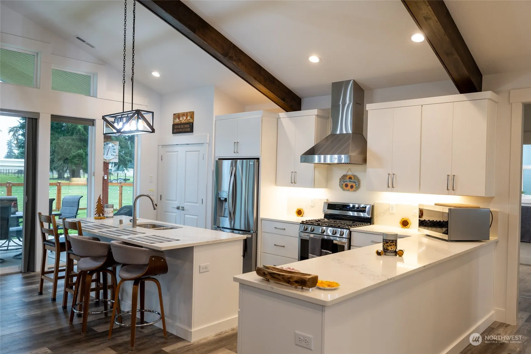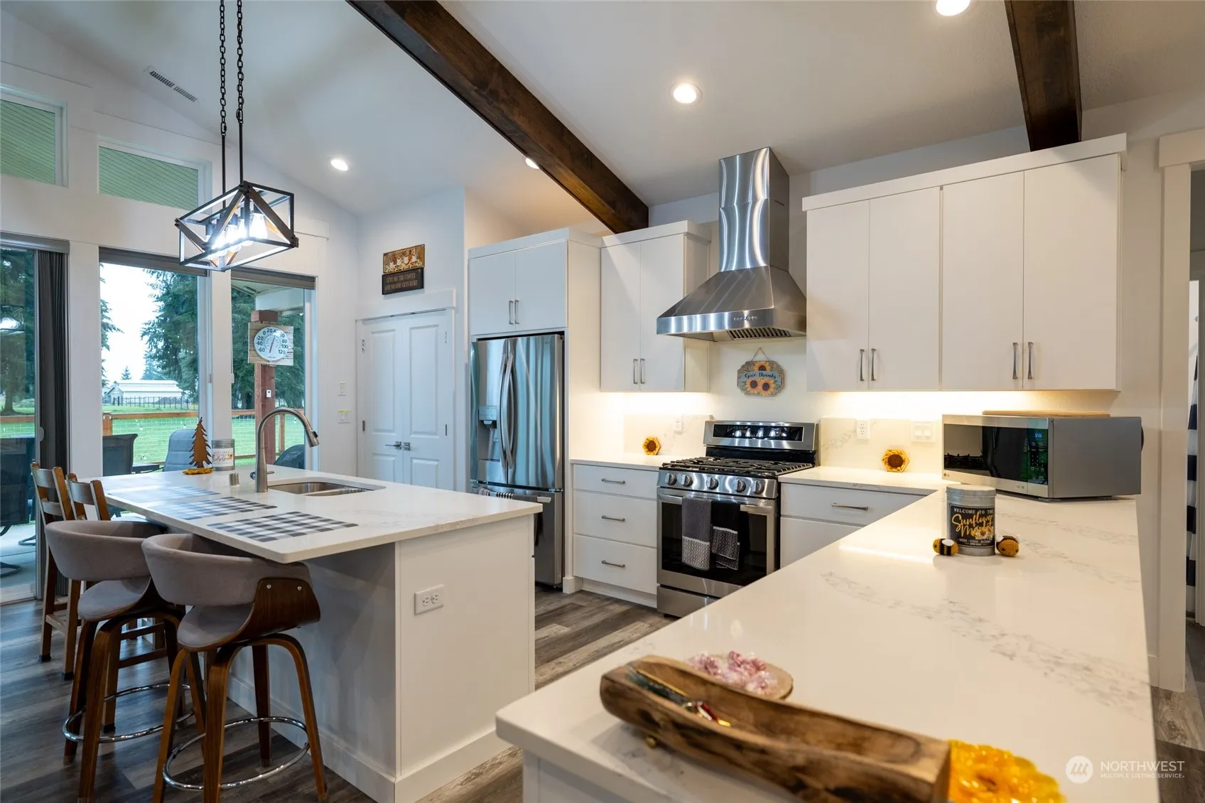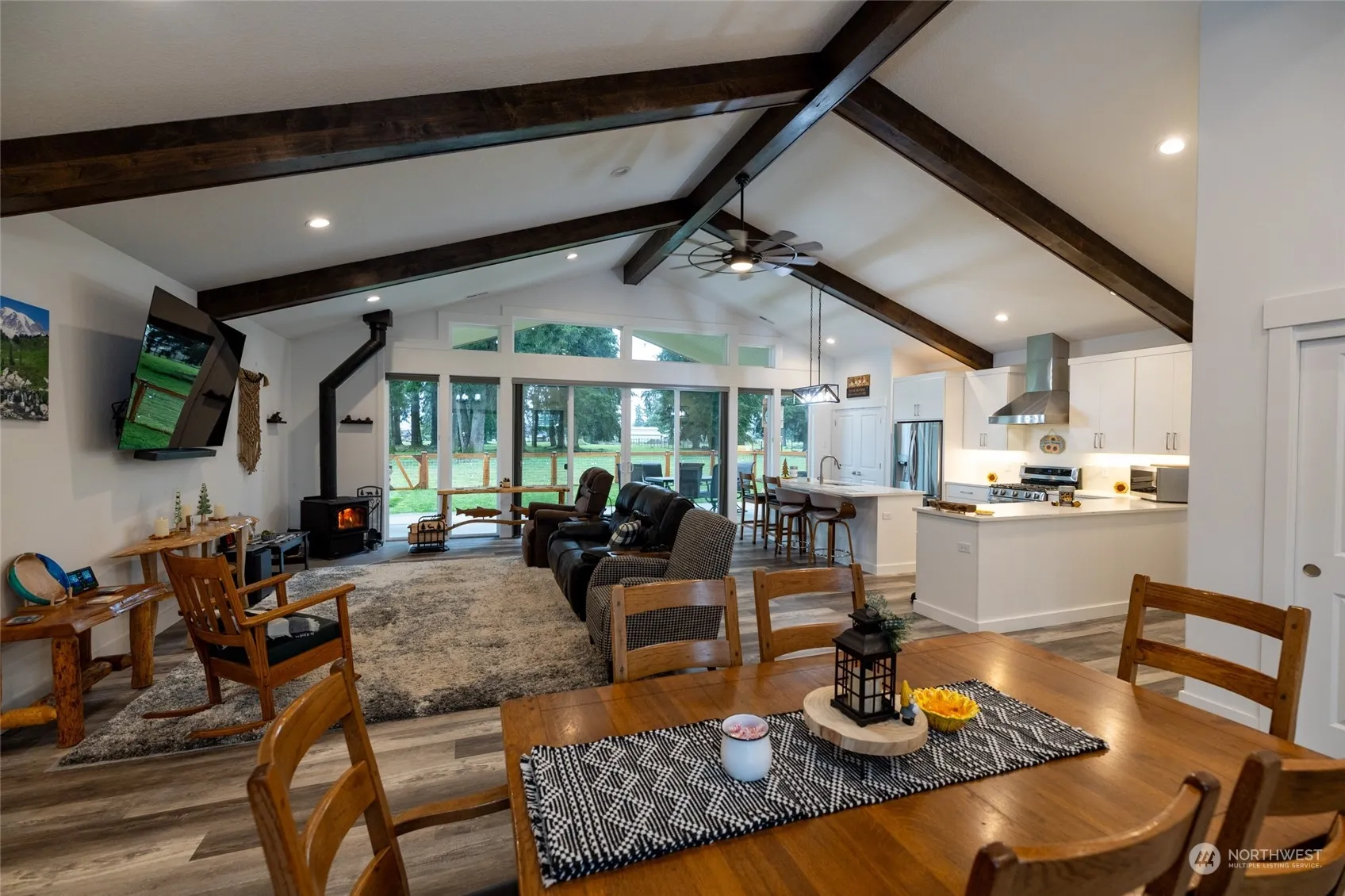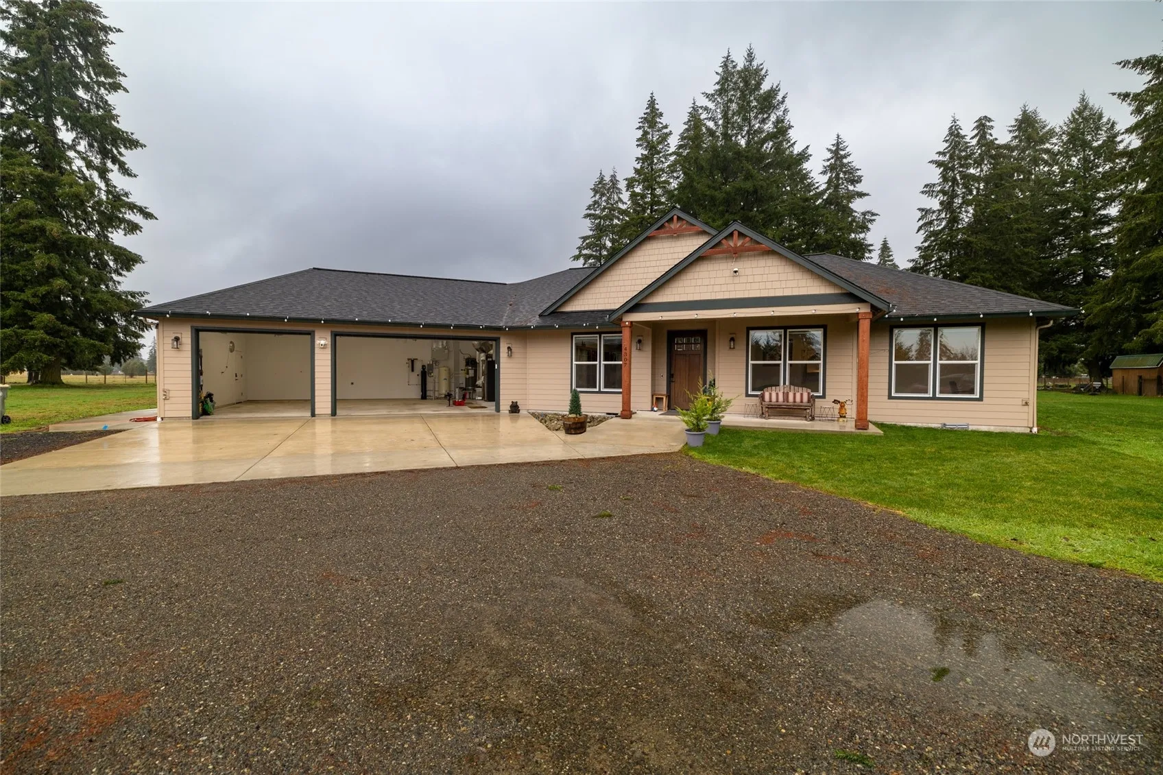 Spectacular nearly new home with upgrades galore sits on 5 fenced and treed acres. Large open concept living room and kitchen w/vaulted ceilings, slider and wall of windows leading to a beautiful outside covered patio area and park like setting. Kitchen has a commercial stove w/a propane cooktop, quartz counters, soft close drawers and ample counter/storage space. Luxury vinyl tile throughout, lighted closets, extra wide doors, electric blinds and a stunning wood entry door. Primary has a large custom bathroom w/ walk in closet and USB’s in both mirrors. Both primary and guest room have a slider to the patio. Heat pump, wood stove, generator, new shop with Electric 200 AMP disconnect on garage, shed, gated entry, wood shelter & flag pole.