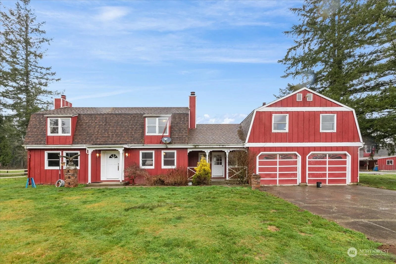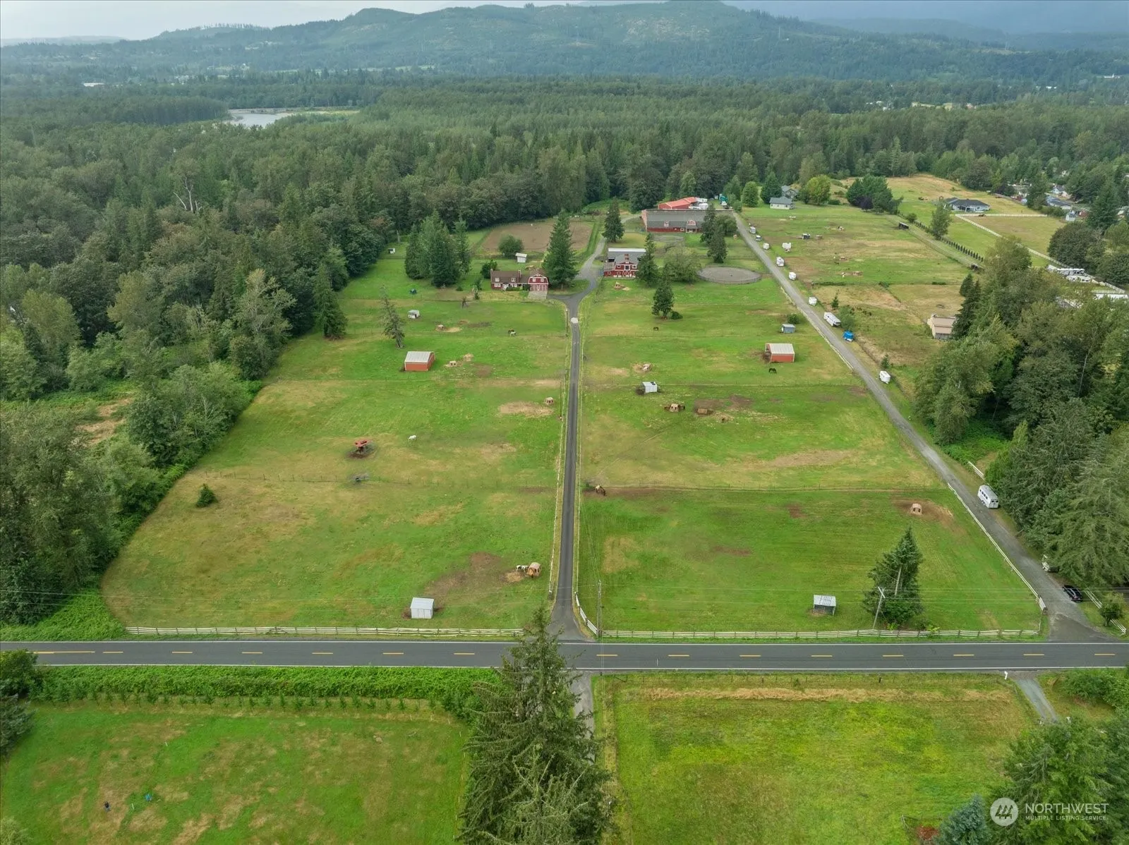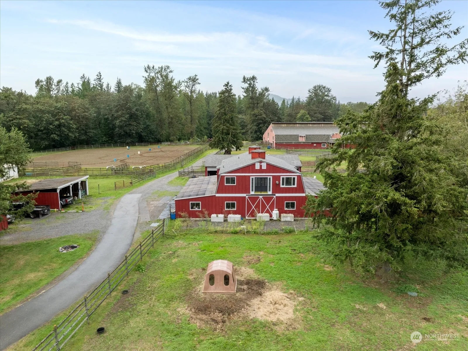 Hidden River Ranch is a 31-acre riverfront equestrian facility tucked along the Skykomish River. Gated entry, crossed fenced pastures with run in shelters, 50 +/- stalls, 70′ X 160′ indoor arena, 250′ X 160′ outdoor arena with roping boxes and cattle pens, hot walker, 100′ round pen with all-weather footing, second round pen, multiple indoor wash racks, grooming bays, hay loft, tack lockers, multiple tack rooms & office. Hay and equipment barn, 5-bay shop, additional shop with workshop space and nearly complete 3 bed/2 bath living space above. 3440 sq foot, 3 bed, 2.5 bath main home with a studio apartment with 3/4 bath above garage. 6 tax parcels. Close to riding trails. THIS PROPERTY SELLS AT AUCTION Friday, January 17th, 2025 at 10 am.