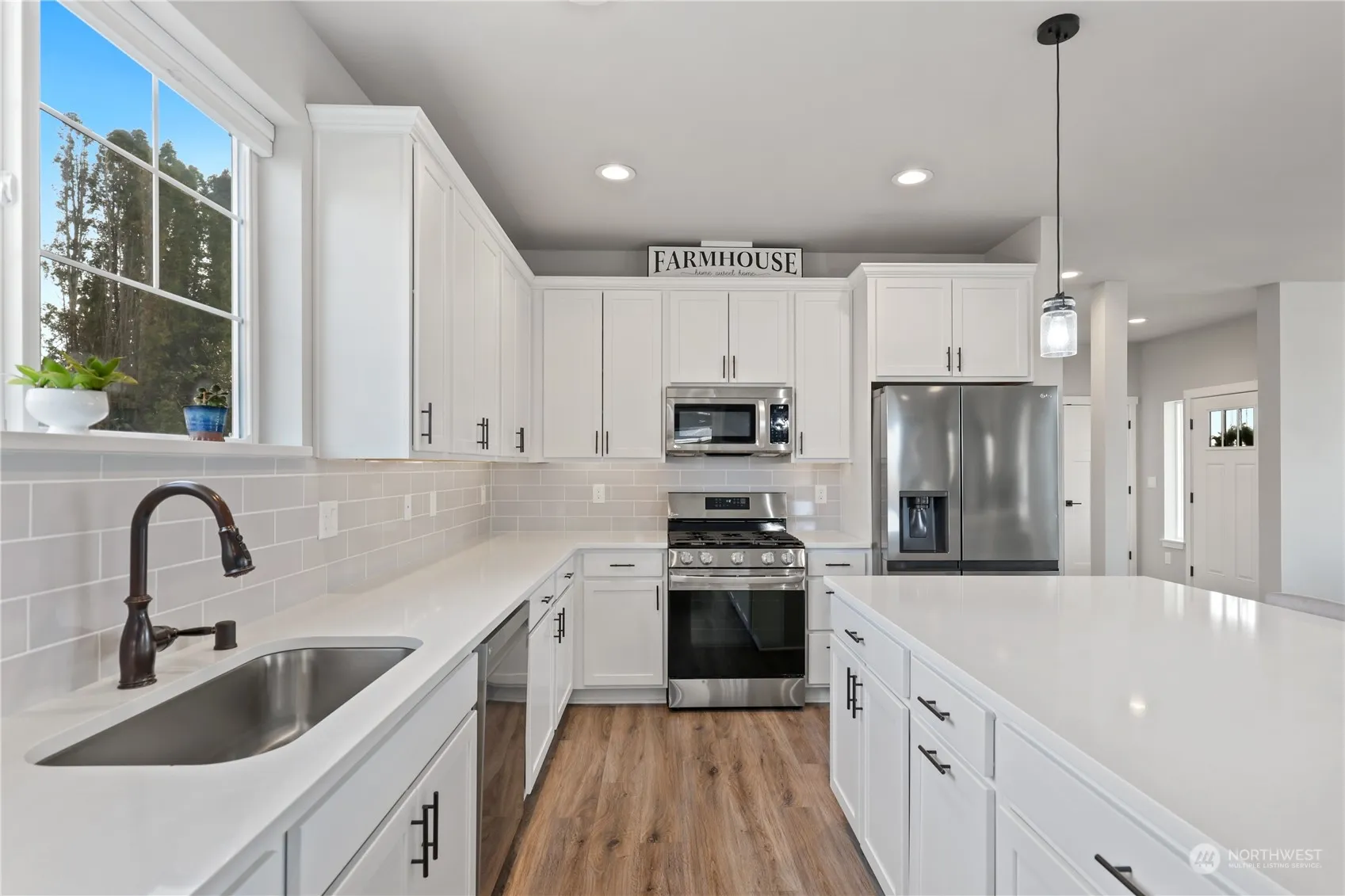 Step into luxury with this stunning 4-bedroom, 2.5-bath home featuring an open-concept floor plan and premium upgrades throughout. Soaring ceilings and stylish flooring enhance the bright, modern design. The chef’s kitchen showcases SS appl., sleek countertops, and a large island with a breakfast bar ideal for entertaining. Relax by the cozy indr/outdr fireplace, perfect for year round warmth, and enjoy the custom covered patio thoughtfully added by the seller. The spacious primary suite offers a spa-like en suite retreat, while three additional generously sized bedrooms offer versatility. An oversized garage, full utility room, and beautifully landscaped yard with finished patios and raised garden beds complete the home. A true must-see!