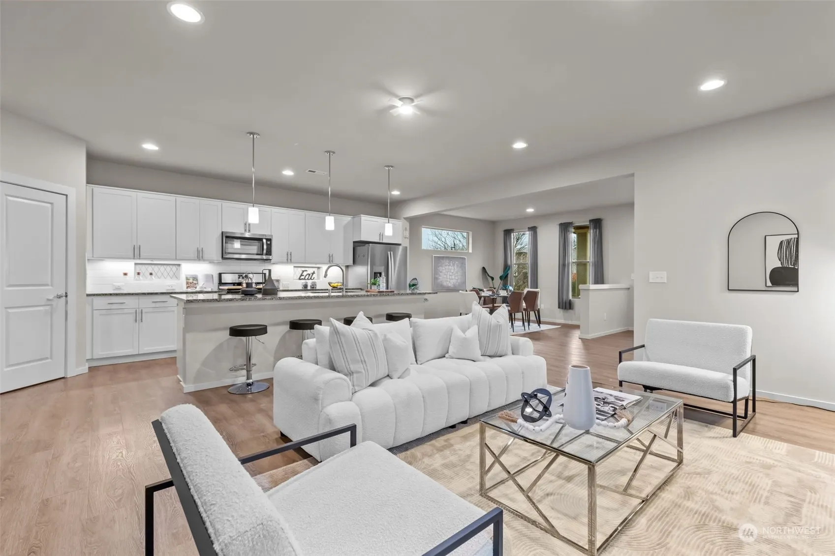 This 4-bedroom home combines modern elegance with everyday convenience. The open-concept features an island kitchen with granite countertops, a full-height backsplash, under-cabinet lighting, and gas range. Enjoy the loft space for endless possibilities and a den ideal for a playroom, office, mother-in-law suite. The primary suite boasts a vaulted ceiling, spa-like bath with a freestanding tub for ultimate relaxation. The covered patio, fully fenced, and low-maintenance yard are ideal for entertaining year-round. Additional perks include a 2-car garage with a shop space, laundry room with a convenient cabinet and sink, HOA-provided gigabit internet, and front yard maintenance. MOTIVATED SELLERS.