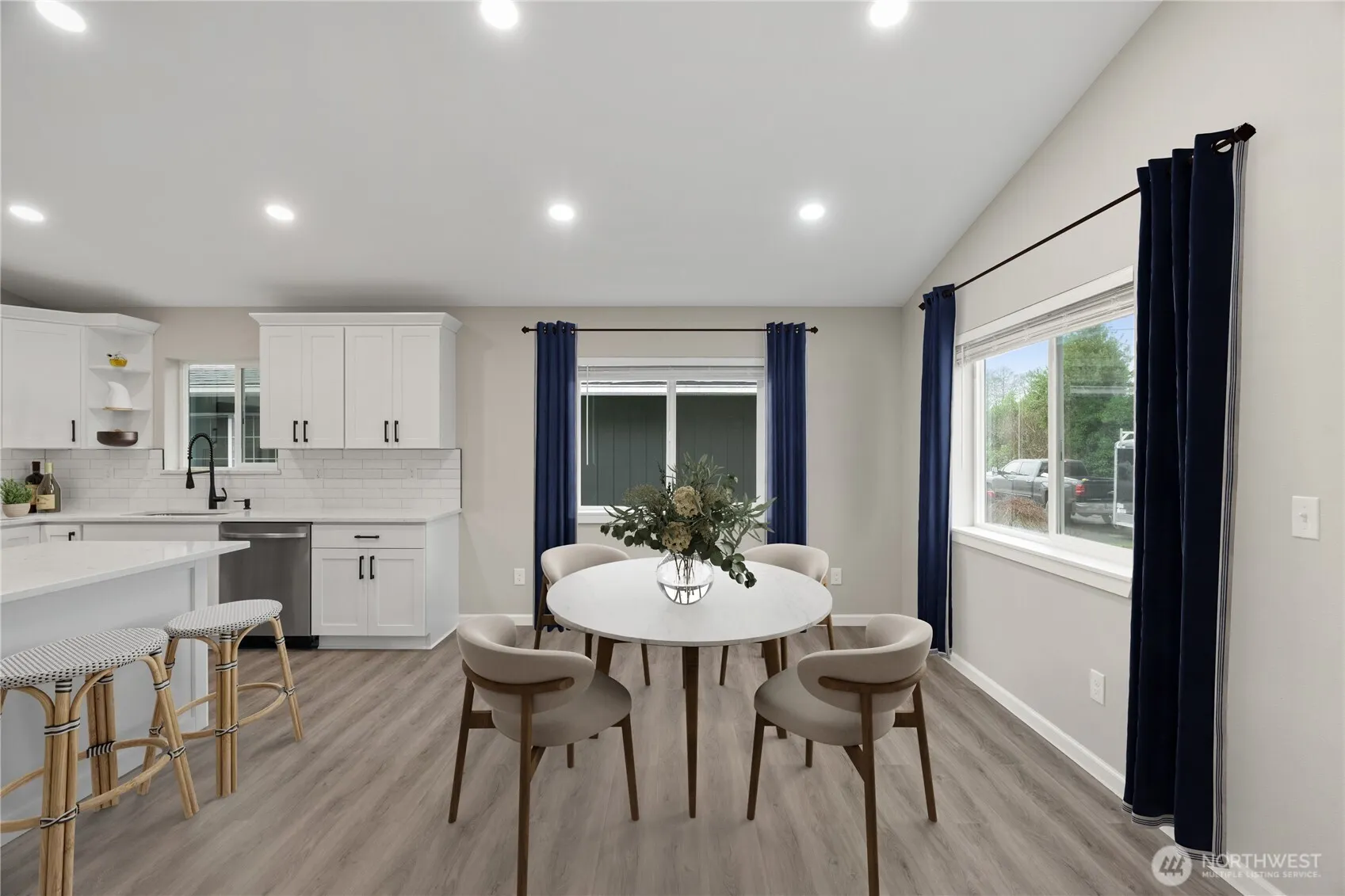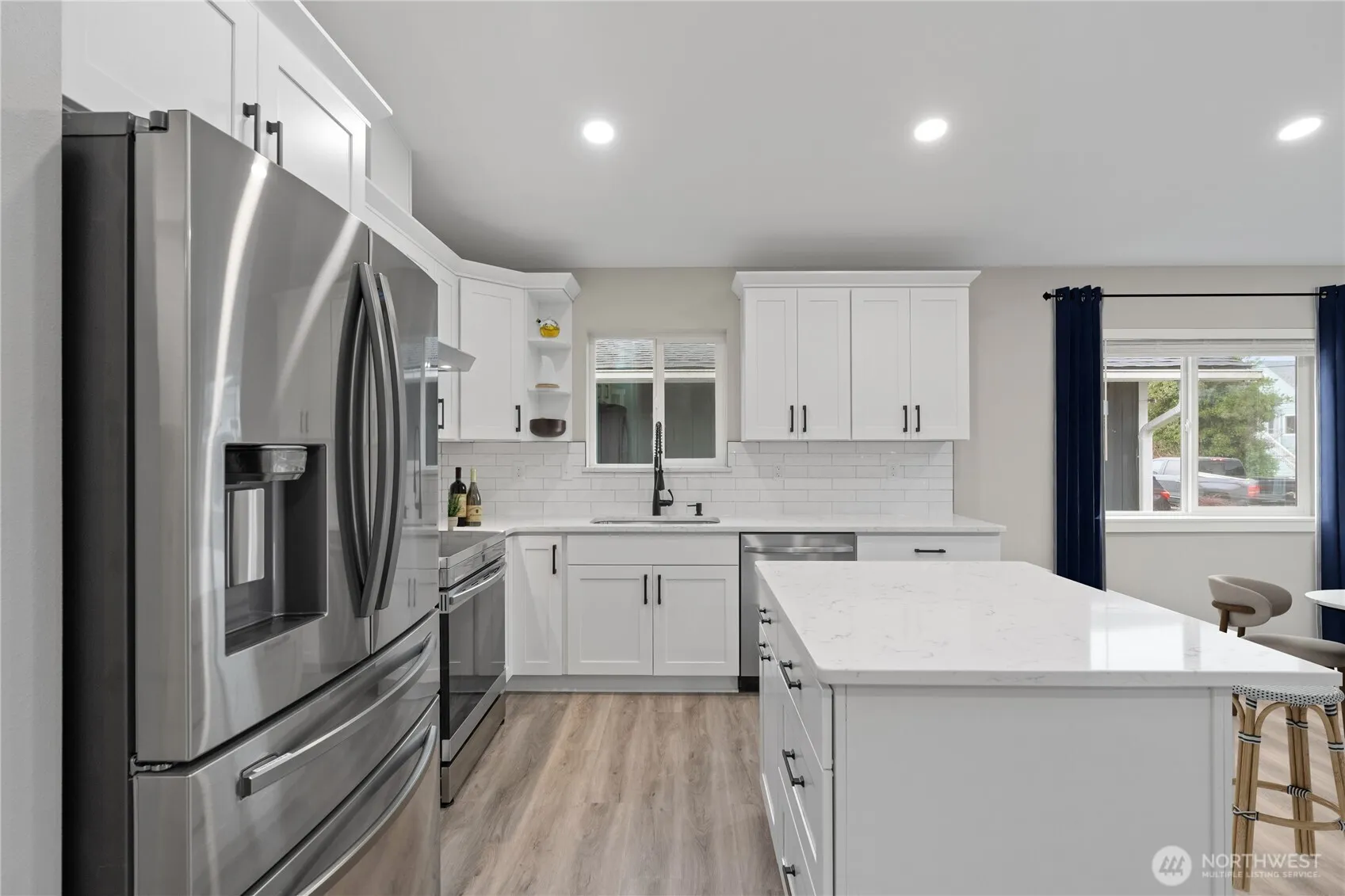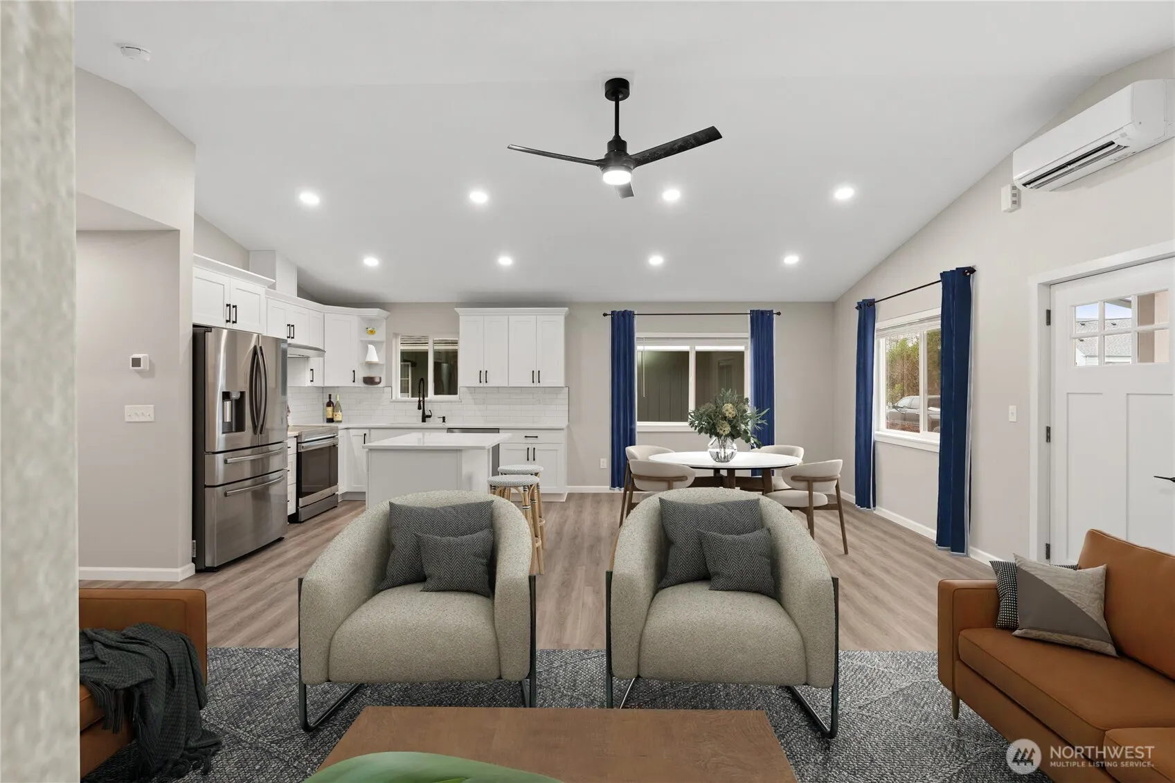Just completed in South Aberdeen, this 2024 new build home boasts a 3 bedroom, 1.75 bath w/ 1370 sq. ft. of living space. The open concept design includes vaulted ceilings, laminate flooring, ductless mini-split providing ac/heat, LED recess lighting, kitchen w/ white-on-white cabinets/quartz countertops throughout and brand new stainless steel appliances. Beyond the living room, on your left is the fully functional laundry room leading to one-car garage w/ side entrance/exit and main bedroom w/ walk-in closet and off primary bathroom w/ barn style door and stand up shower. Down the hallway on the right are 2 additional bedroom w/ closets and rear entrance/exit to the home w/ grass seeded back yard.