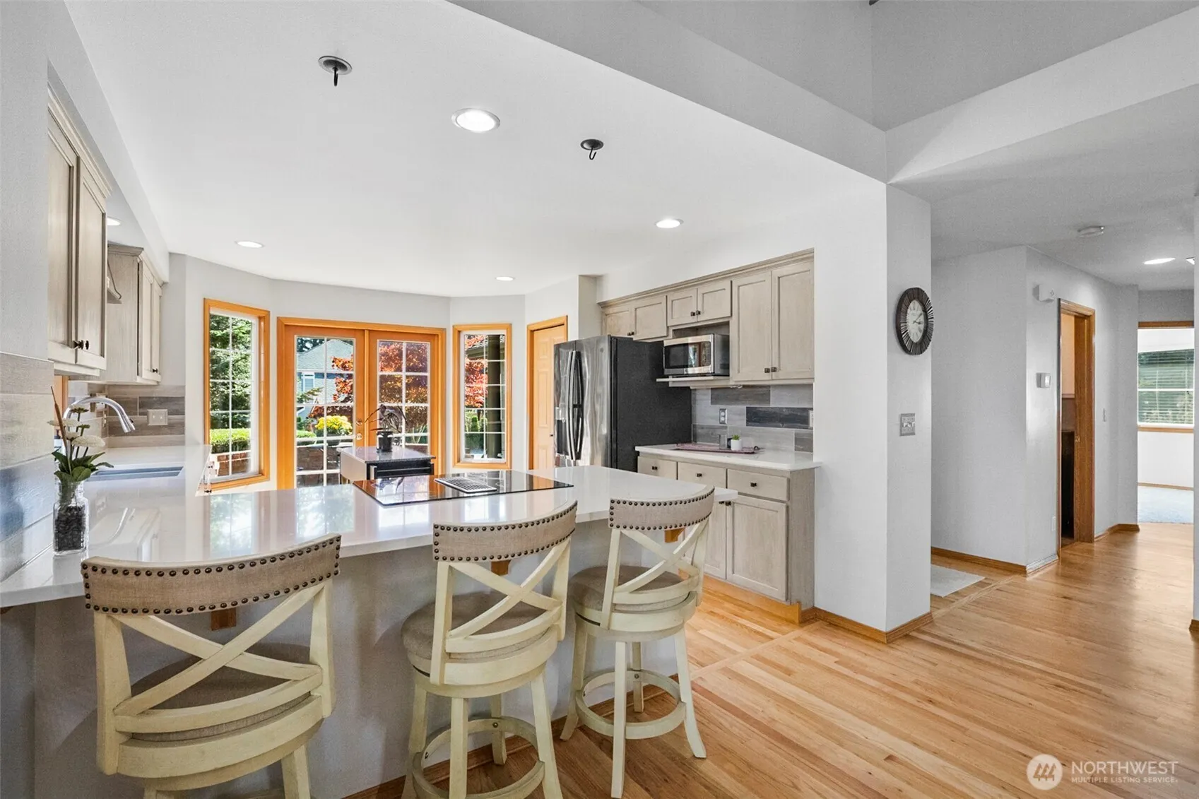 Outstanding Community of Gold Creek. Rambler with bonus room & office on upper level. 3 bedrooms & 2.5 bathrooms. Updated kitchen w/quartz countertops, full backsplash, pantry & French doors to front patio. Great room/dining space w/vaulted ceiling, hardwood floors, wet bar w/quartz counter, glass faced cabinets & beverage fridge. Large family rm w/French doors, built-in cabinets, gas frplc, 2nd set of French doors to beautiful yard w/entertainment patio. Primary suite w/built-in cabinet, walk-in closet, gorgeously updated 5-piece bath w/quartz counters, soaking tub & luxurious shower. Bonus rm w/skylights. AC, RV parking & sprinkler system. Parks, tennis courts & walking trails. Excellent schools! $10,000 buyer closing cost credit!