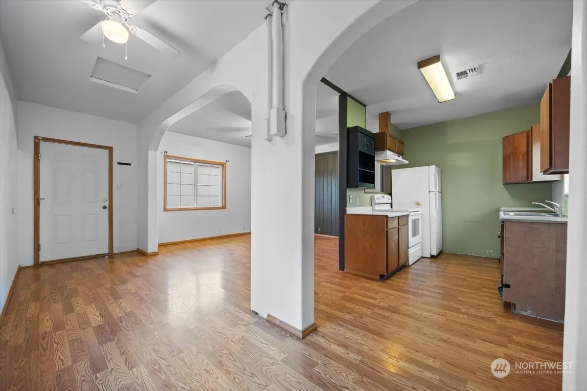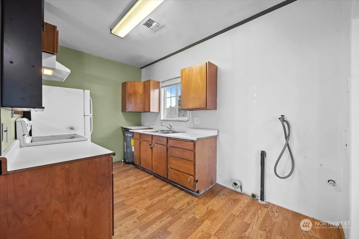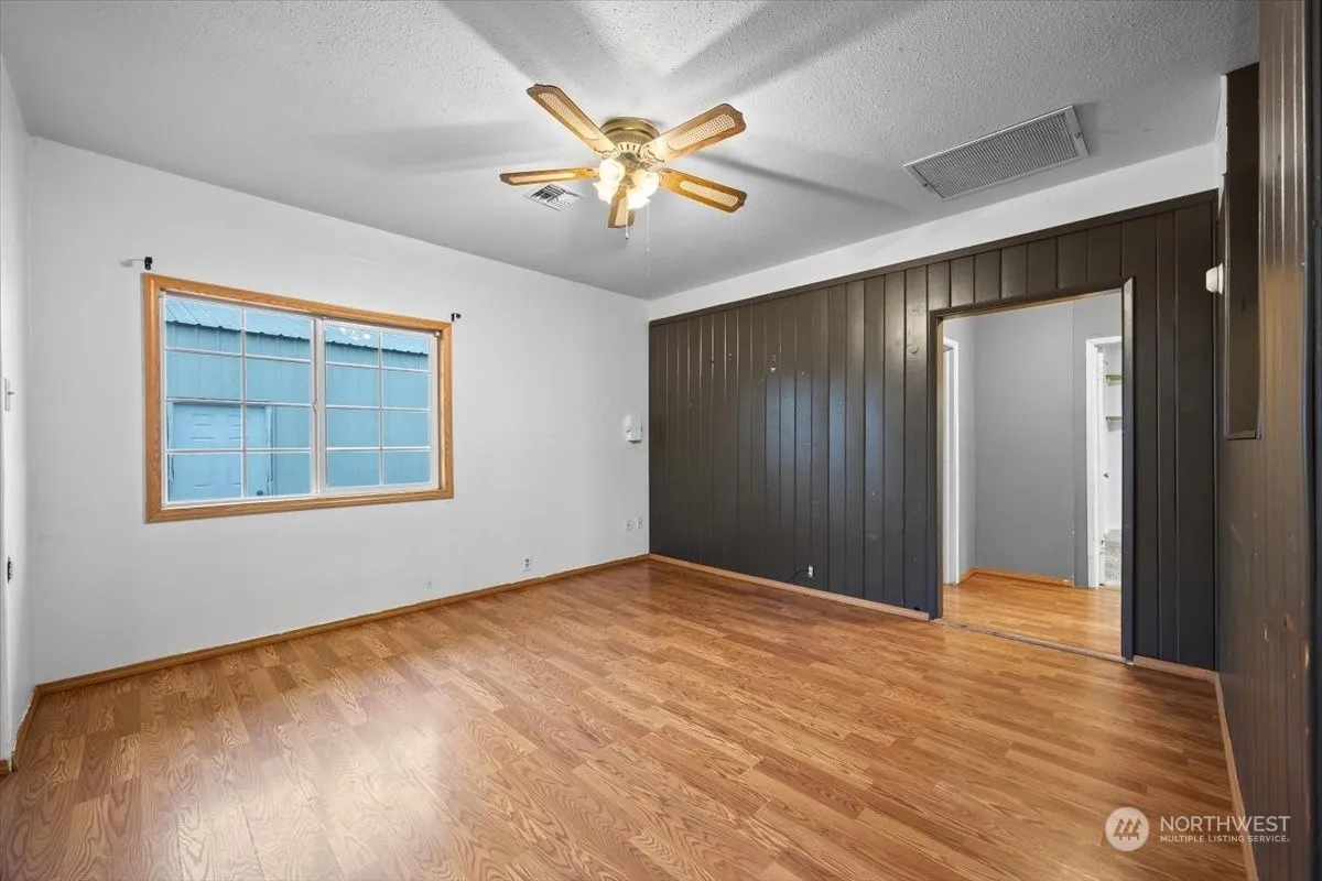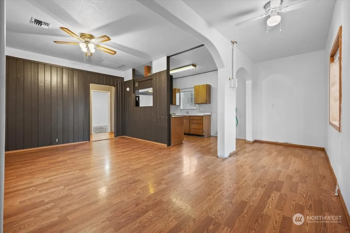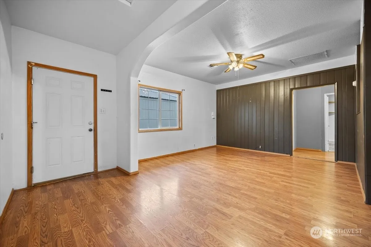 Great Starter Home or Investment home with a 24×24 shop! 2 bdrms, 1 ba, raised ceilings, laminate flooring, lots of parking space, dbl closets in one bdrm, partially fenced yard, corner lot, central heat & air, got to see for the opportunity and potential this home has.