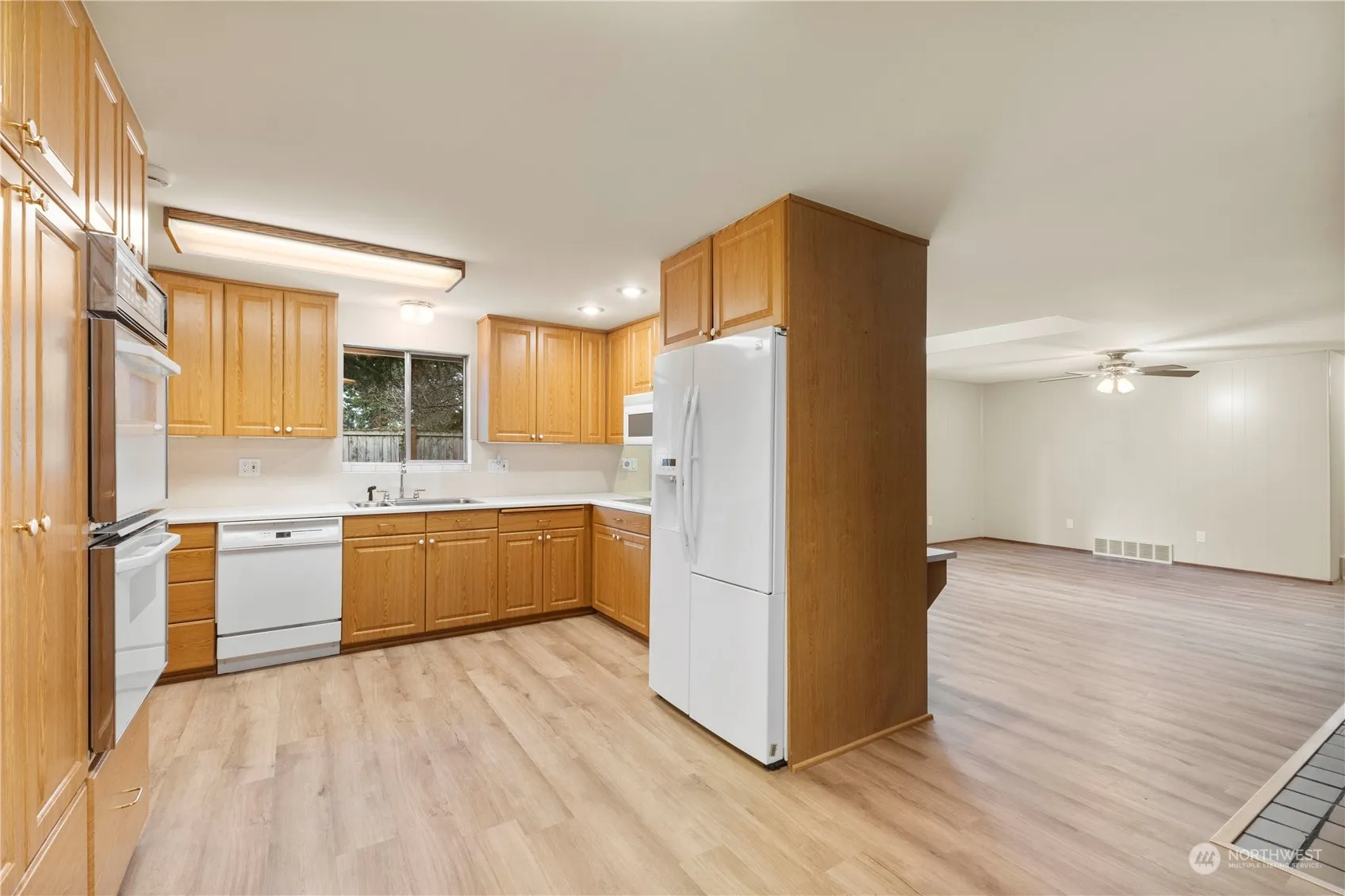 2,480 sq. ft. rambler, on nearly 1/4-acre! Home boasts Many updates including a new roof, gutters, fresh interior paint, & stylish wood plank flooring, just to name a few. The kitchen features a smooth cooktop, double ovens, & custom cabinetry w/pull-outs in each of the cabinets & the pantry. Extra-large utility room w/ extra storage. The double-sided fireplace features a cozy insert and an indoor BBQ. Enjoy your AC in the warm months. Primary bedrrom has private bath with walkin shower w/ grab bars. The oversized two-car garage includes a workshop w/plumbing—perfect for adding a 3/4 bath. Large yard, complete w/fruit trees, raised beds, a large shed w/ power, & a patio for entertaining. Home is wired for a generator for added convenience
