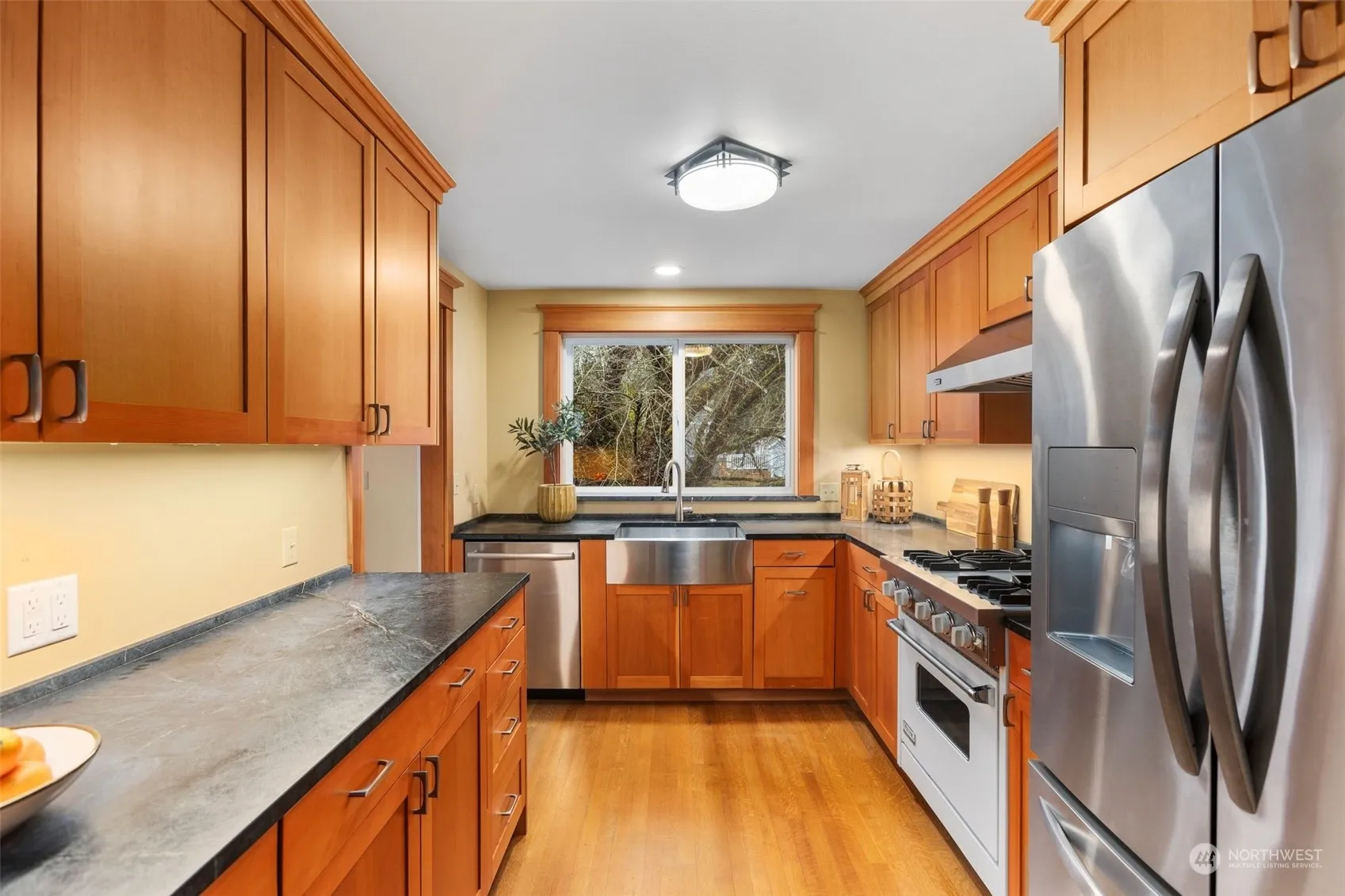 Discover timeless craftsmanship in this custom mountain home, where exquisite clear fir trim and gleaming hardwood floors create an elegant backdrop. The remodeled kitchen showcases handcrafted fir cabinetry, soapstone counters, and professional Viking appliances including a stunning range and hood. Dramatic Mt. Si views frame the living spaces, while walls of windows invite natural light to dance across the fine details. The expansive Tigerwood deck provides a perfect setting for outdoor entertaining against a mountain backdrop. Located in charming downtown Snoqualmie, this residence captures the essence of Pacific Northwest living. New 2021 roof for peace of mind, plus an oversized 700 sq ft garage for abundant storage.