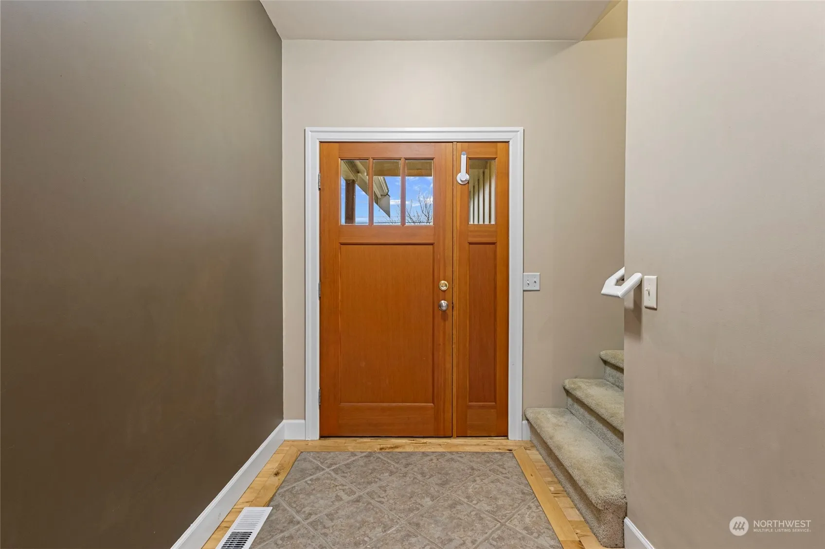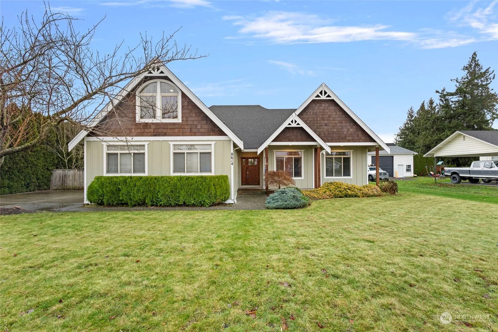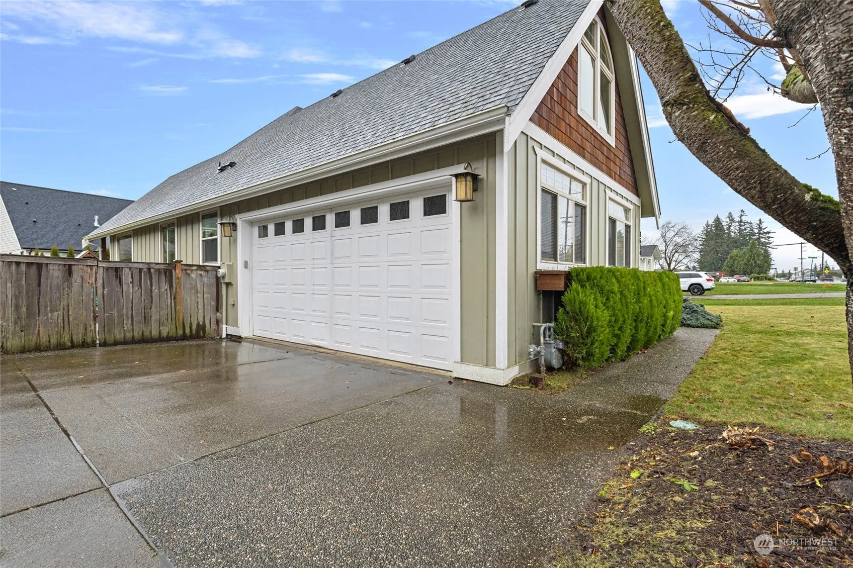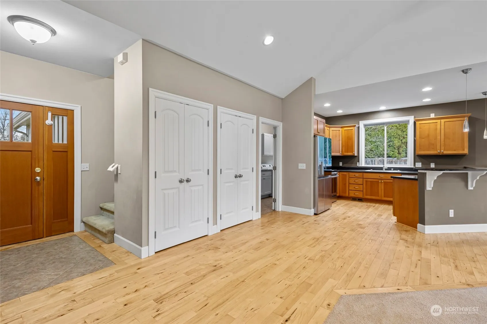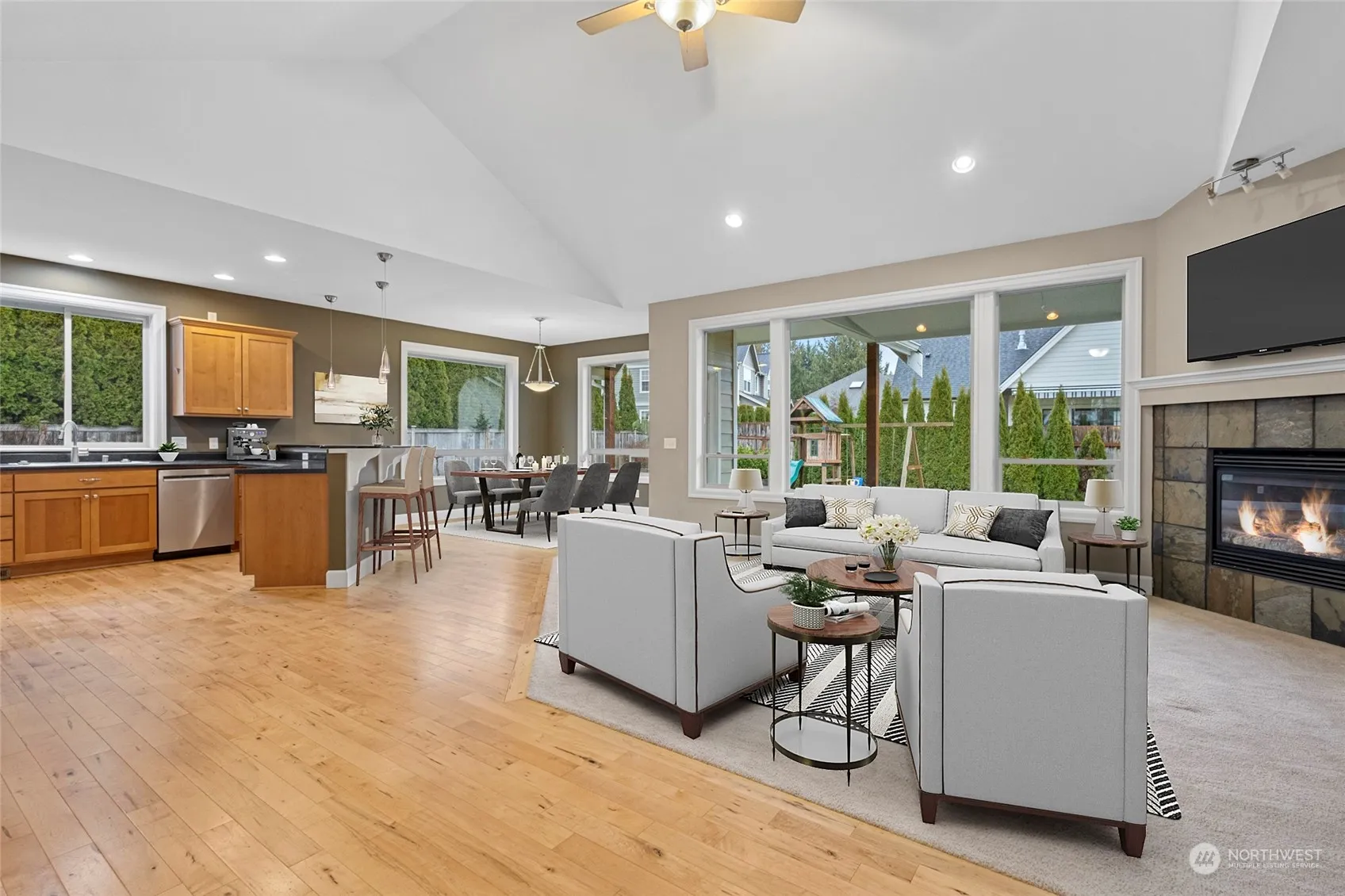 This 3 bed 2 bath home features a functional single-level layout with an upstairs flex space. The vaulted great room, with large windows and a gas fireplace, seamlessly flows to the kitchen. The kitchen features alder wood cabinets, an eating bar, pantry, and newer oven, dishwasher and fridge. Maple hardwood floors and a laundry room with tile flooring and a deep sink add practicality. The primary suite includes oversized windows, a walk-in closet with built-in shelving, a jetted tub, and a double-sink vanity. Outside, enjoy a fully fenced yard with in-ground irrigation, a covered deck, patio, and a retaining wall. With central AC, and modern updates, this home is ready to move in.