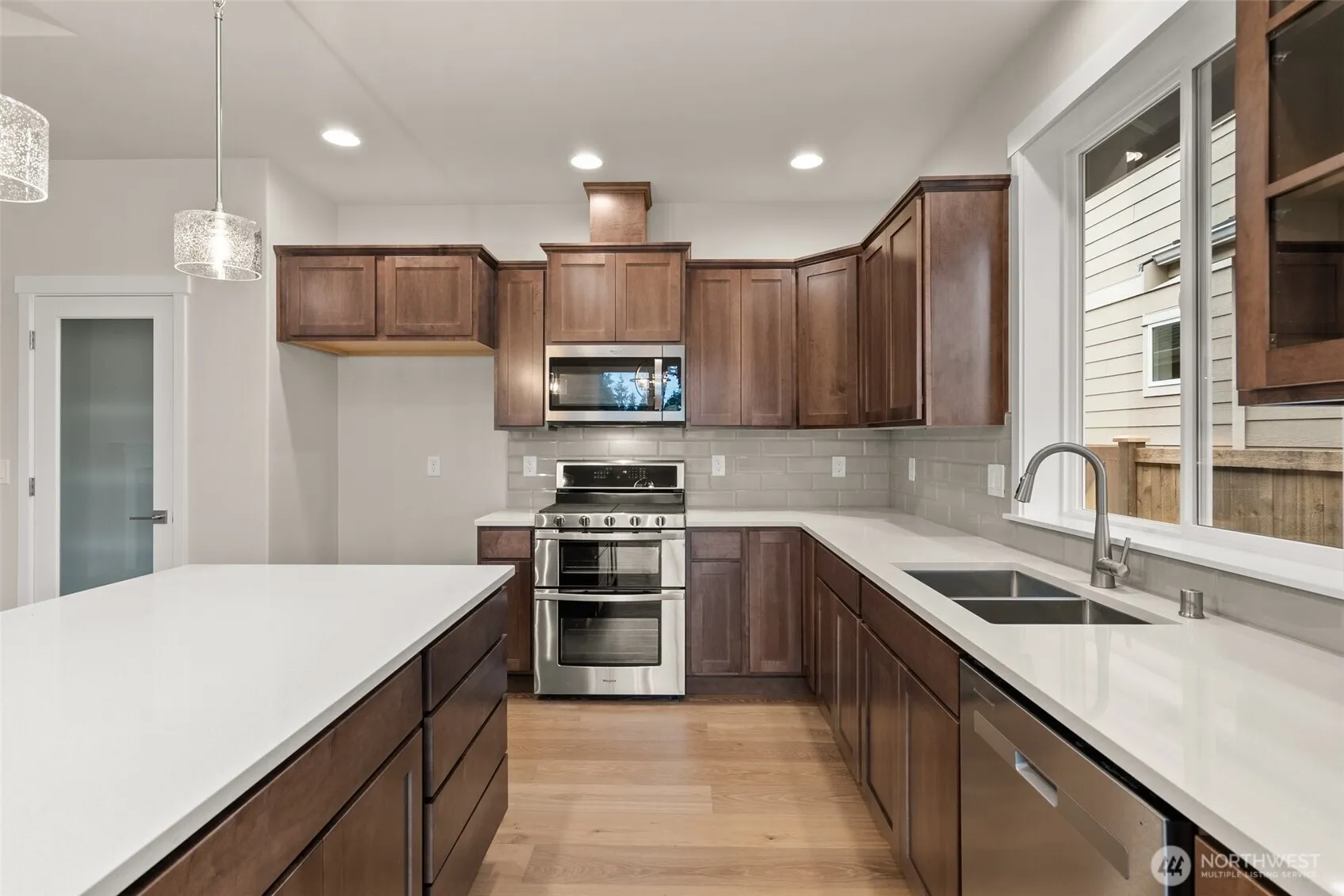 Discover Tumwater’s Skyview Estates by local builder Rob Rice Homes where elegance and convenience meet! Rare single-level 3-bed/2-bath plan spans 1944 sf. Kitchen boasts quartz counters with full tile back splash, Maple “Cocoa” shaker cabinets, gas range, and opens to vaulted great room with fireplace. Entry, kitchen & dining feature engineered hardwood flooring, quartz counter tops throughout. Enjoy the outdoors on the covered patio, fully landscaped yard with privacy fencing! Energy-efficient features include solar panels, heat pump for heating/cooling, and electric hybrid hot water. Ideal location near Black Hills High, Costco, and quick I-5 access.