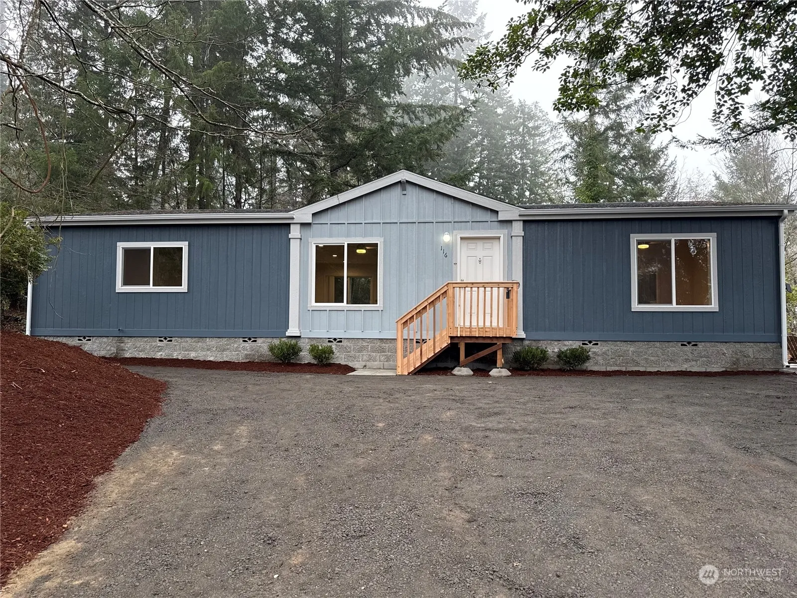 Brand new VIEW home 3 bedroom 1 and 3/4 bath 1500 sq ft on .27 acre lot with view of the Hood Canal. Home features open concept floor plan, laundry room, kitchen with eating space, living room, and three spacious bedrooms. Fully landscaped with low maintenace landscaping, lots of parking, large patio area great for sitting by the fire and enjoying the views. Spacious outbuilding for outdoor storage. Convenient location close to schools, shopping, and busline. Community saltwater park and community pool.