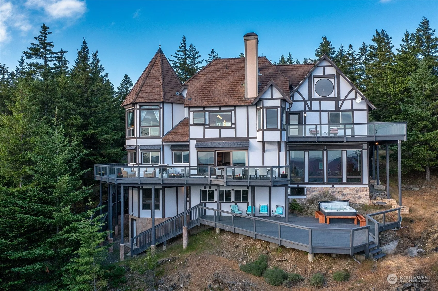 INCREDIBLE INCOME PROPERTY with over $160k in 2025 reservations already booked! This hilltop retreat enjoys panoramic views & stunning sunsets over distant islands. This spacious 6,000SF chateau is The LARGEST ACTIVE VACATION RENTAL in the islands sleeping 16 with new 11bd septic system. A successful rental with dozens of upcoming bookings at $1,100-2,100/night, this venue has hosted small weddings, retreats, large families and groups of friends coming together to enjoy a spacious home & beautiful grounds overlooking the Salish Sea with custom details and infinite privacy. Chef’s kitchen, theatre, bar/game room, multiple decks, hot tub, greenhouse & more on 5+ acres conveniently located near the village yet a world away.