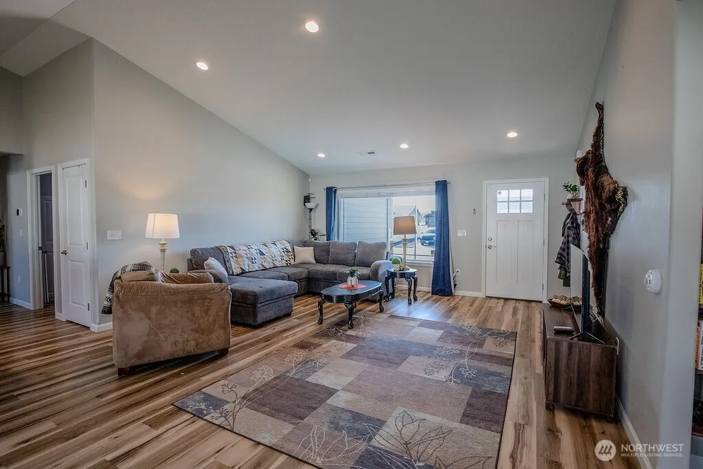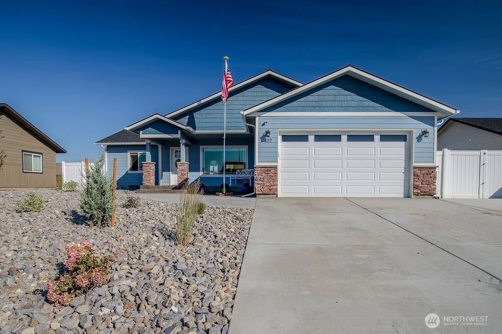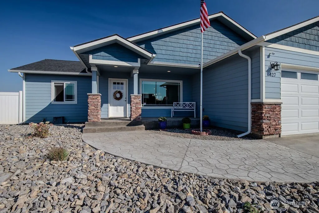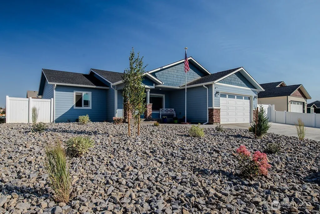 Fantastic home in a great neighborhood. 3 bedrooms, 1 3/4 baths with a large primary bedroom suite and open floor plan. The great room has a vaulted ceiling with the kitchen featuring a large island, solid surface counter top and beautiful soft-close cabinets. The primary bathroom and guest bathroom also have solid surface counter tops. The attached, finished garage has additional concrete next to it for your boat, RV or guest parking. Vinyl fenced back yard can be accessed off the alley or through double gate in the front. Relaxing under the large covered back patio sounds perfect after a long day. Concrete curbing and firepit are great features. Front yard is drought resistant design.