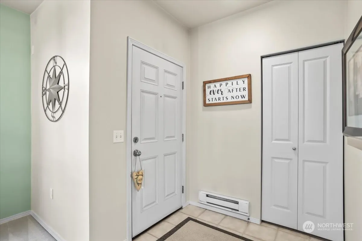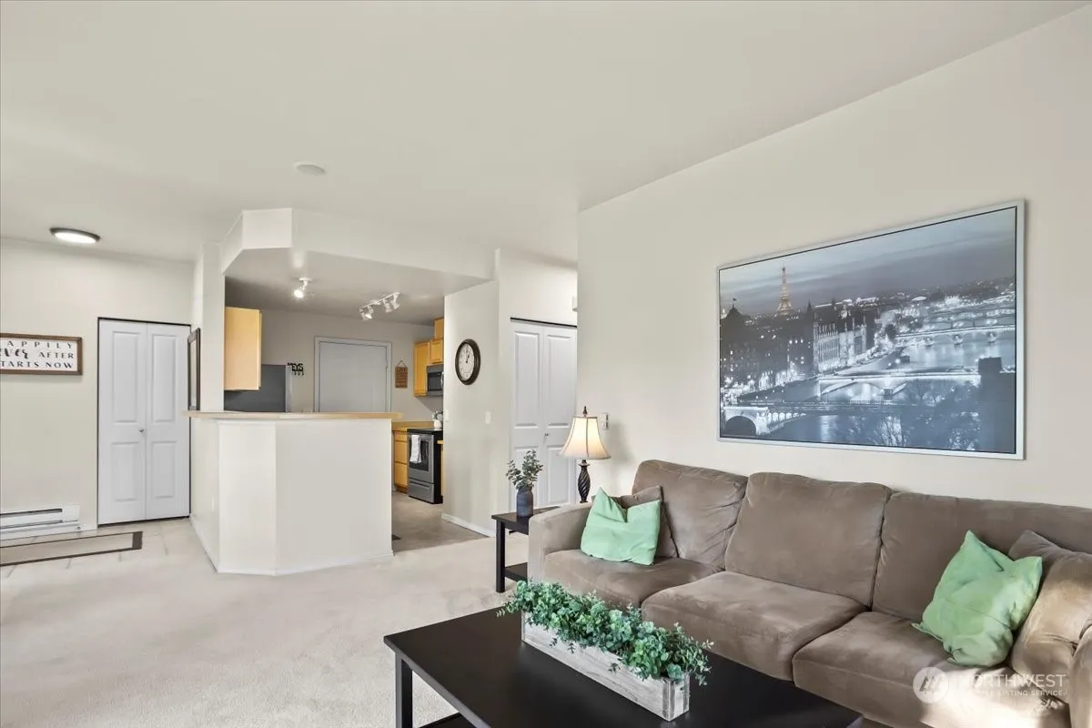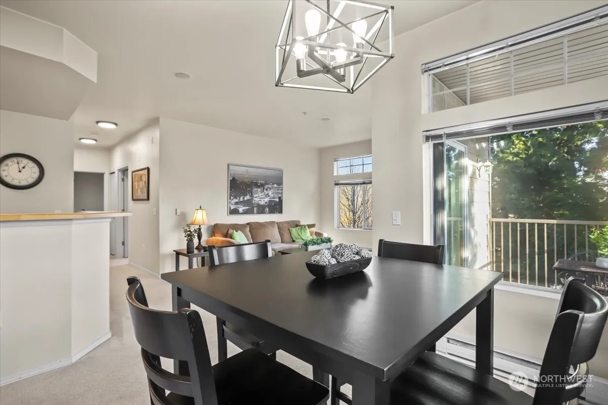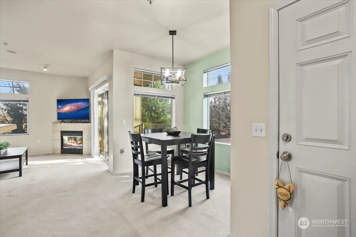 Welcome home to this desirable single-level condo in River Ridge! Upon entrance, you will be greeted with an open floor plan, soaring ceilings and an abundance of natural light throughout. This 2 bed/2 bath main floor end unit condo offers the largest one car garage in the community, providing plenty of storage. The spacious kitchen flows nicely into the dining area & family room with an electric fireplace, along with your deck to enjoy scenic views surrounded by mature landscaping. Expansive primary bed w/ 5-piece bath & walk in closet. Large secondary bedroom with full hallway bath. Community playground & sports court. No rental cap! Low HOA dues, strong reserves. Easy freeway access. Comfort & convenience at its finest. Make this yours!