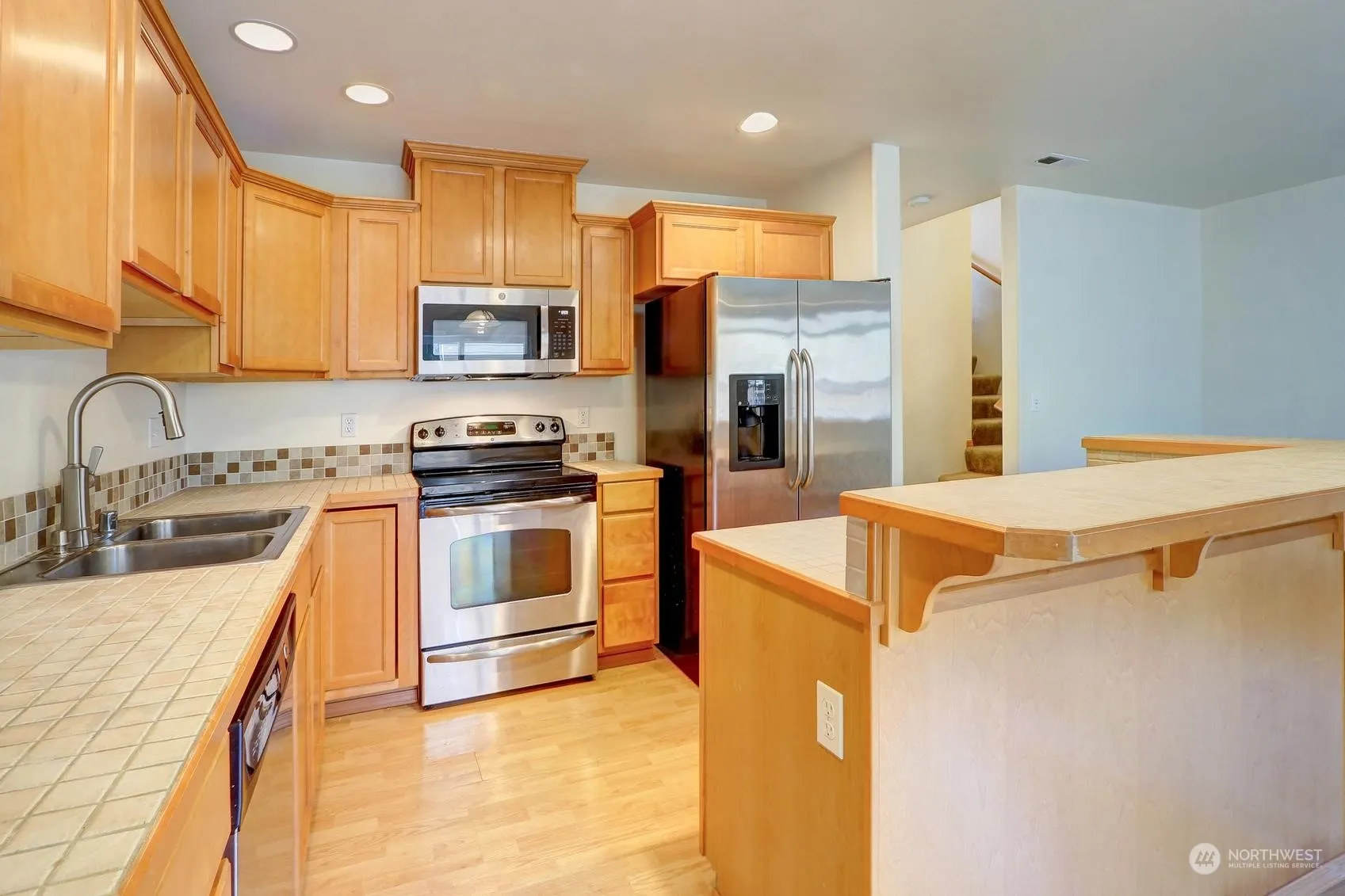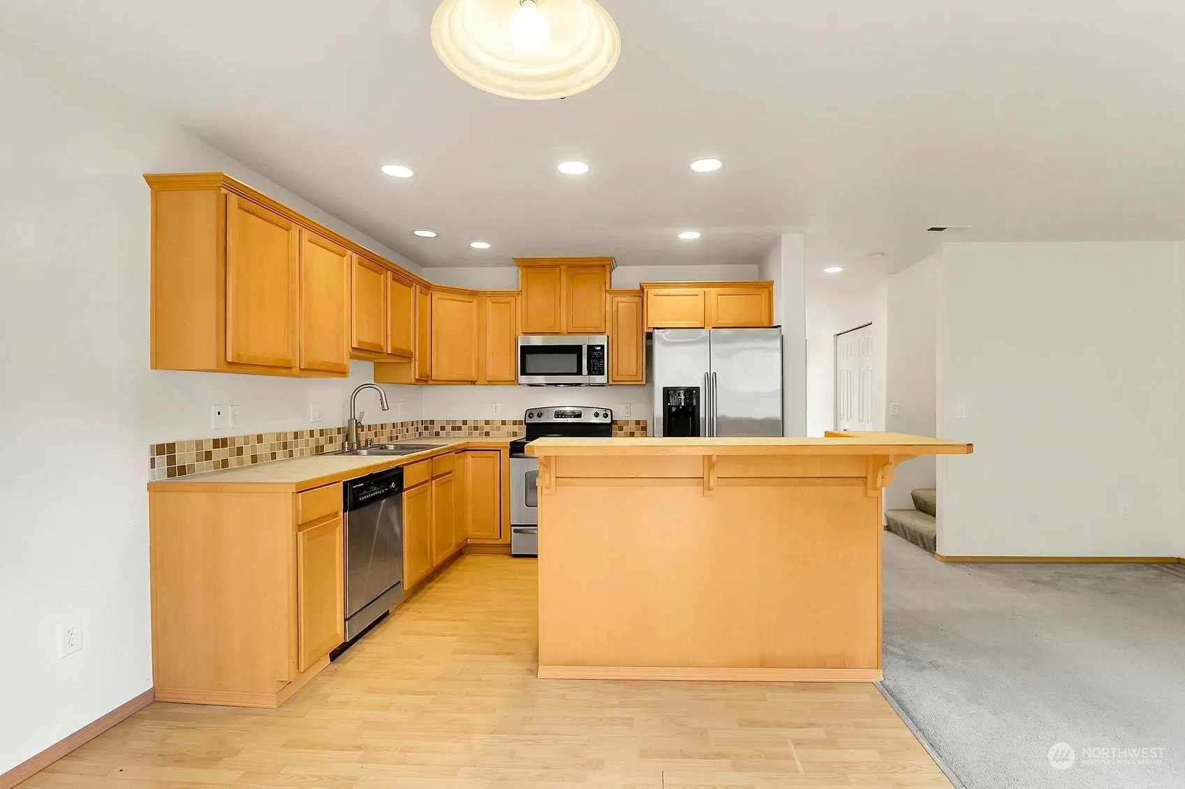 Situated in Pilchuck Village, this delightful townhome features a single car garage and a covered front porch, enhanced by mature plantings for privacy. The interior includes a kitchen with a center island/eating bar and an adjacent eating area that opens to the living room, complete with a sliding glass door leading to a private, fenced backyard—ideal for barbecues and relaxation. The upstairs landing is equipped with a built-in study desk suitable for two, perfect for working from home or study sessions. The spacious primary bedroom boasts a walk-in closet and a private full bath. Two additional bedrooms and another full bath ensure plenty of space for comfort. With its convenient location near restaurants, shopping, & schools.