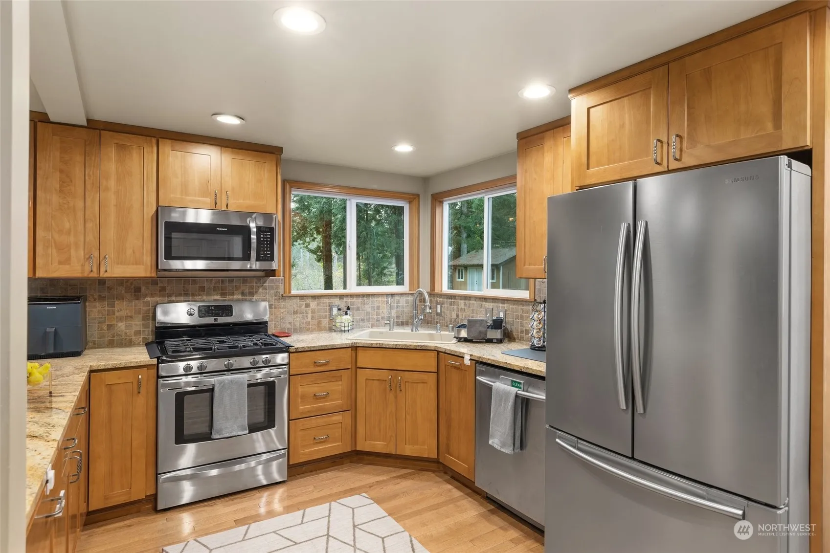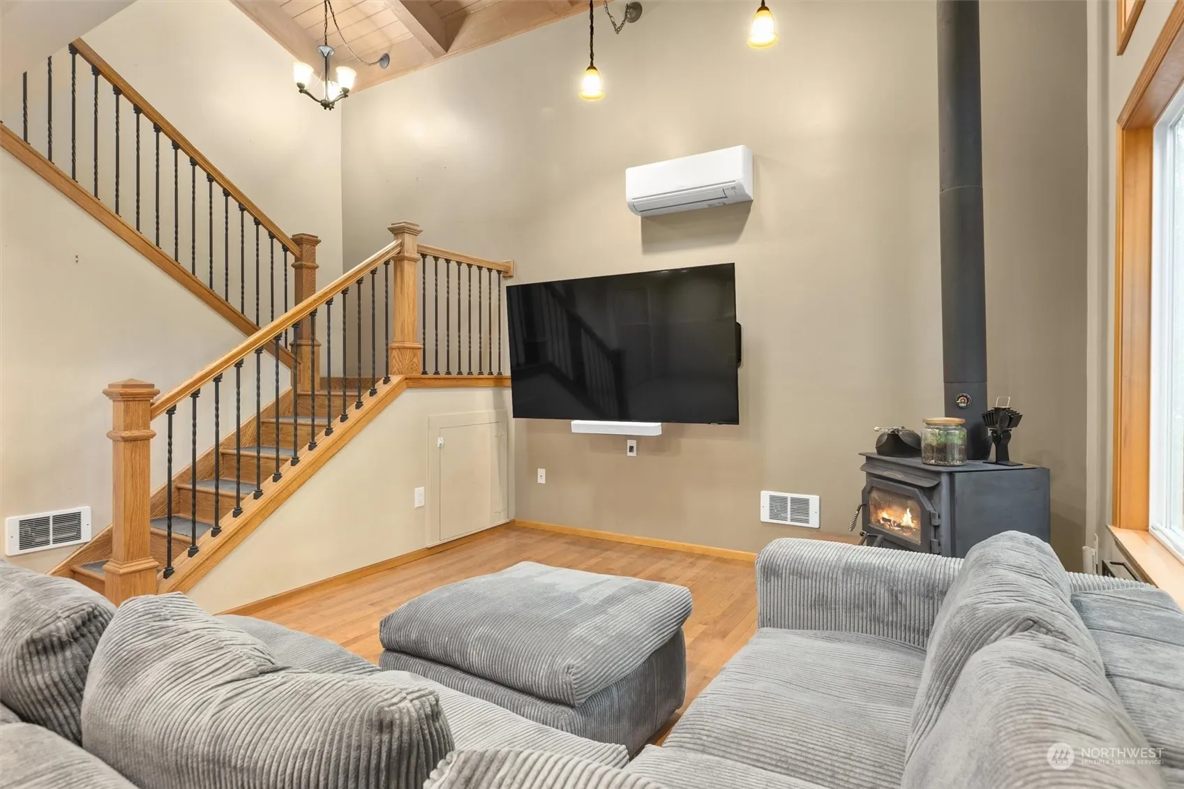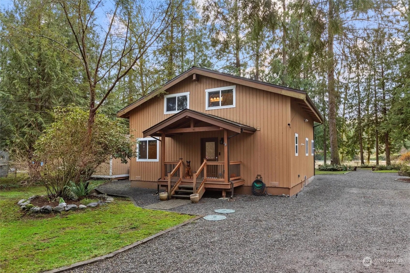 Discover 2.26 acres of serene waterfront living w/270 feet of private sandy beach. This cozy home combines cabin charm w/ modern updates, offering the perfect retreat close to everything. Enjoy wood-wrapped windows, solid wood doors, hardwood floors, & granite countertops throughout. The staircase leads to a primary suite w/an en-suite bath & a second bedroom w/a half bath. Skylights fill the home w/natural light, enhancing its warm ambiance. Modern features include a tankless water heater, mini-split A/C, whole-house water filtration, & Cat 6 wiring. The covered Trex deck, living room, & kitchen provide stunning views of the Sultan River. Two powered outbuildings offer space for storage or a workshop. A rare riverside retreat!