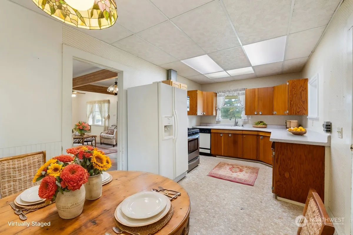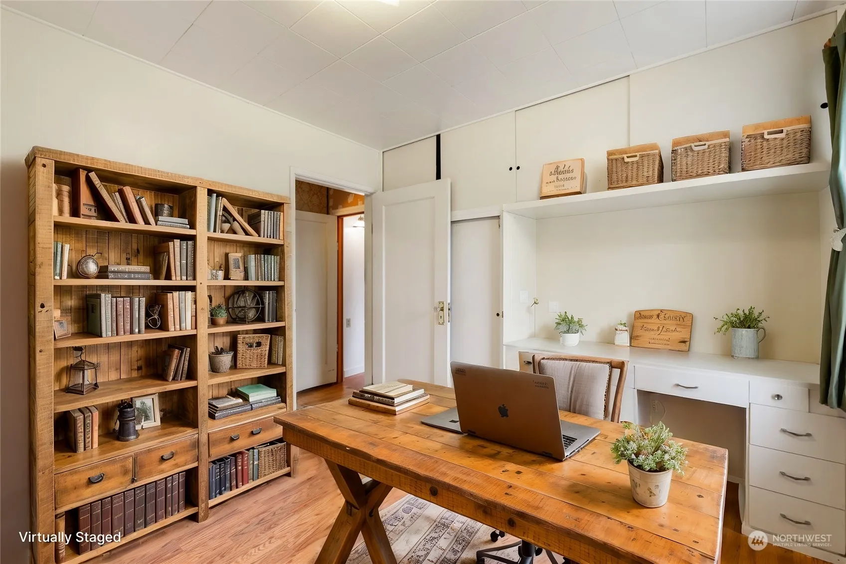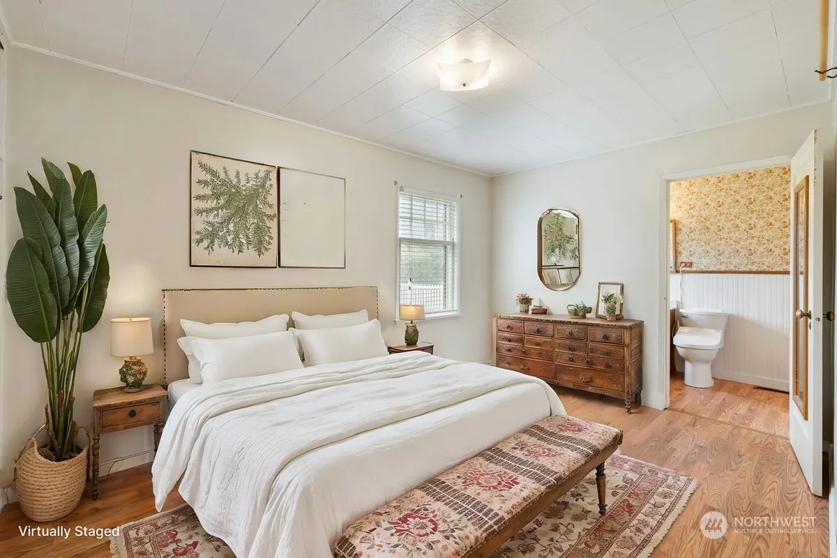 Timeless home, complete with a charming covered front porch that invites you to relax and enjoy the surroundings. Unique features include, stunning wooden ceiling beams, classic dormered windows, & built-in cabinetry, including a desk space perfect for work or study. Off the main hall, a quaint reading nook offers a quiet retreat. The beautiful hardwood staircase leads to a loft & two expansive bedrooms, each featuring double closets & vaulted ceilings that enhance the spacious feel. One enjoys a private terrace. The upstairs bathroom boasts a clawfoot tub for luxurious soaks. The well-designed mudroom/laundry & pantry is perfectly placed off the kitchen. A detached 2-car garage and a workshop with garage completes this delightful property.