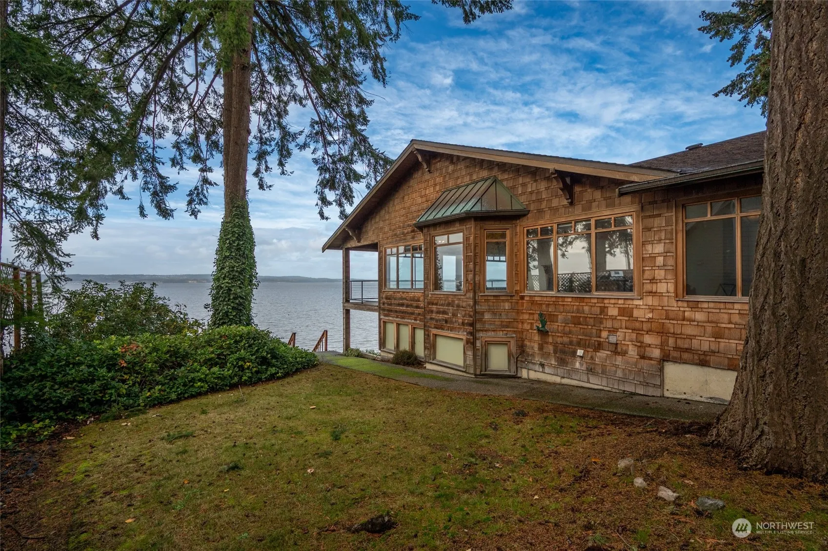 Stunning 91 feet of tidal waterfront with wonderful craftsman home. The property looks out to the west, has great views of Port Susan, Camano Island, and beautiful sunsets. Upon entry you are greeted by an open concept craftsman home with fir floors and beautiful inlays. Large windows grace the main floor to take advantage of the beautiful views. A covered deck runs the width of the home and is a great place to relax. French doors open up from both bedrooms to the patio and also take advantage of the water views. A stairway leads down to the bulkhead and also gives access to the beach. Outbuilding was converted into additional finished area with a 3/4 bath. This lot is wider than most in the area and has some of the best water views around.