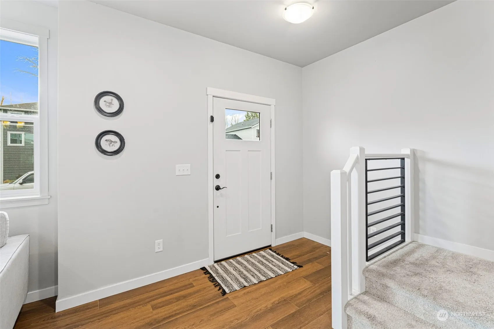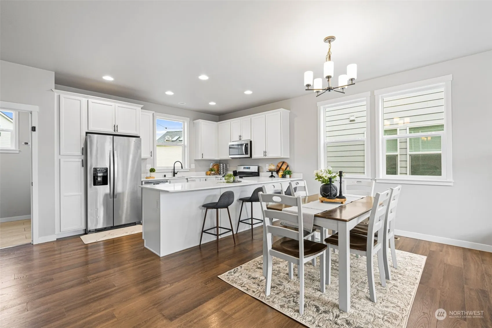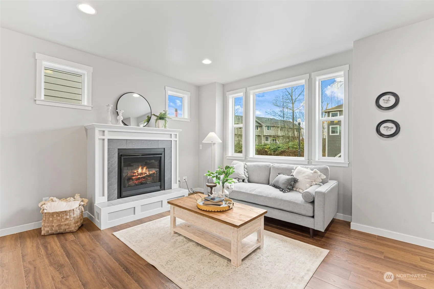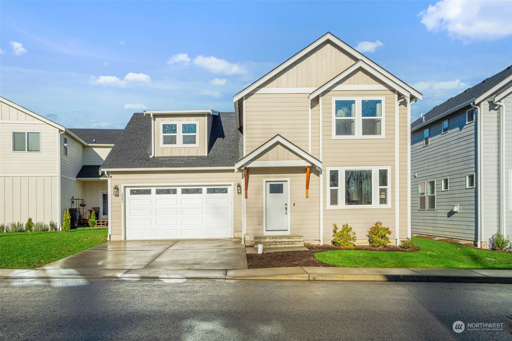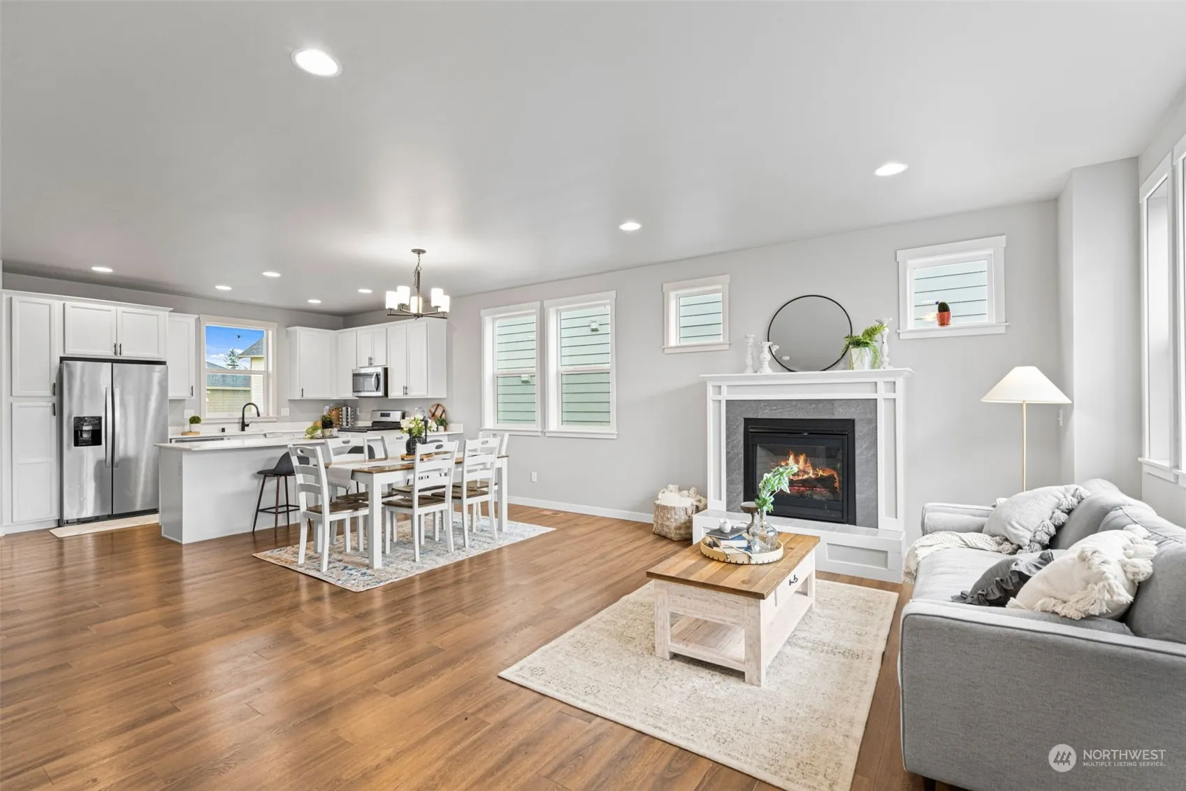 Nearly new 4-bedroom beauty. Open concept, gorgeous finishes, low maintenance–the trifecta! A striking raised tile hearth and gas fireplace create a focal point in the comfortably open main floor. The chef’s kitchen is a dream w/ tall white soft-close cabinets, sleek quartz countertops, & stainless steel appliances. Primary bedroom: dimmable lights and walk-in closet. The versatile 4th bedroom can sleep multiple people or operate as any sort of bonus room you need. Laundry room/mud room near the garage adds convenience to your daily routine, and the beautiful staircase railing adds an extra touch of luxury. Enjoy low-maintenance living with lawn care and a sprinkler system included in the community dues. This dead-end neighborhood is rad!