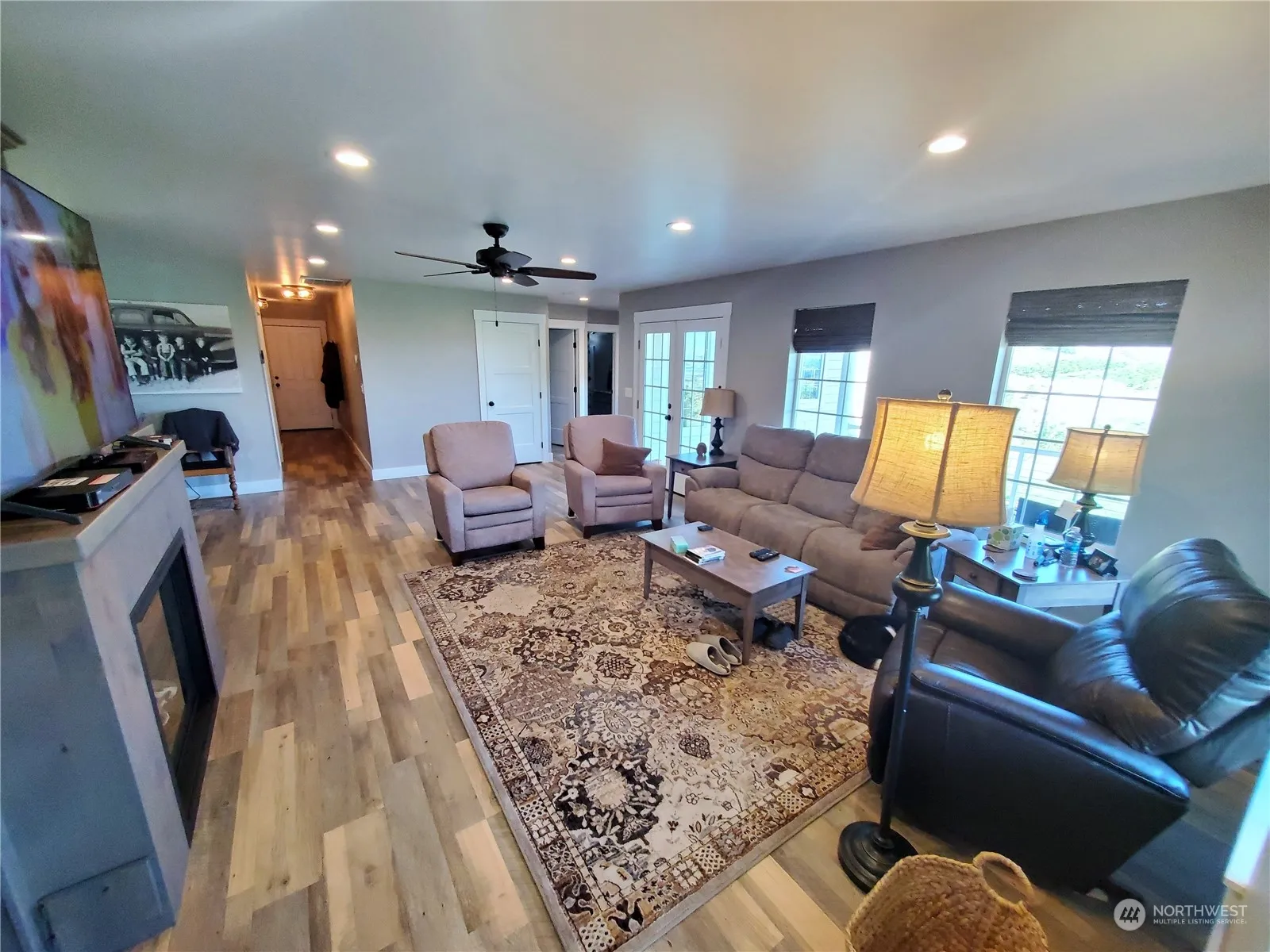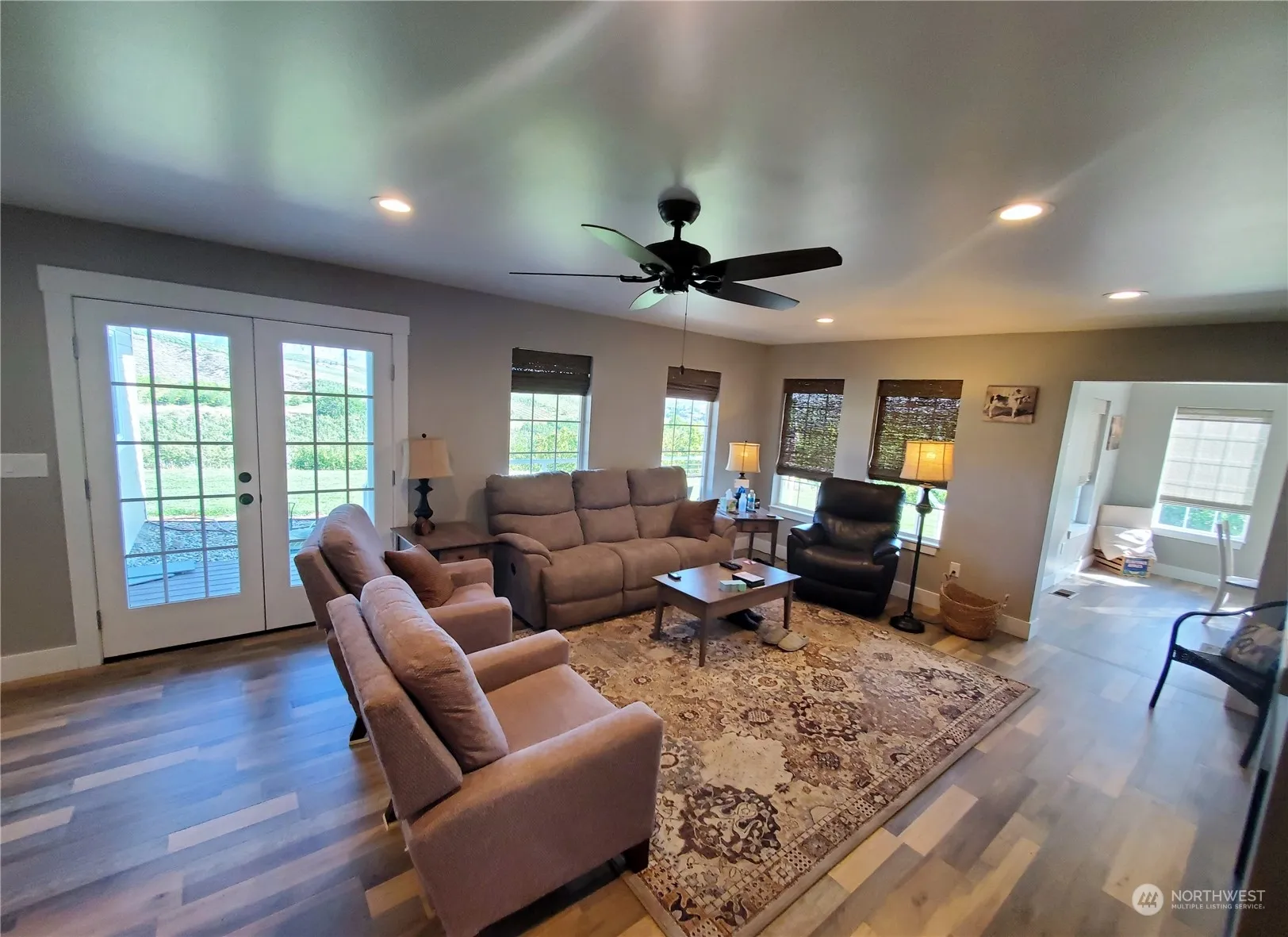 GREAT VALLEY VIEWS from this nearly brand NEW custom 3 bed/1.75 bath Tonasket home on 6.45 acres with approx 1 acre OTID irrigation. Spacious Living room w/propane FP, French doors leading to deck; open kitchen with Granite, all appliances, island w/rangetop, walk-in pantry, door out to second deck; huge dining room with lots of windows; separate office; primary suite with 3/4 bath with tile/granite; separate full bath with granite. Covered front and back composite decks; Rinnai on-demand hot water; heat pump, laminate floors throughout. Attached 2-car insulated garage. Large 3-bay equipment shed w/attached insulated shop, 12 ft overhead door. Peach/nectarine/apricot orchard-125 trees. Paved drive, shared well. $529,000 H-3620/MLS2311570