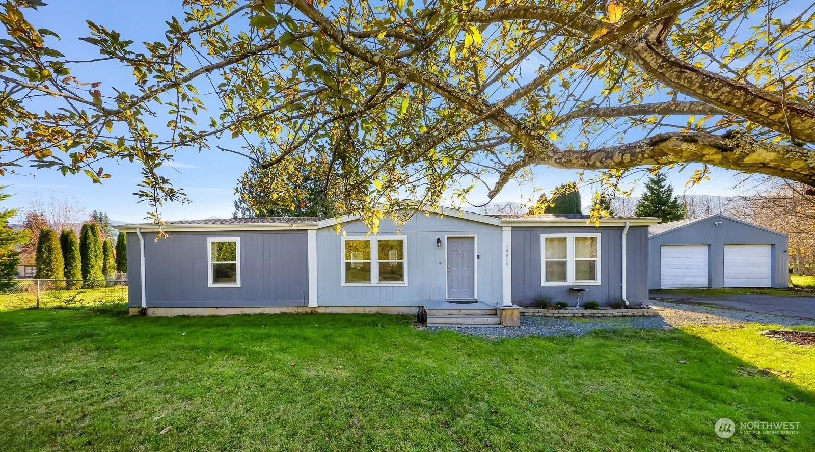 Enjoy peaceful living in this 3 bedroom, 2 bath home on a level, 1 acre lot. This newer manufactured home features 3 bedrooms, all with walk-in closets, including a spacious Primary w/private bathroom. Paved driveway leads up to large 2 bay shop, which provides ample room for hobbies and storage. Front yard w/fruit trees and huge back yard w/firepit area to relax and take in the surrounding views of mountains and nature. Located on a quiet, dead-end street in the community of Birdsview, this property is the perfect place enjoy country living.