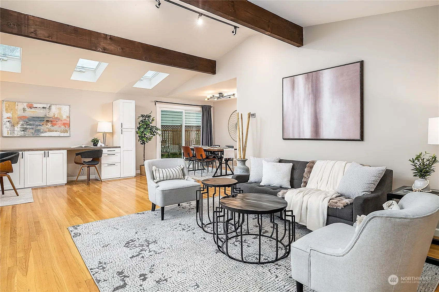 Stunning updated rambler in the desirable North Hill neighborhood of Des Moines! Enter into an inviting living area with vaulted ceilings, beautiful hardwood floors, & skylights that fill the space with natural light. Down the hall, find a newly renovated full bath & 3 impressive bedrooms, including a primary with en-suite bath. The kitchen boasts stainless steel appliances & an abundance of natural light, perfect for any chef. The outdoor areas are unmatched—enjoy a fully fenced front & back yard, perfect for gatherings, gardening, or play. A massive patio includes a hot tub & TV for year-round entertainment. New upgrades include a metal roof, hardie siding, furnace, heat pump w/ AC, hot water tank, carpet & storage shed! Don’t miss out!