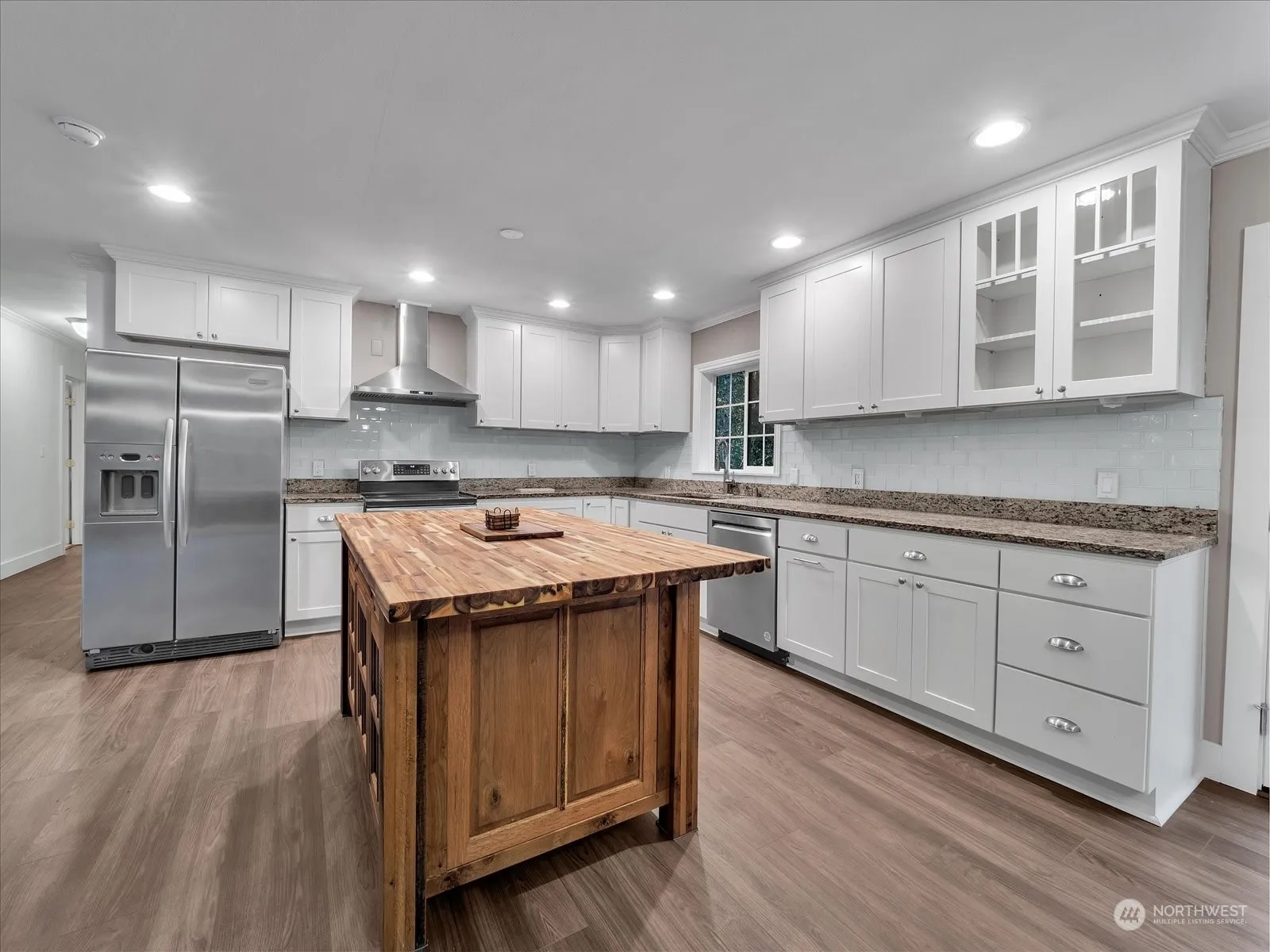 Welcome to Deer Haven! This beautifully updated 3-bedroom Grapeview home combines style and comfort in a serene, private setting. Enjoy a spacious great room with a cozy wood stove, two remodeled bathrooms (one with a freestanding soaking tub), and a bright kitchen featuring stainless steel appliances, granite countertops, white cabinetry, a butcher block island, and recessed lighting. New LVP flooring and fresh paint add a crisp, modern touch throughout. French doors lead to a tranquil backyard oasis. Plus, an attached shop and a separate shed complete this perfect retreat. Privacy, style, and relaxation await!