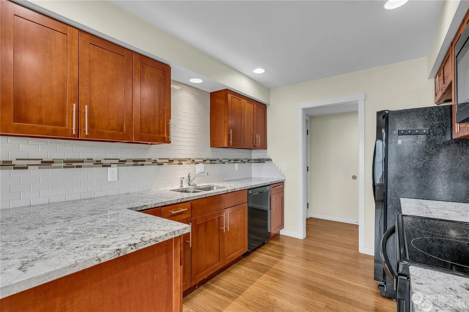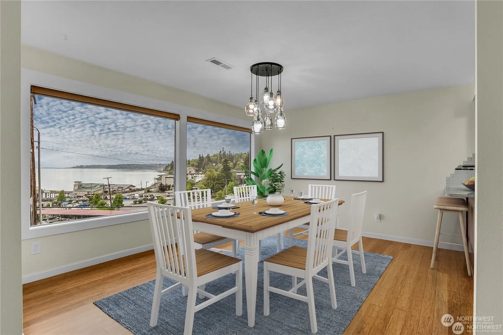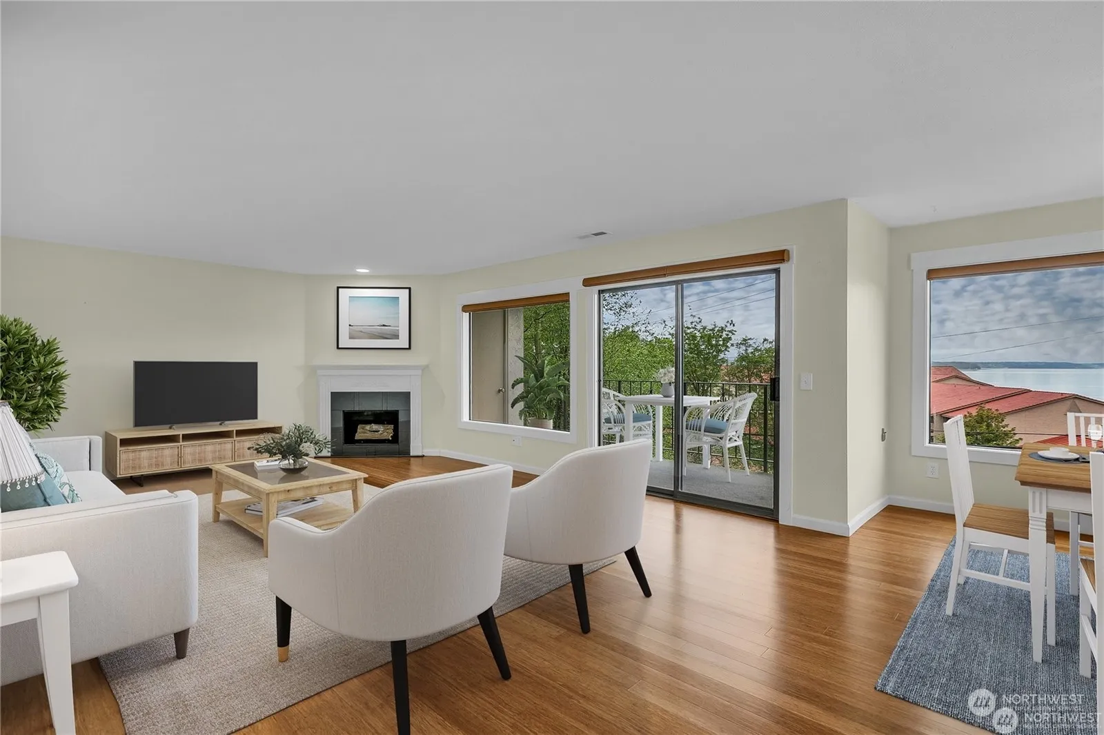 “RARE FIND END UNIT SURROUNDED BY FOREST LIKE GREENBELT W/ SWEEPING VIEW OF SOUND & OLYMPIC MOUNTAIN..” 3BR,2baths,2 tandem car garage,Open concept living ares w/ gas fireplace has large windows to capture the inspiring water view, sunsets, twinkling lights..Sliding glass door to large view deck, bamboo hardwood floor, updated kitchen w/ granite counter& tile back splash, custom cabinets,newer appliances,large primary room w/view of treed area, huge walk-in closet,2nd BR face the private forest like treed area w/ serene sound of creek running…3rd BR that also face private treed greenbelt can be used as office/den,laundry room, HOA due include: Water/Sewer/Garbage,Cable,Internet,Earth quake Ins, Common area maint, Lawn service..
