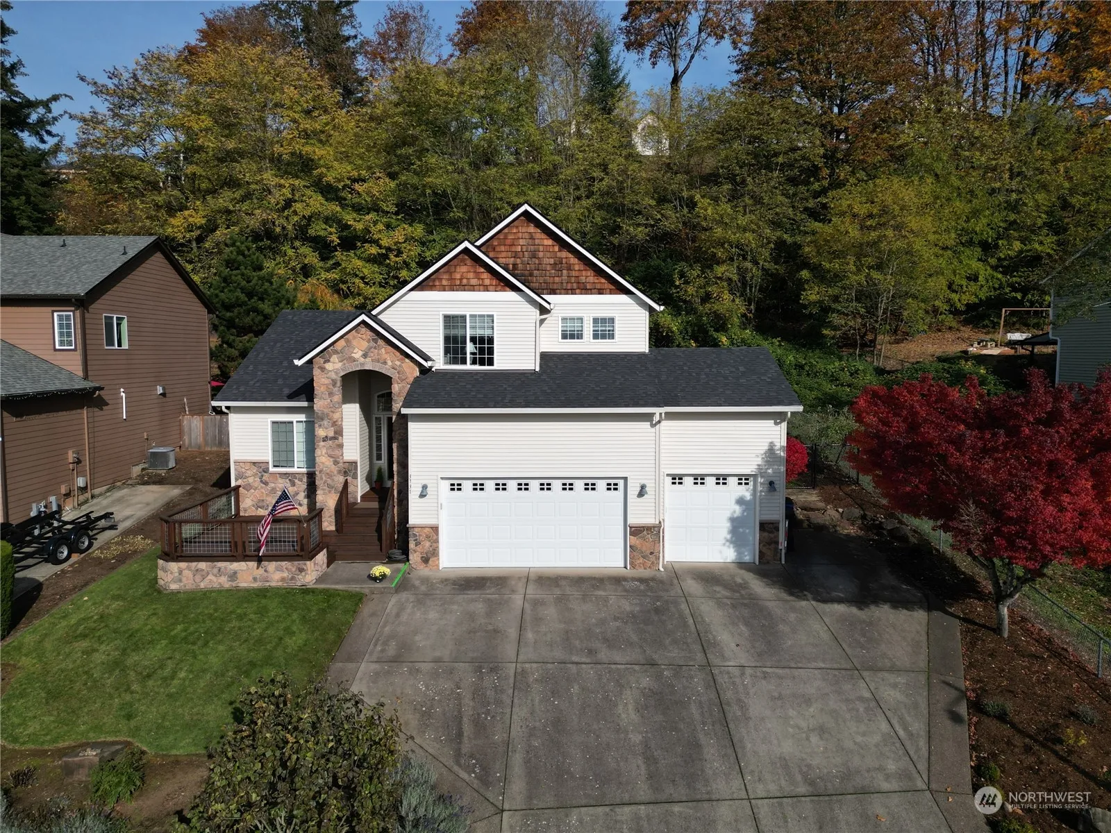 Discover your dream home on a spacious 0.44-acre lot, offering beautiful views and a private greenspace backdrop. Vaulted grand entry opens to a great room concept anchored by a cobblestone fireplace, complemented by hardwood floors and stylish brushed gold accents. The chef’s kitchen boasts quartz countertops, custom cabinetry, and an elegant tile backsplash. Generous windows and skylights fill the home with natural light. The office boasts French doors along with tranquil views. The primary suite features vaulted ceilings, a clawfoot tub overlooking the trees, a walk-in shower, and two additional bedrooms and a full bath. Outside, enjoy an expansive backyard surrounded by mature trees!