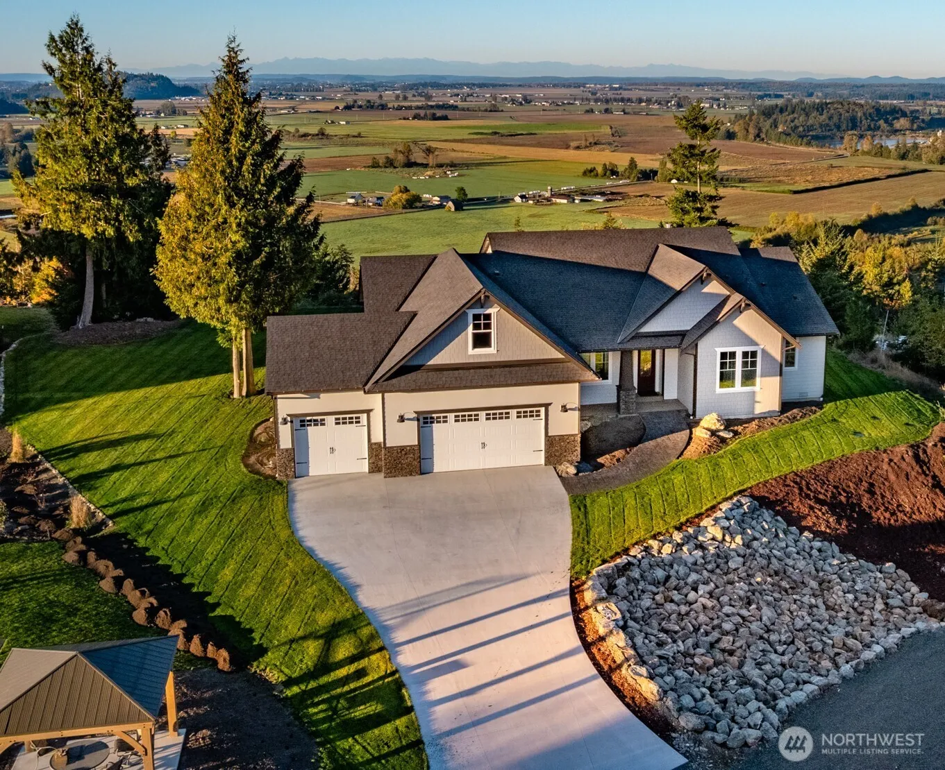 Brand new single-level home with spectacular views of the Cascades, Olympics, Skagit Valley, & San Juan Islands! Located in private gated community of Avalon Heights, this custom-designed home features 10FT ceiling heights, custom-made cabinetry throughout, magnificent vaulted great room, beautiful 14FT tall stone fireplace with stone hearth & mantel. An elegant 2742 SF home sitting on a level 1-acre with a huge covered patio facing sweeping views to the south & west. Flooring high-quality WPC Plank & carpet. Features 4 bedrooms plus large bonus room. Extra large 3-car garage. Great location only 7 minutes to I-5, 15 min to Mt Vernon, & 25 min to Bellingham. NOTE: HOA dues include water bill.